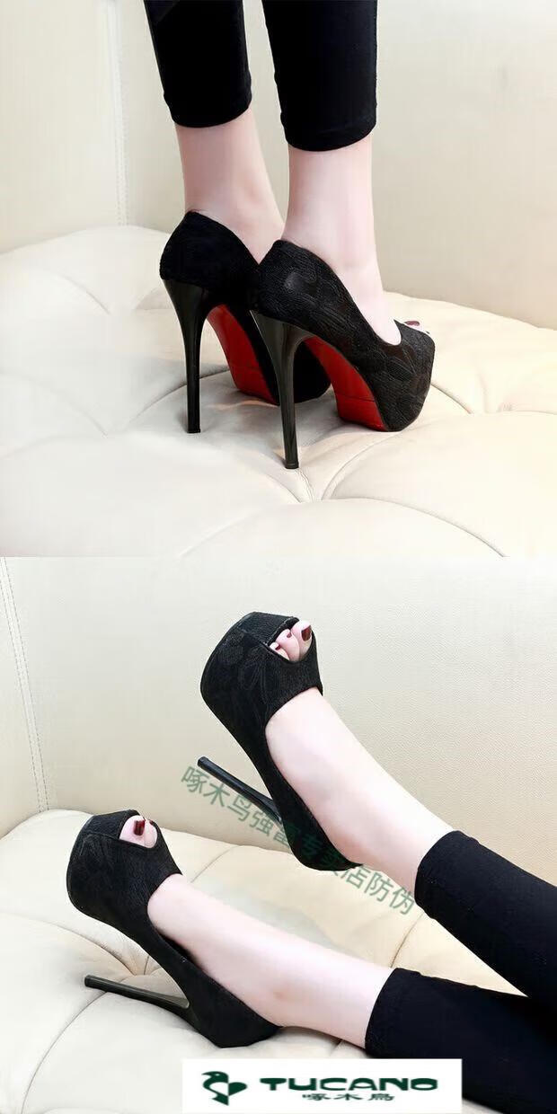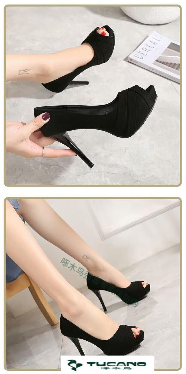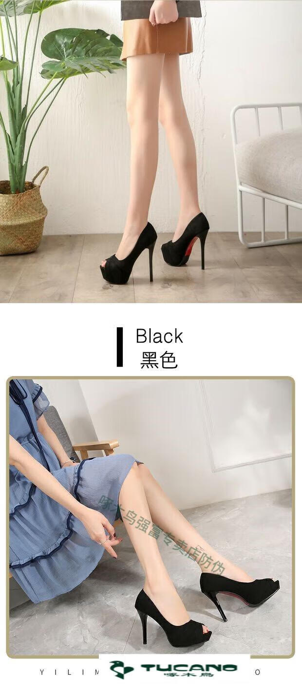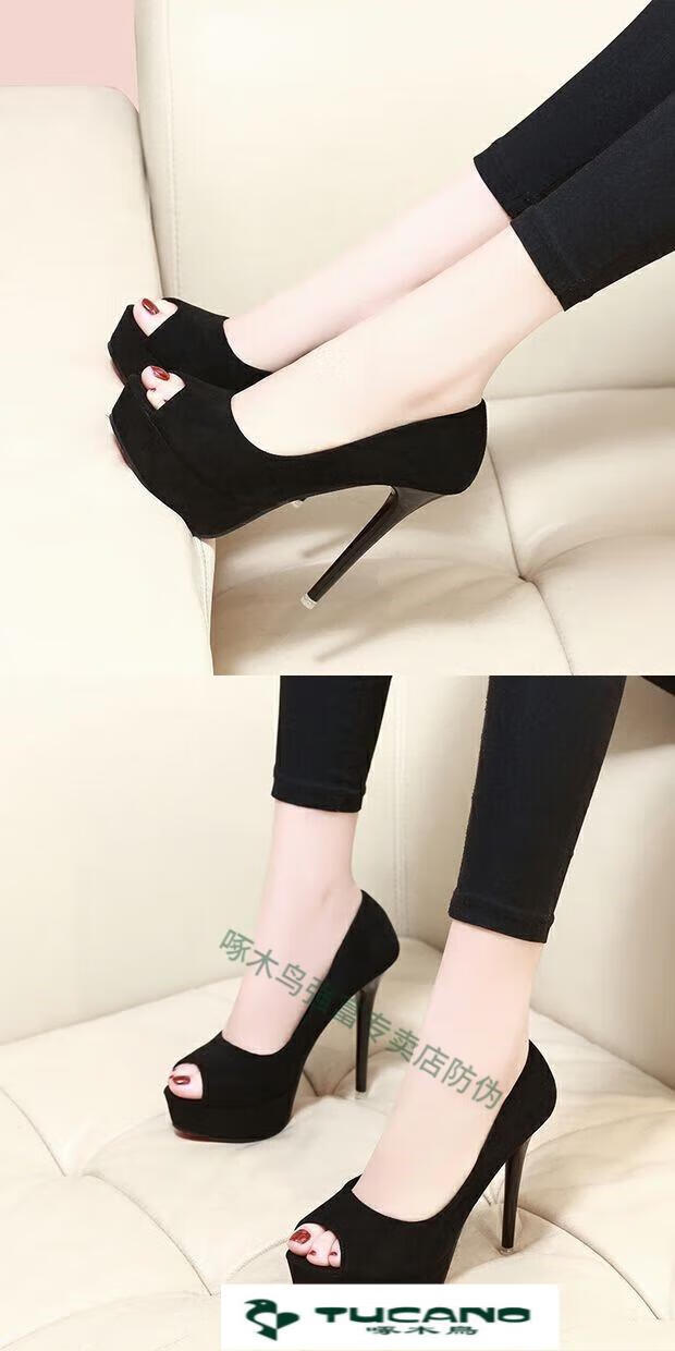 Woodpecker spring and autumn women's shoes super high heel 12cm nightclub waterproof platform sexy stiletto black versatile suede small size fish mouth single shoes black 10cm lace style 37