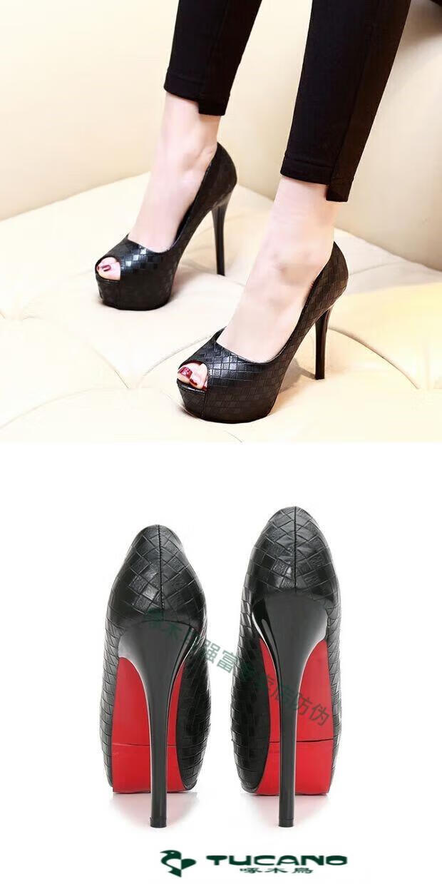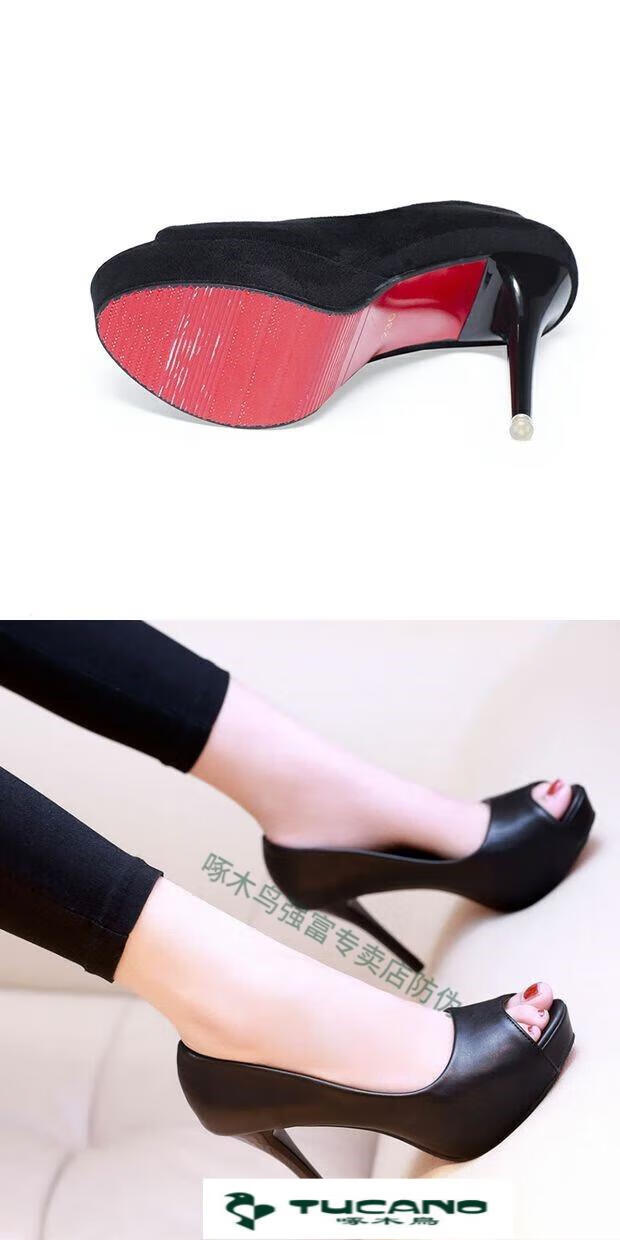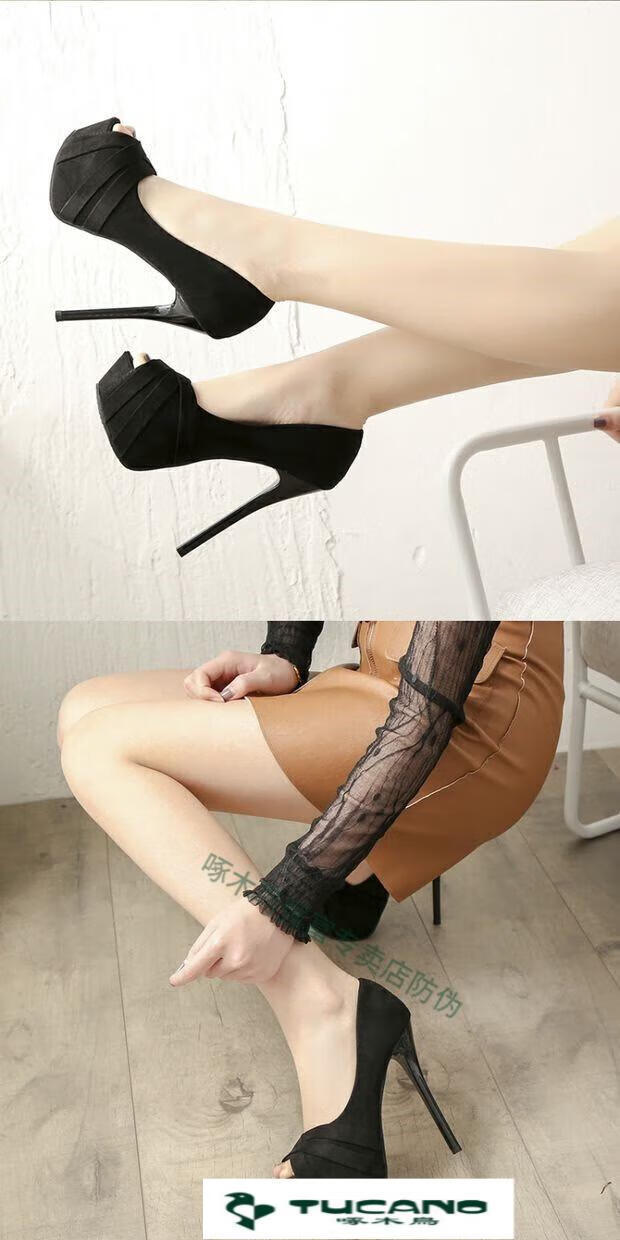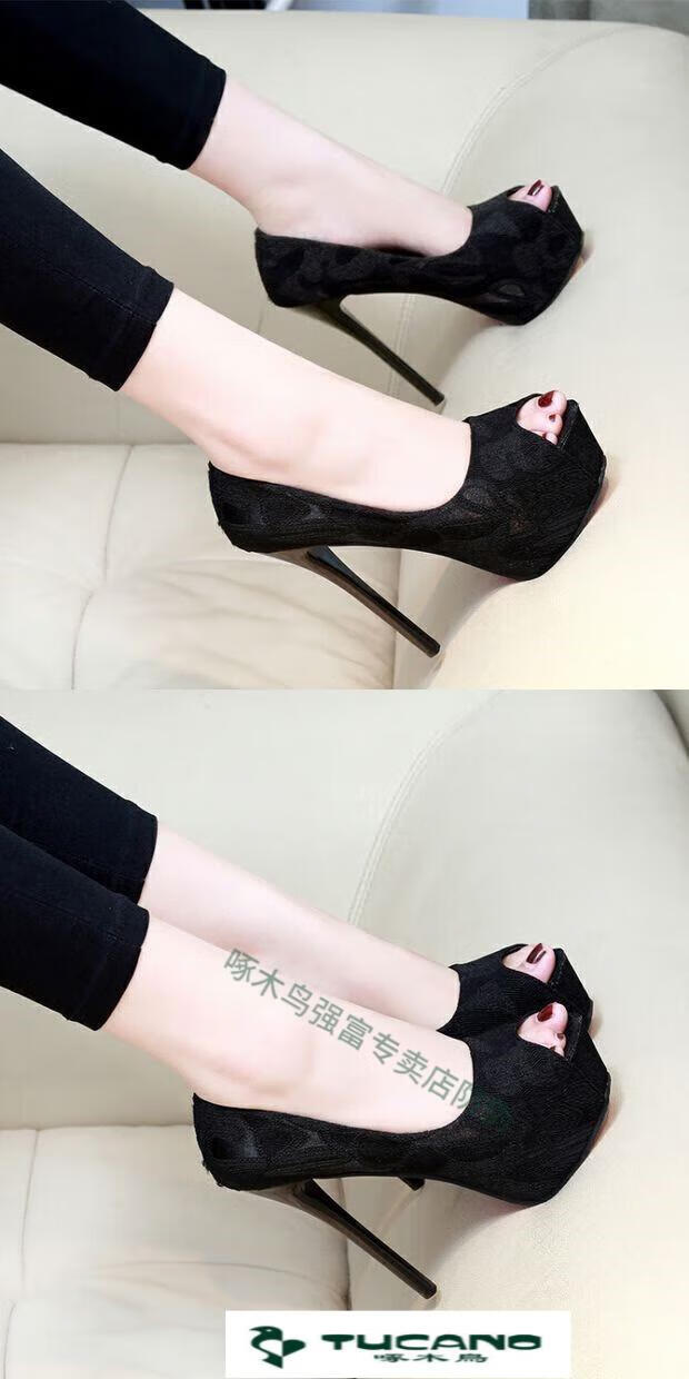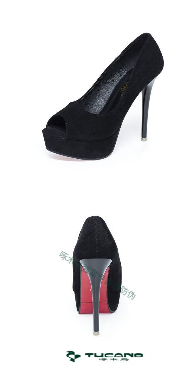 Woodpecker spring and autumn women's shoes super high heel 12cm nightclub waterproof platform sexy stiletto black versatile suede small size fish mouth single shoes black 10cm lace style 37