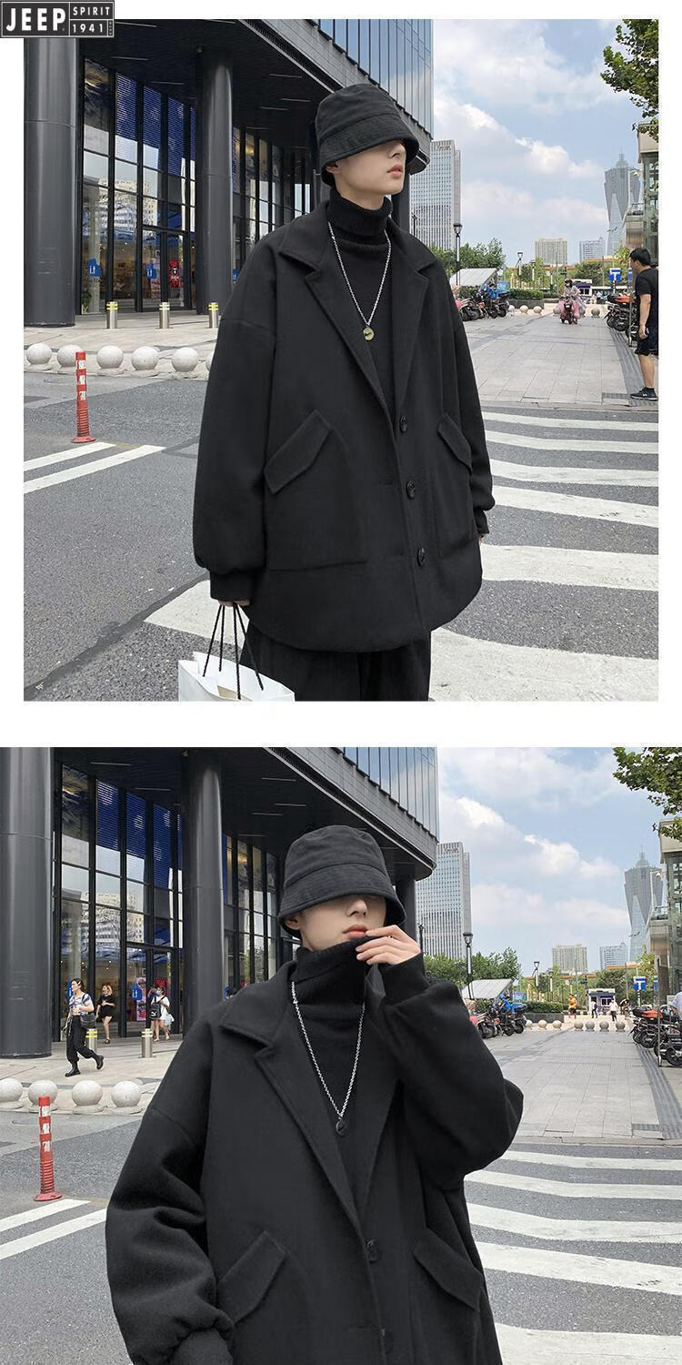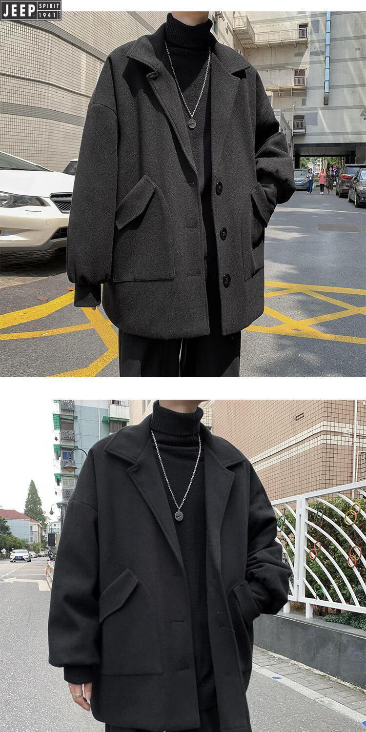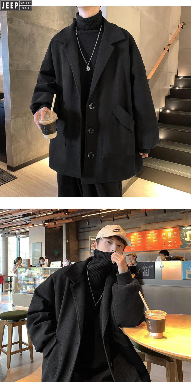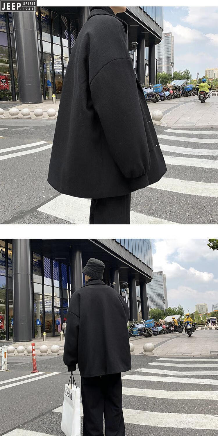 JEEP Men's Casual Windbreaker Spring and Autumn British Style Short Woolen Jacket Trendy Men Youth Loose and Handsome Brand Men's Clothing Black XL Follow the store for priority delivery