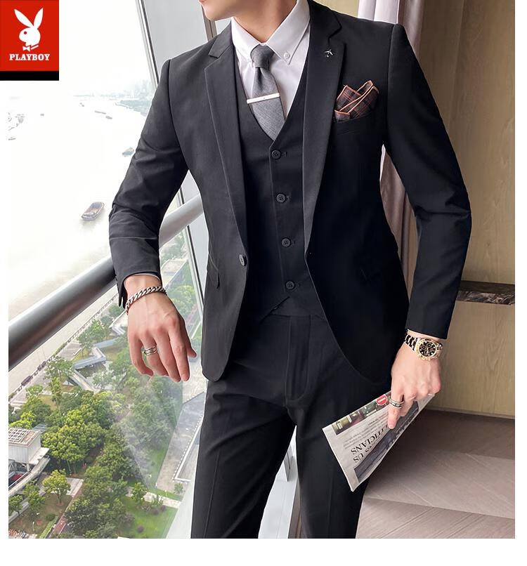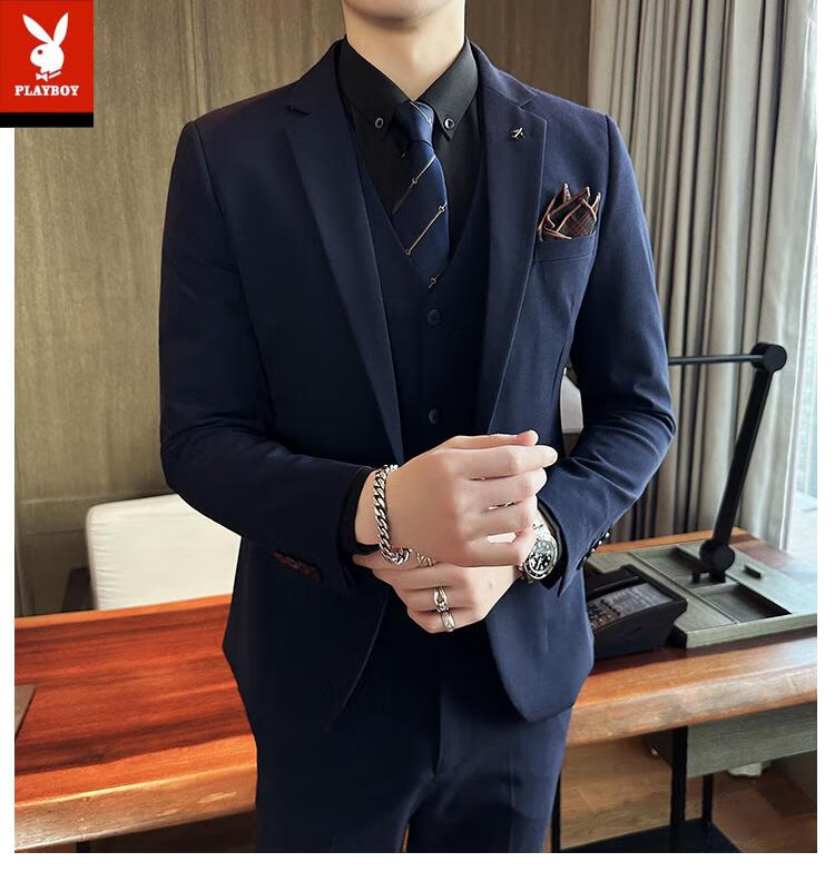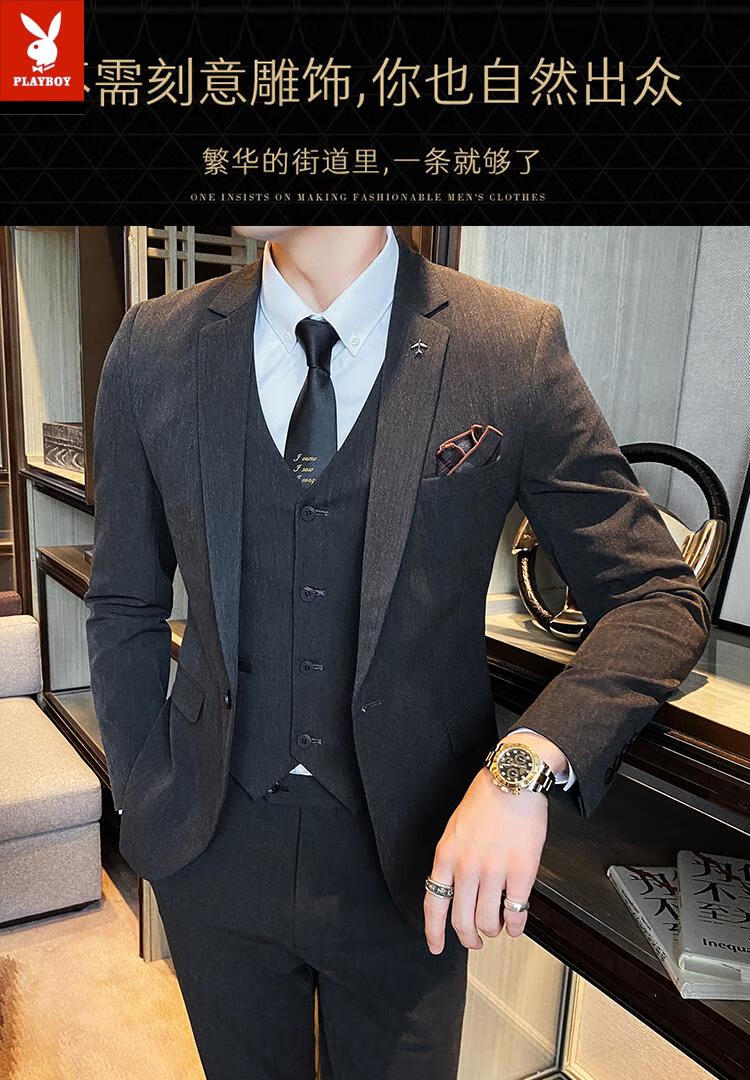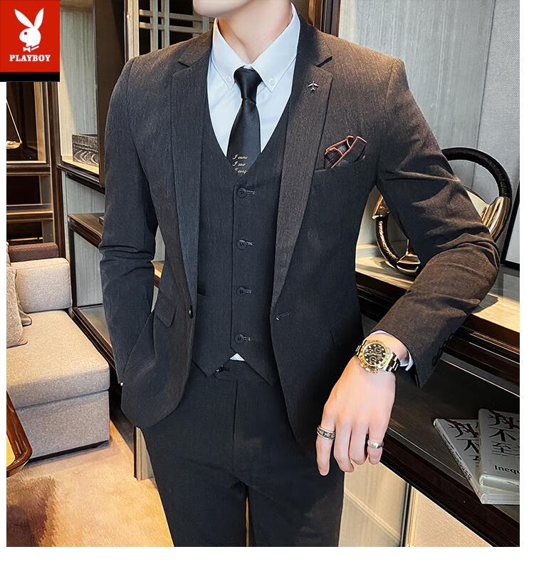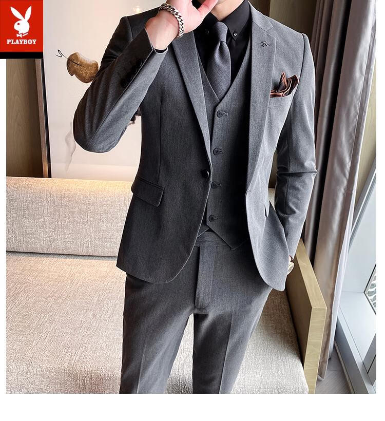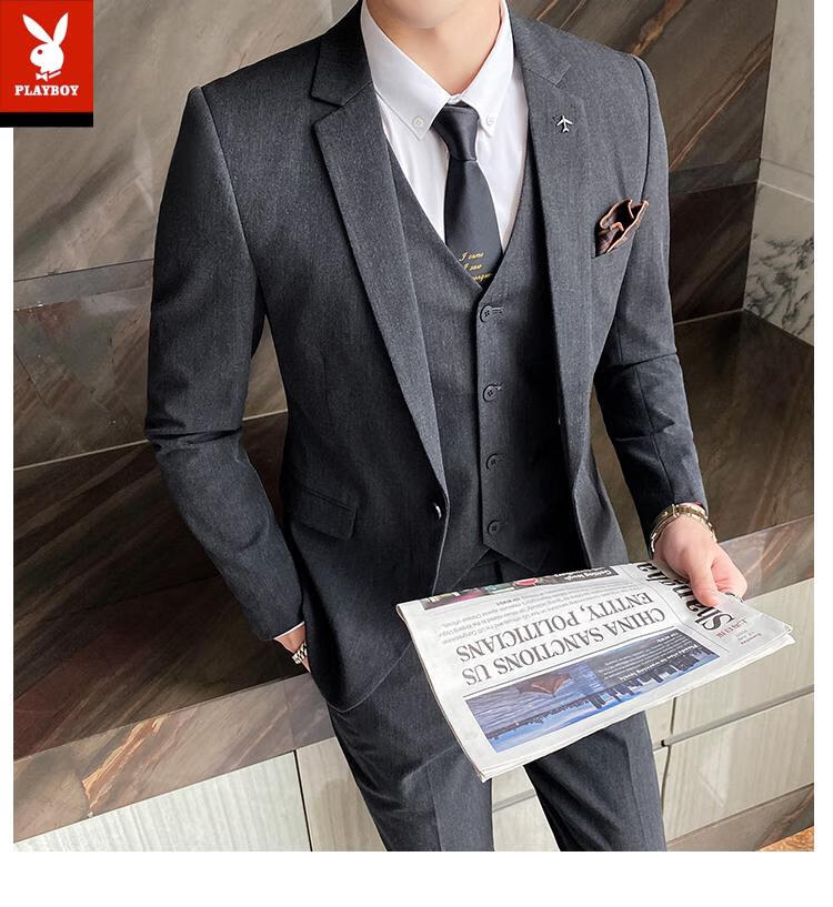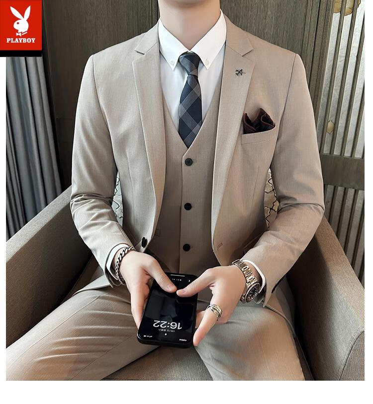 Playboy men's suit suit, high-end professional wear, trendy Korean version, slim fit, host, groom, wedding dress, casual jacket, khaki suit + trousers + vest, white lining 3XL, suitable for 155-160Jin Jin equals 0.5 kg