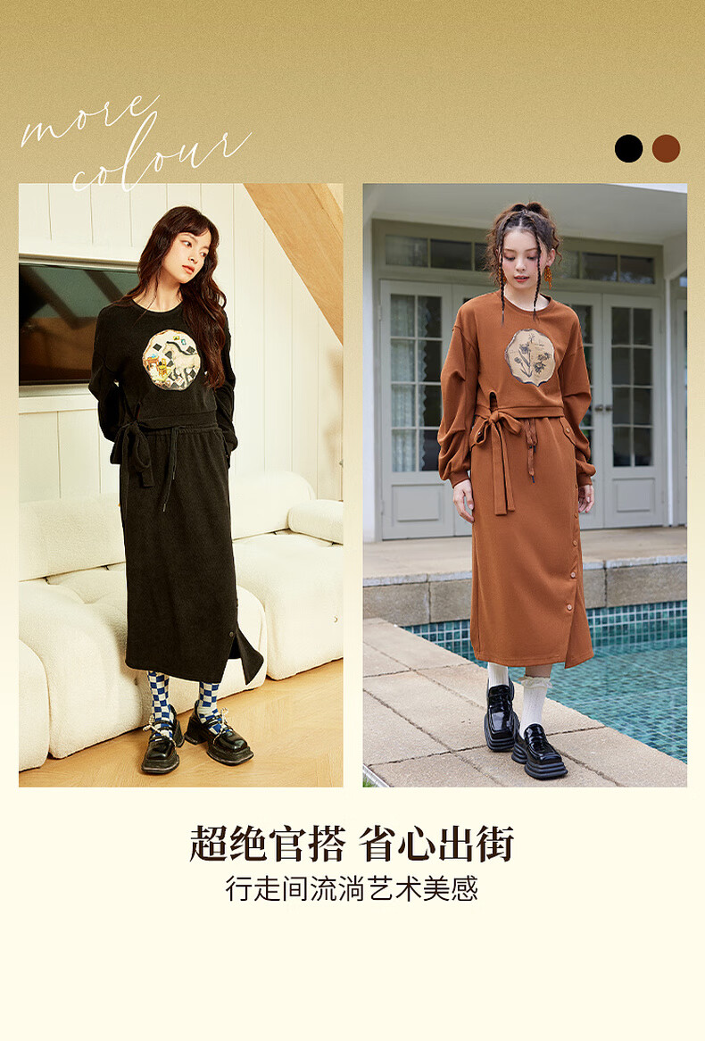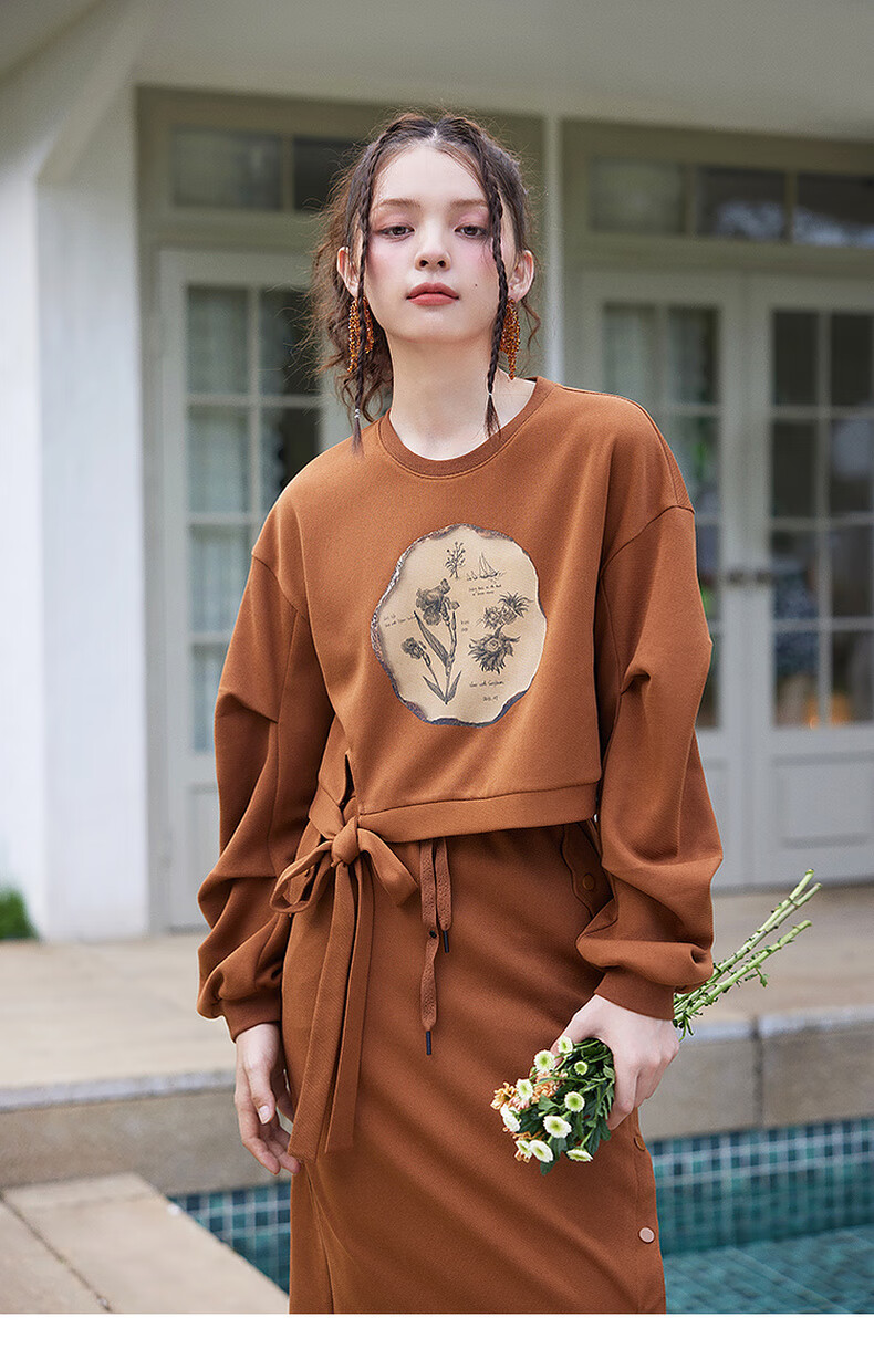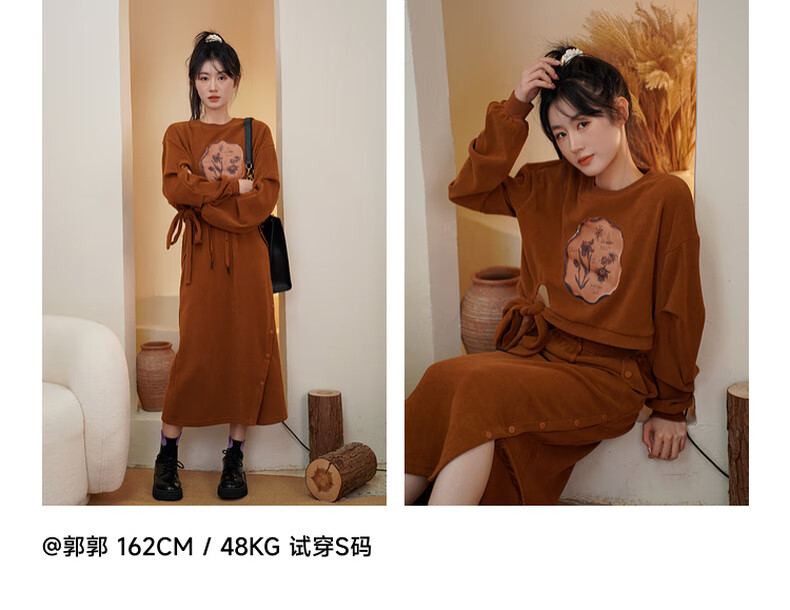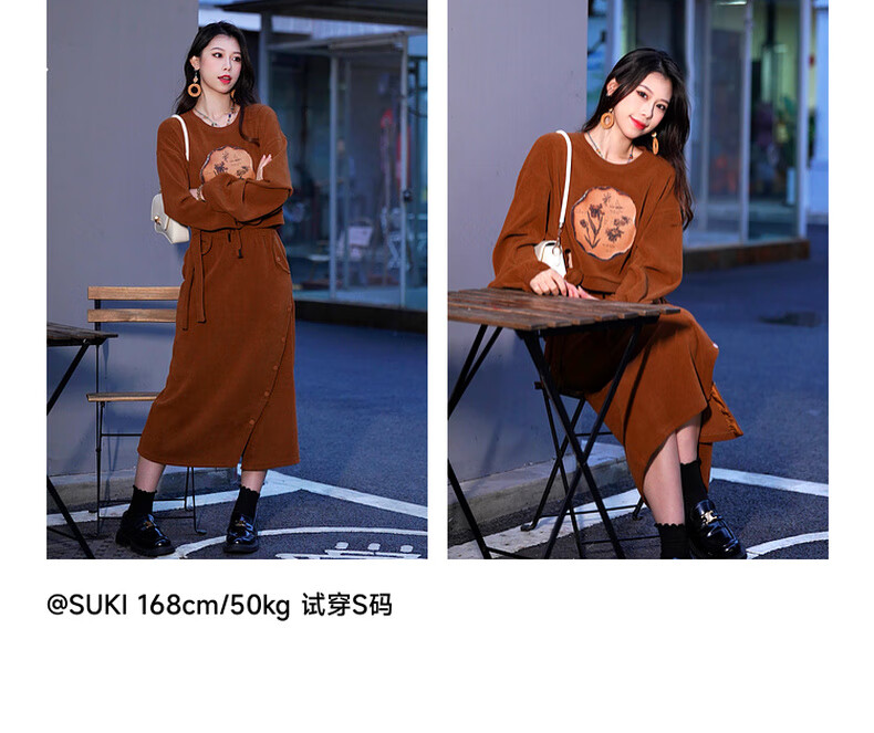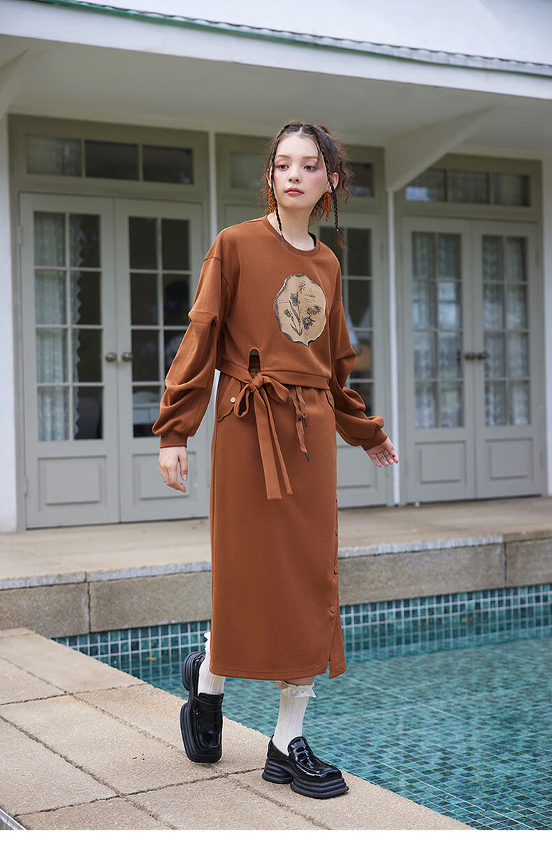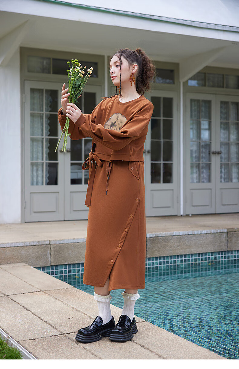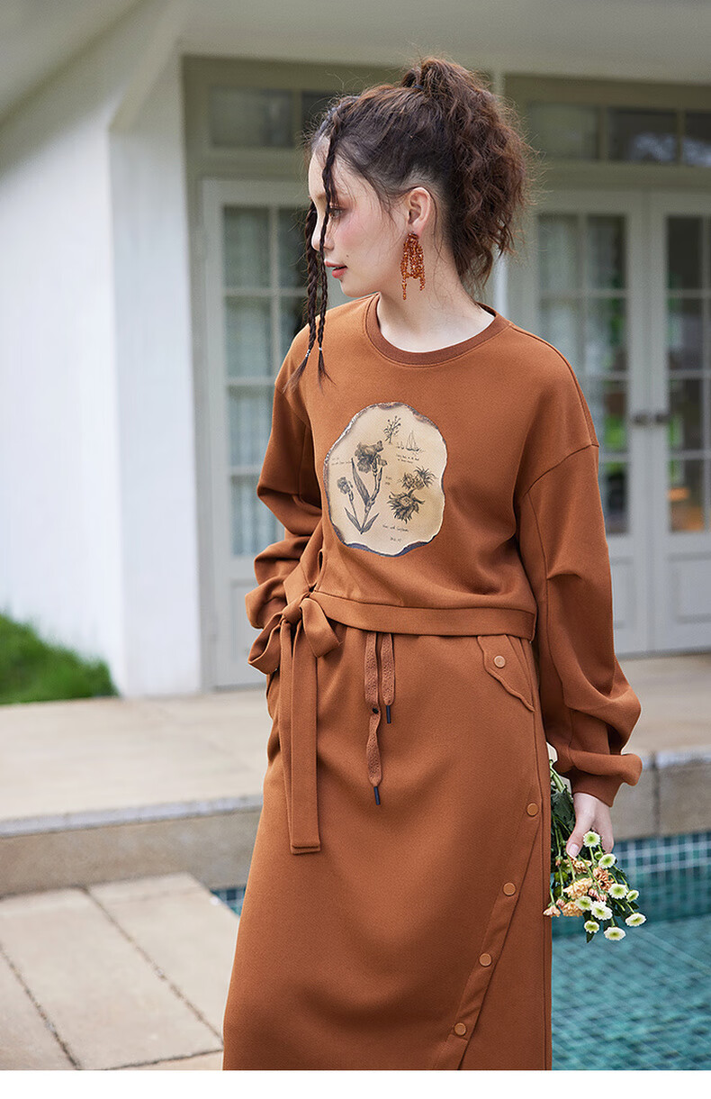 Two or Three Things Chixia Yuhui 2025 Spring New Retro Literary Print Pattern Strap Design Sweater Suit Brown S
