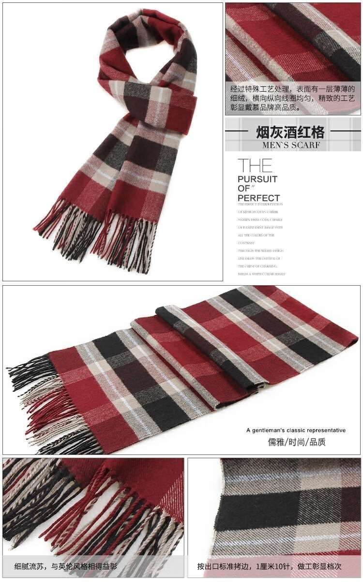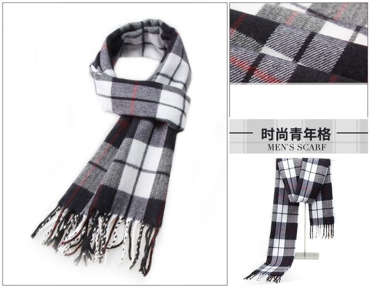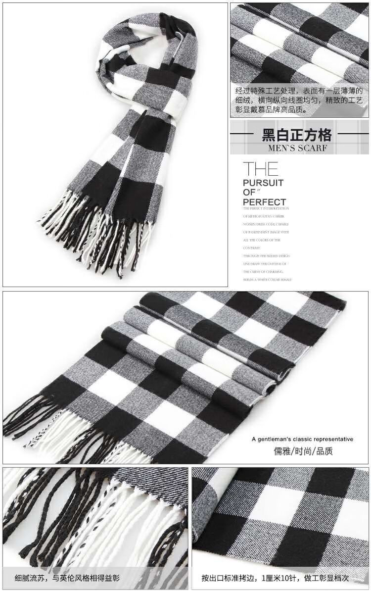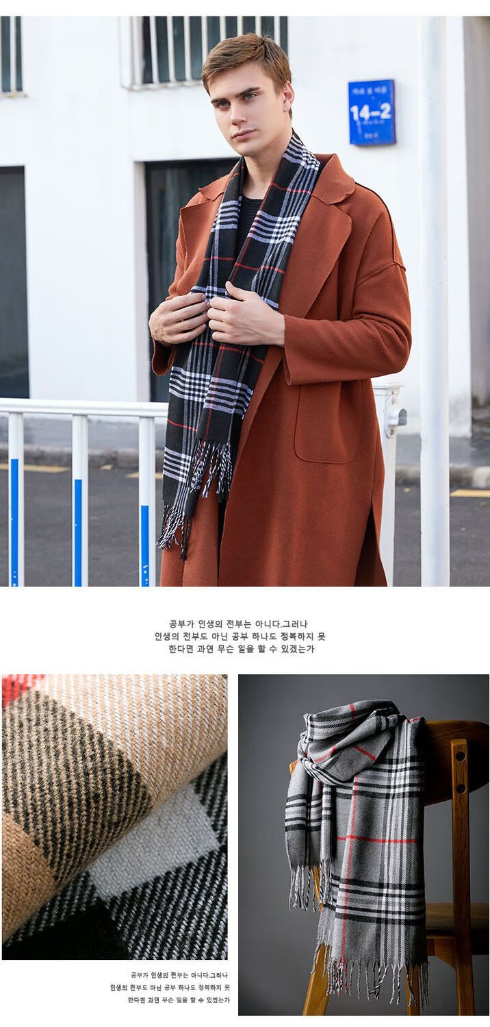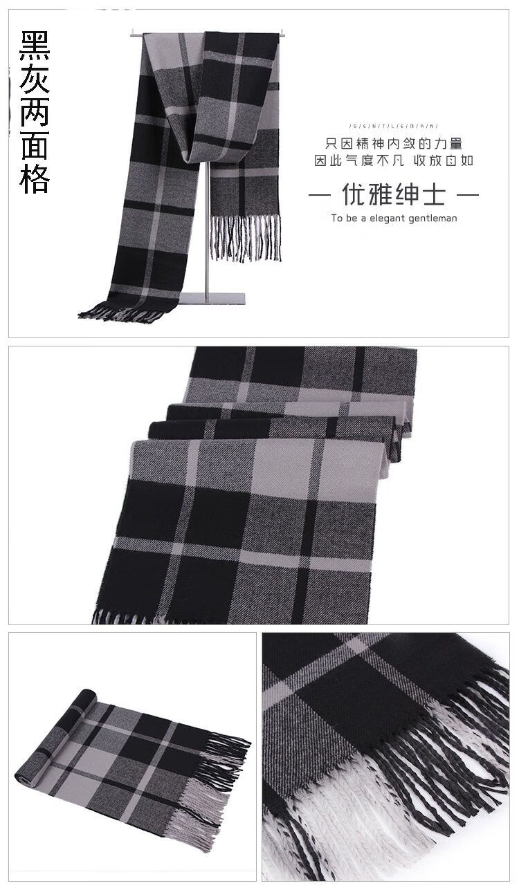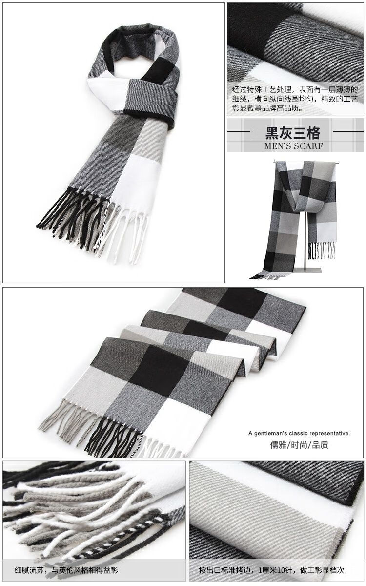 Bijinger men's handkerchief scarf for middle-aged and elderly men autumn and winter warm scarf long thickened high-end imitation sheep fashion black gray (large grid)