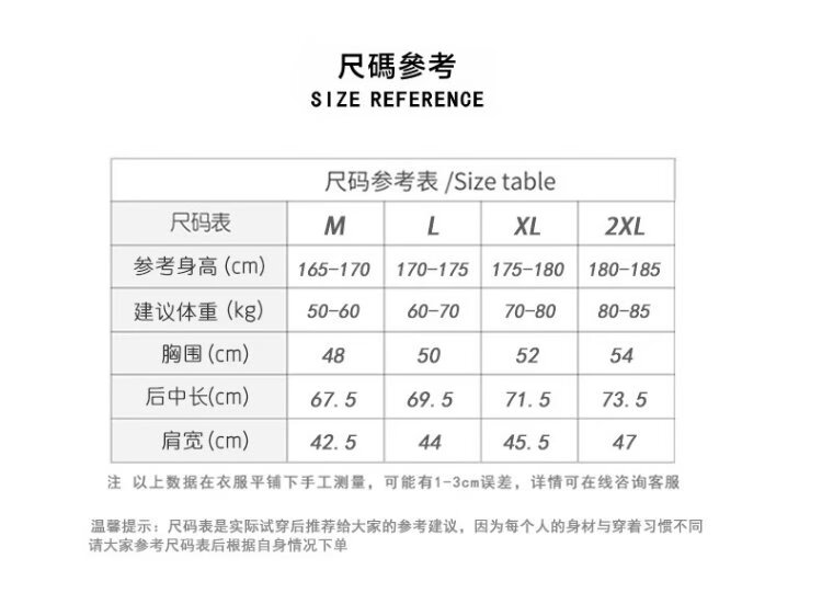 China (cm) 165 / 88-90 170 / 96-98 175 / 108-110 180 / 118-122 185 / 126-130