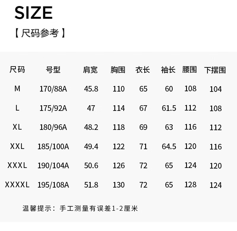 China (cm) 160-165/84-86 165-170 / 88-90 167-172 / 92-96 168-173 / 98-102 170-176 / 106-110