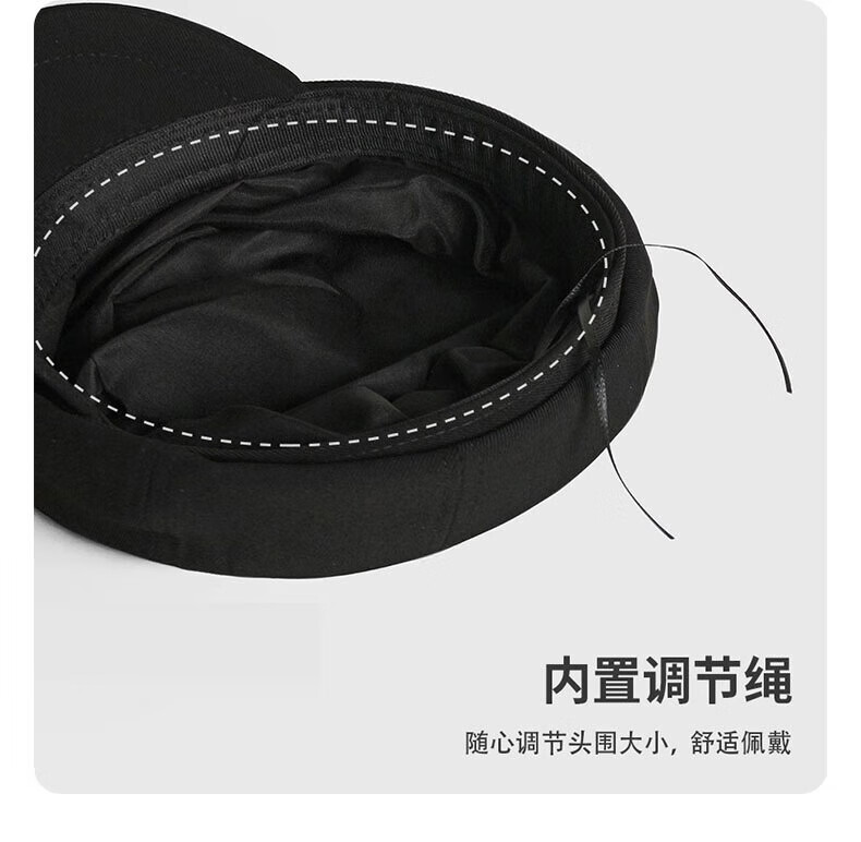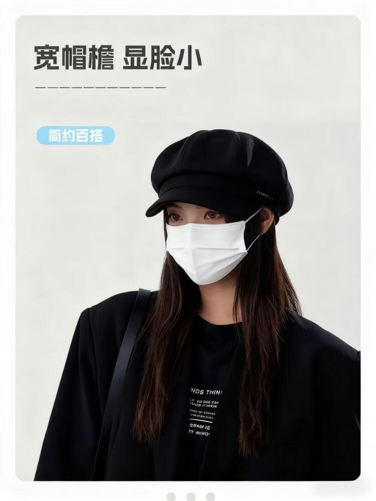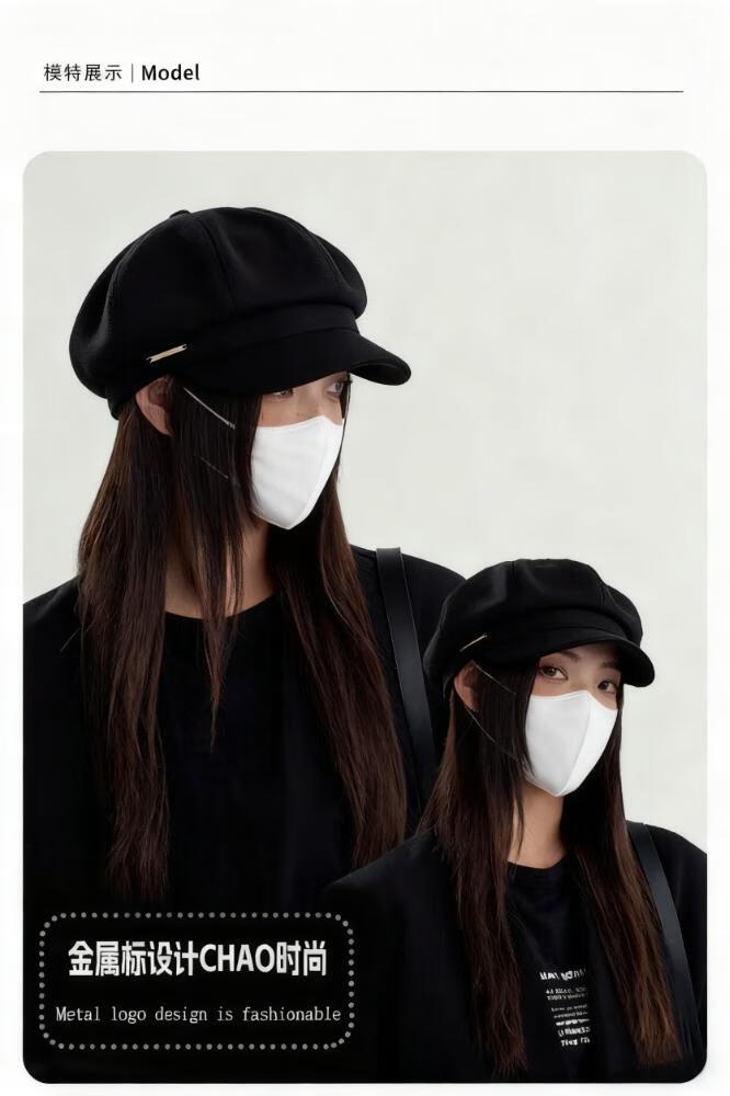 Bo Na Ling beret women's autumn and winter octagonal hat versatile black big head circumference showing face small retro duck tongue newsboy hat metal label beret black