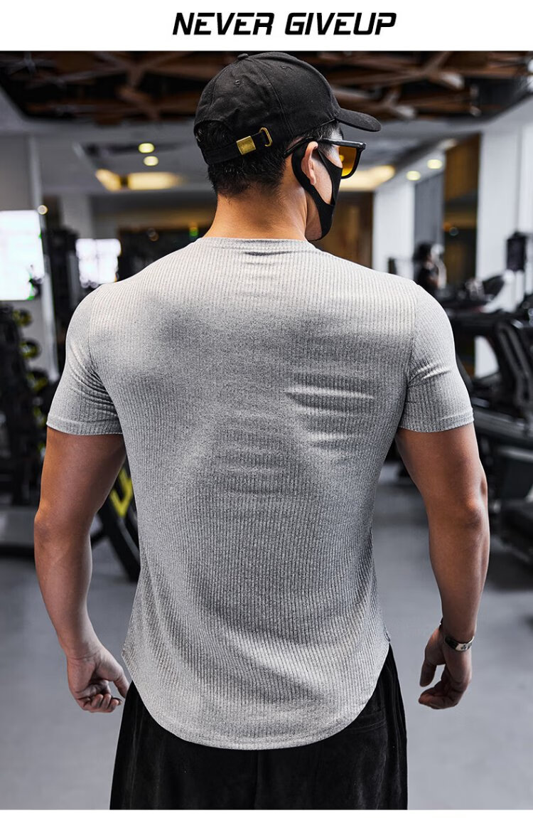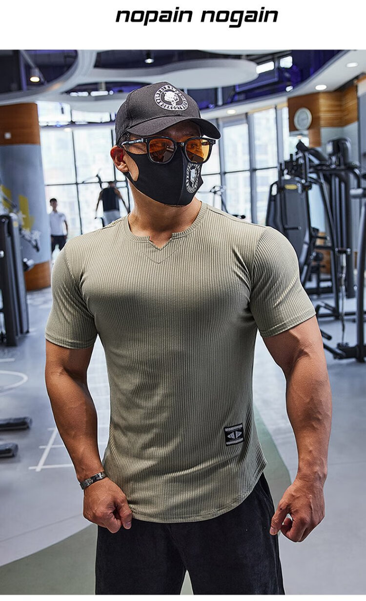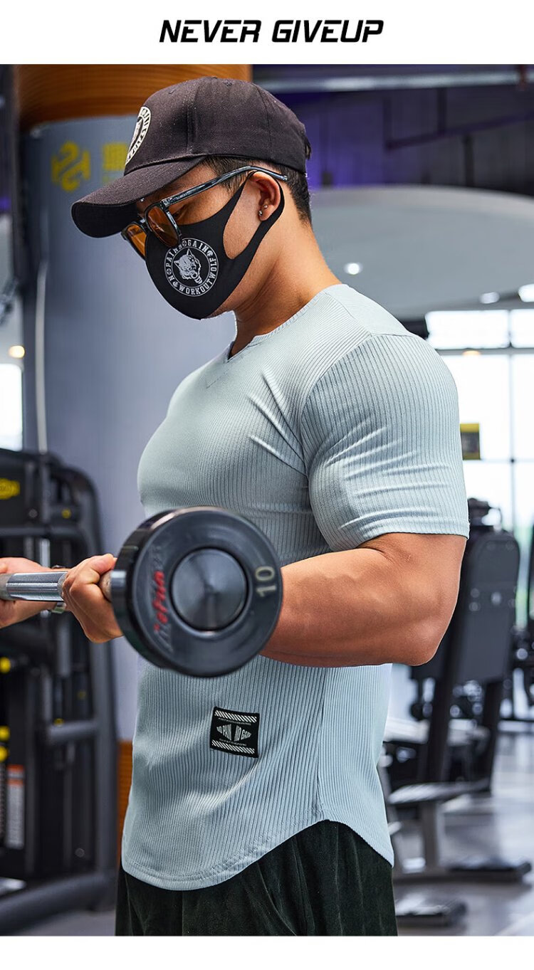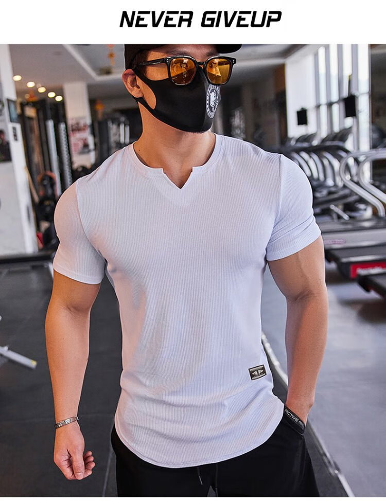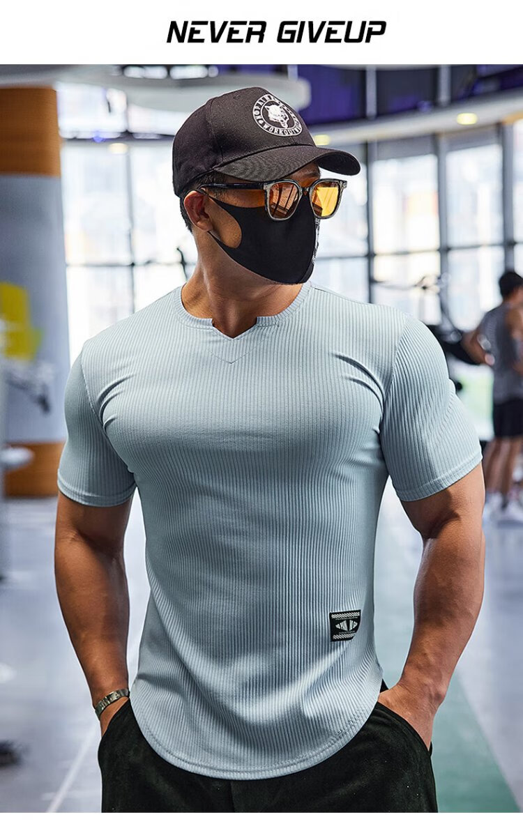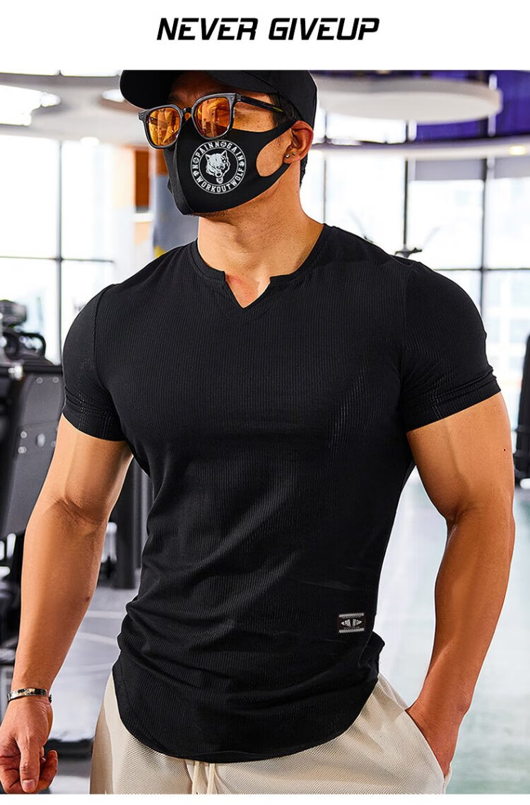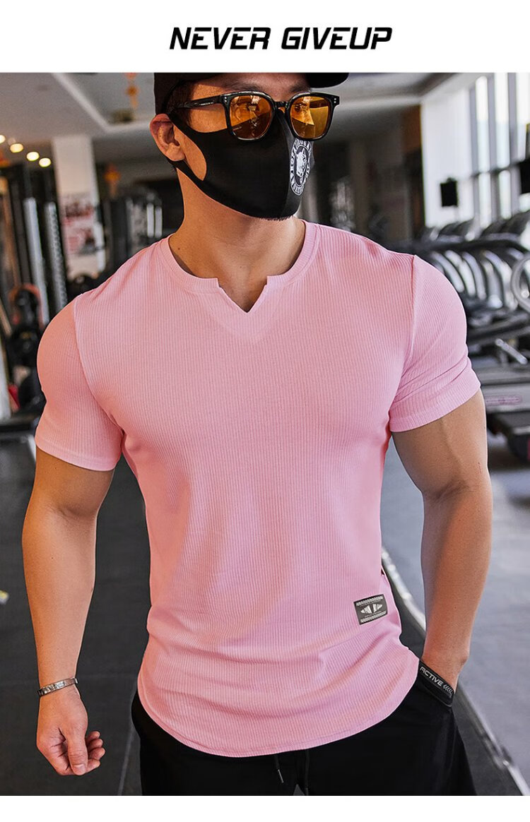 Lutielang V-neck fitness clothes coach tights quick-drying elastic men's muscle training sports short-sleeved T-shirt summer pink M