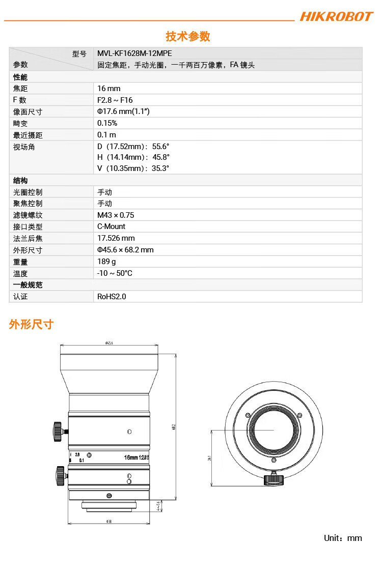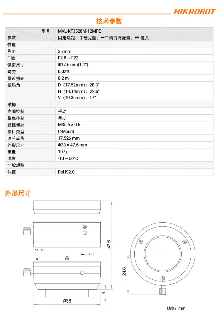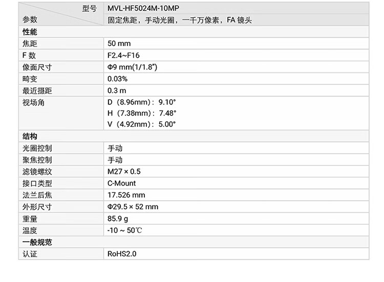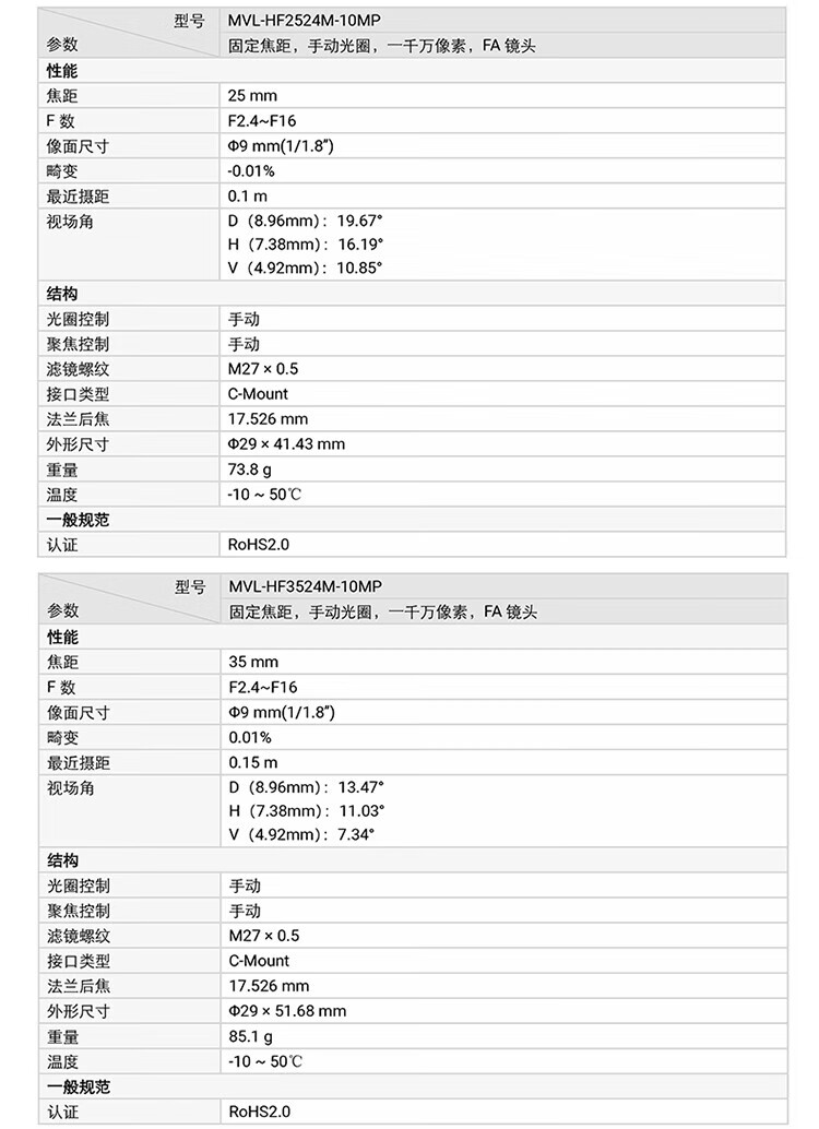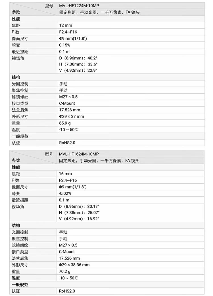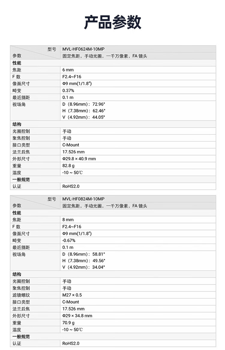 Official flag of Hikvision Robot HIKROBOT industrial camera Fa lens HD pixel CMOS visual inspection lens low distortion high resolution high phase contrast 6mm fixed focus MVL-HF0624M-10MP