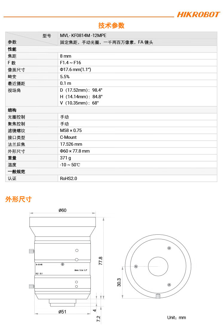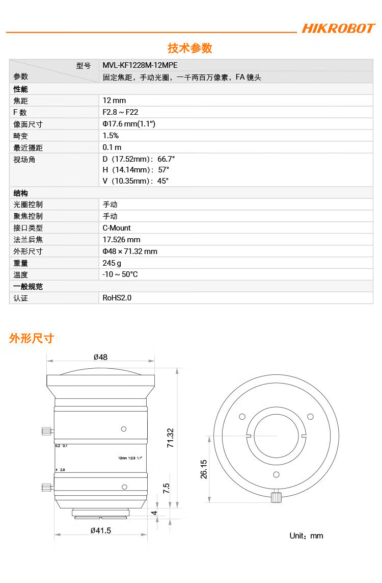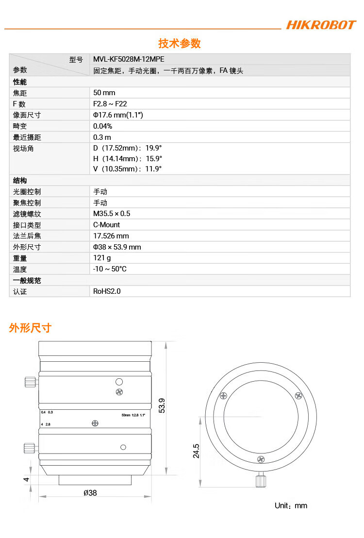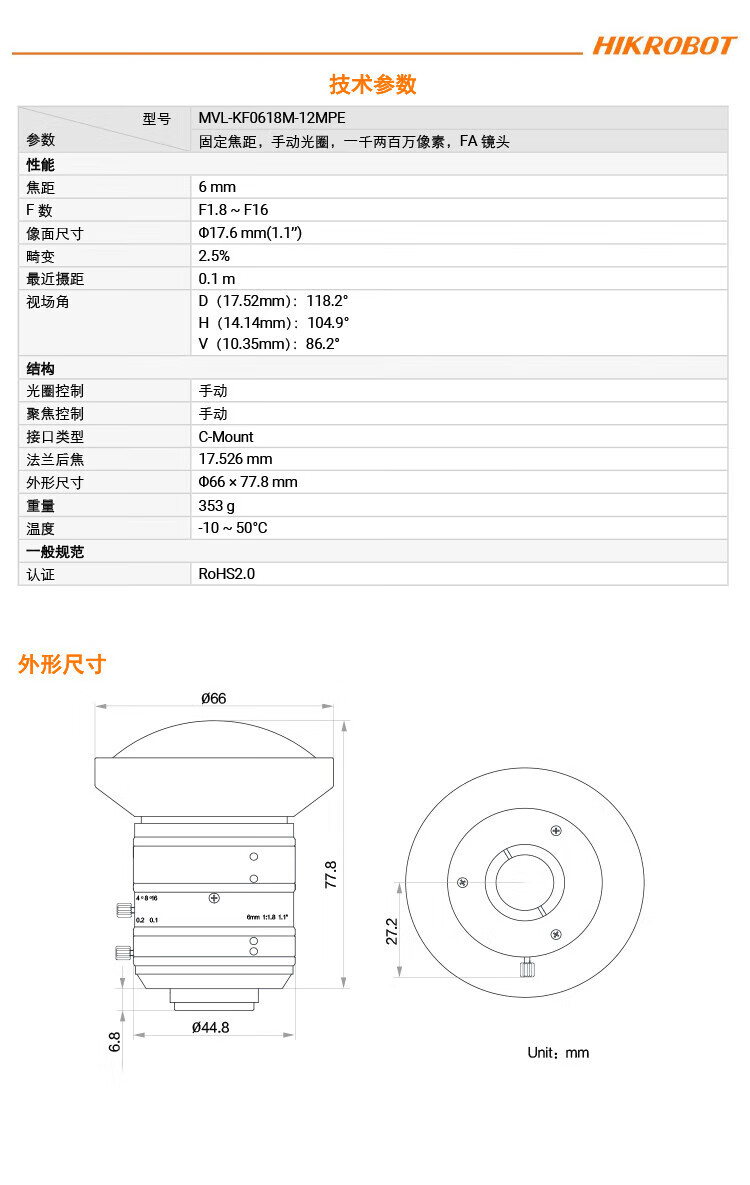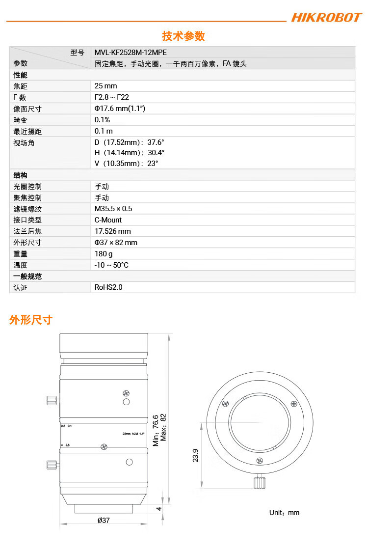 Official flag of Hikvision Robot HIKROBOT industrial camera Fa lens HD pixel CMOS visual inspection lens low distortion high resolution high phase contrast 6mm fixed focus MVL-HF0624M-10MP