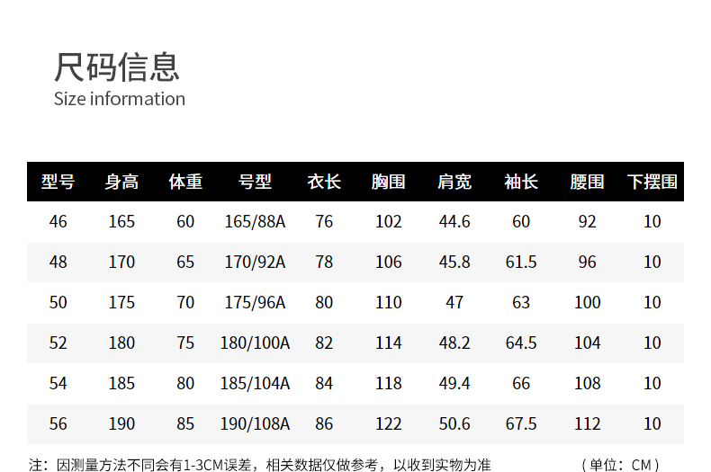 China (cm) 160-165/84-86 165-170 / 88-90 167-172 / 92-96 168-173 / 98-102 170-176 / 106-110