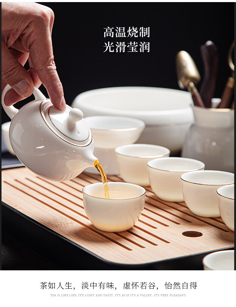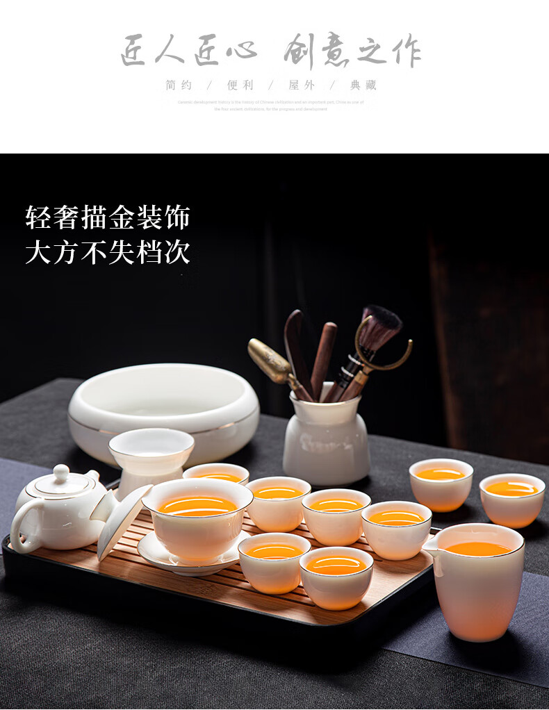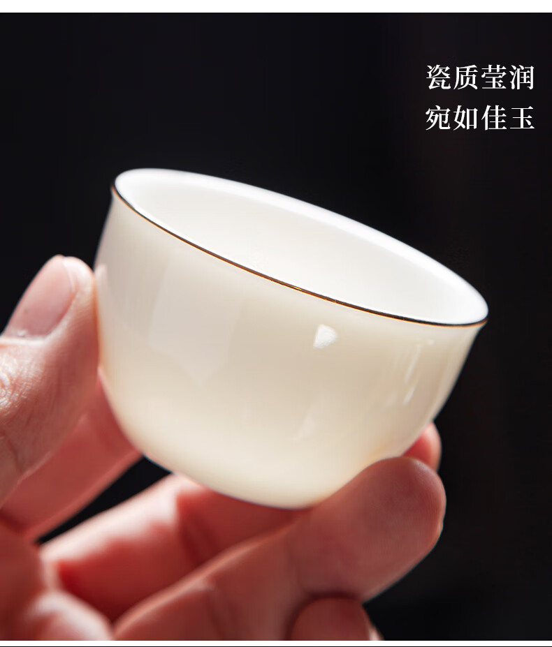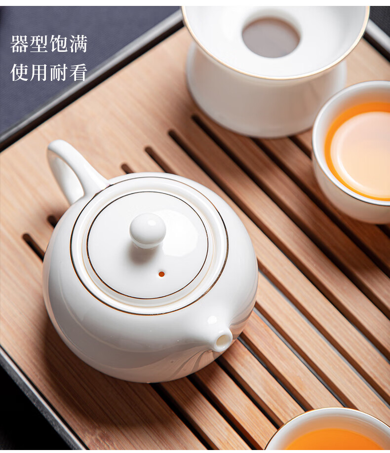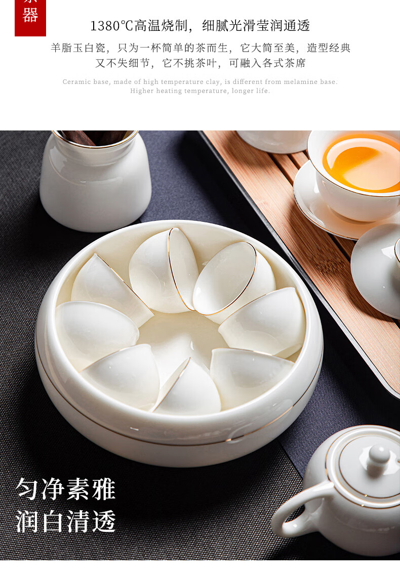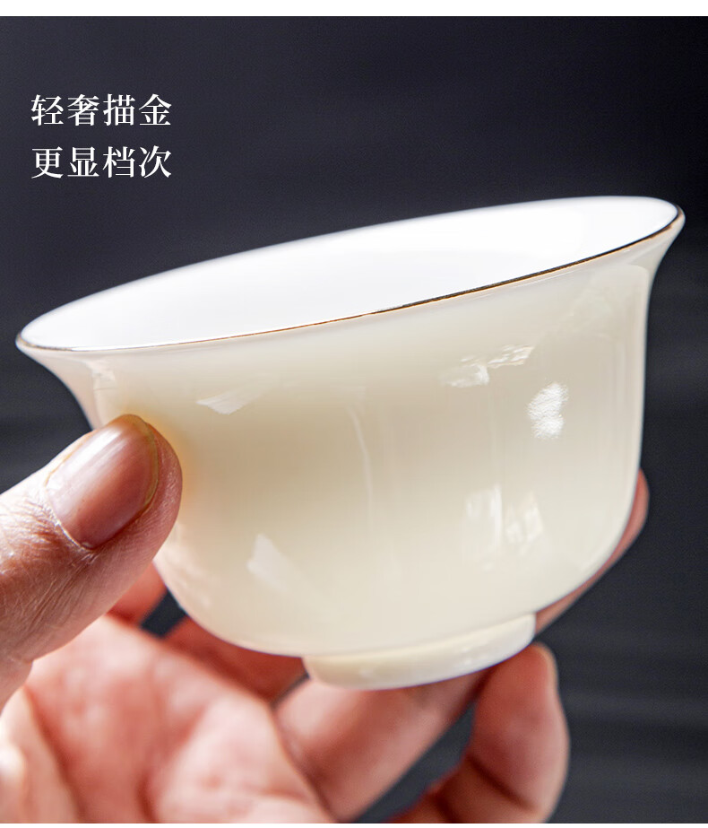 Jingcizhai Mutton Fat Jade White Porcelain Kung Fu Tea Set Home Light Luxury High-End Ceramic Covered Bowl Tea Cup New Complete Set Gold Painting-White Bean Fat Jade Covered Bowl 9-Head Perfect Cup
