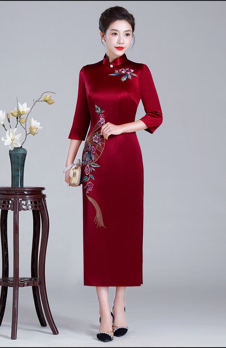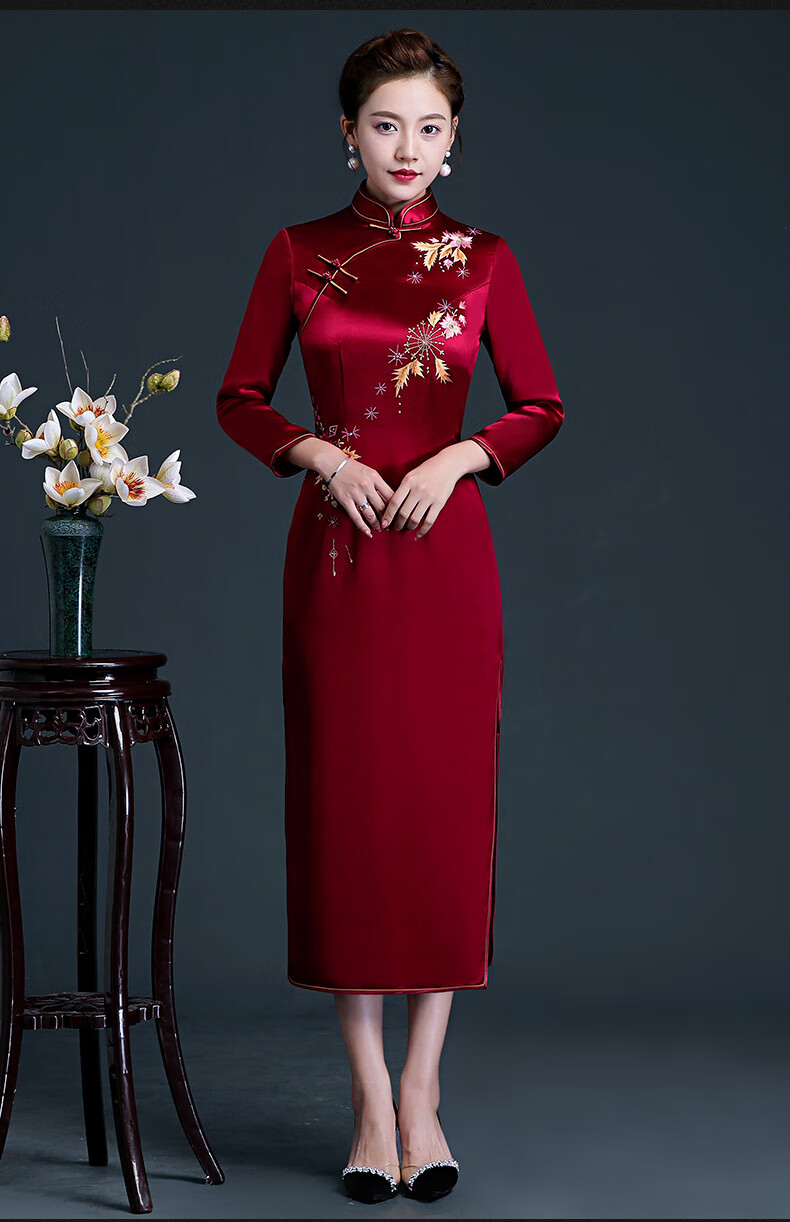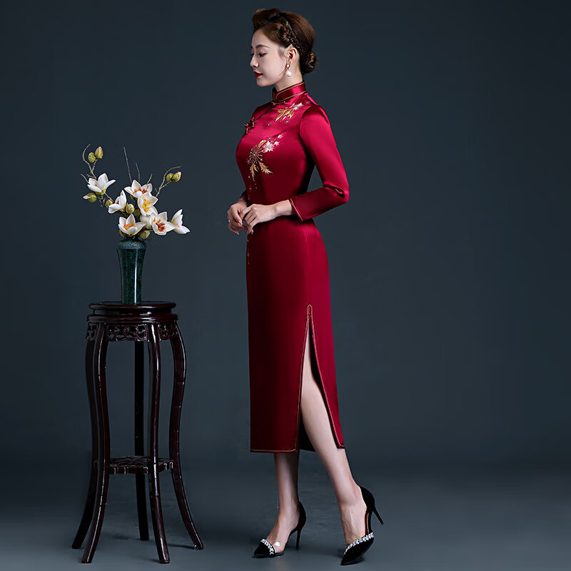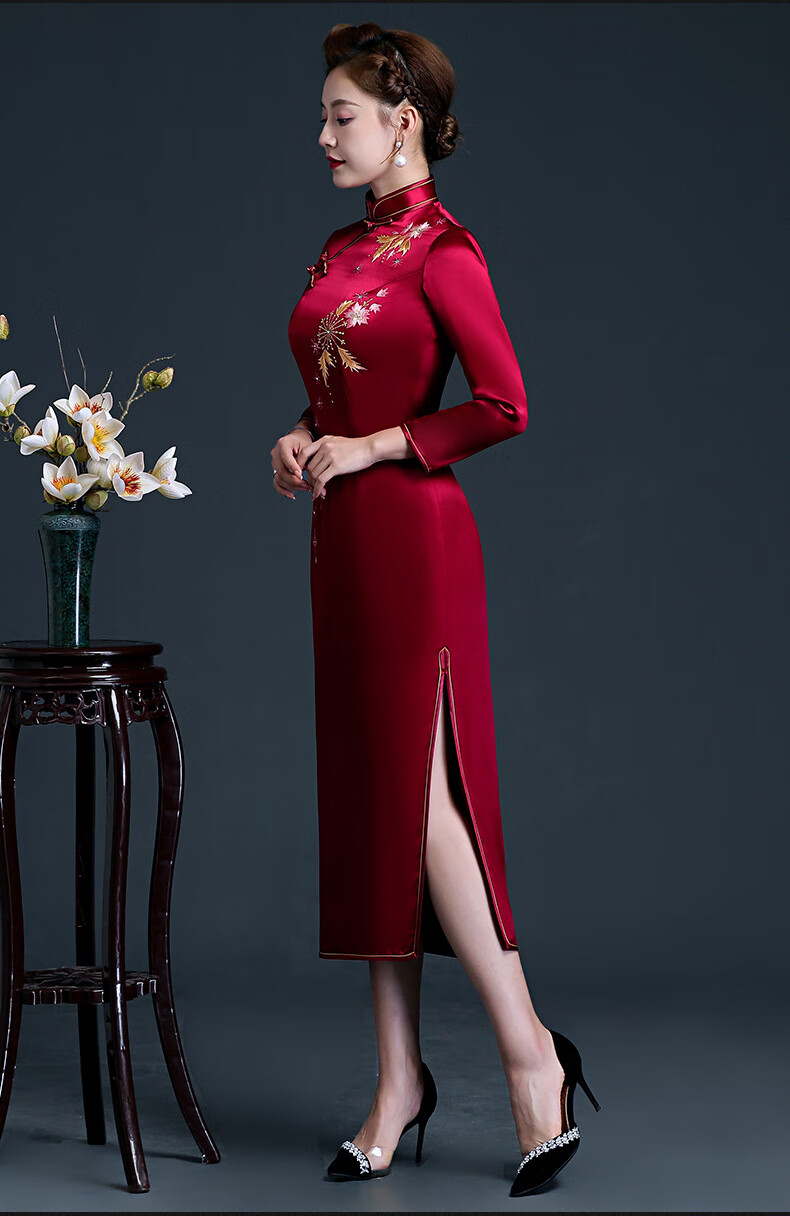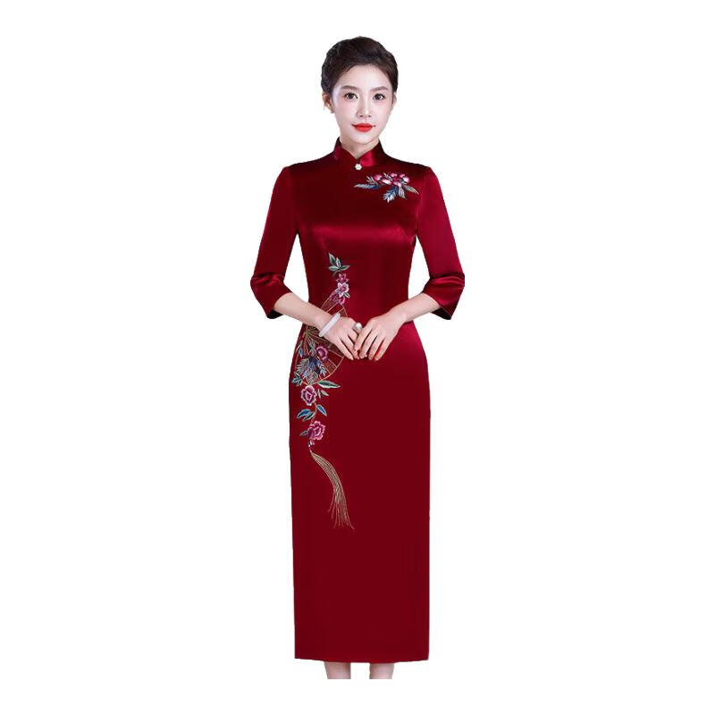 Meifuna cheongsam Chinese style autumn and winter new style high-end mother-in-law wedding banquet embroidered cheongsam wedding mother dress for women burgundy 2XL