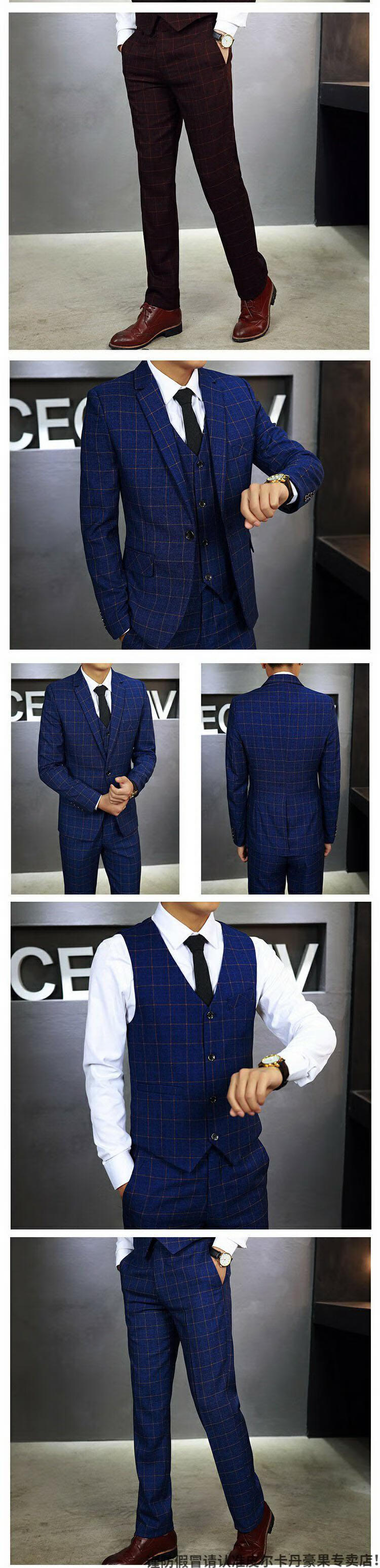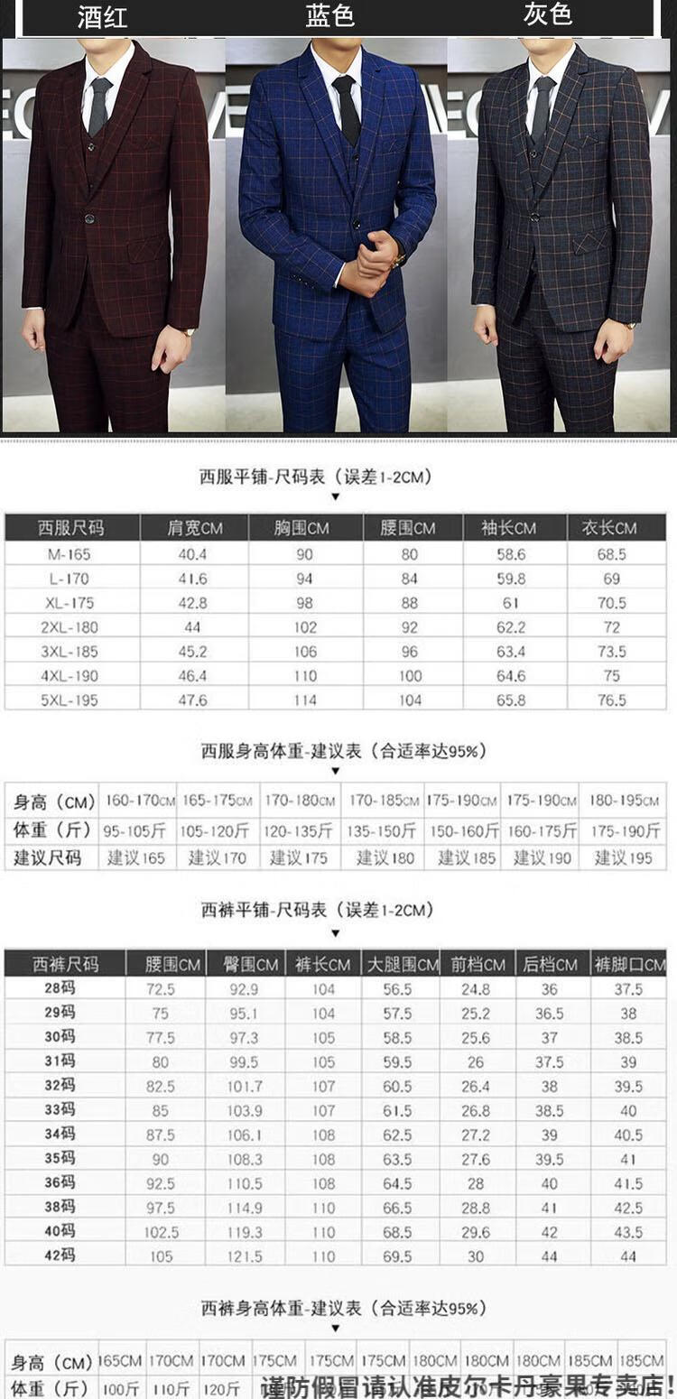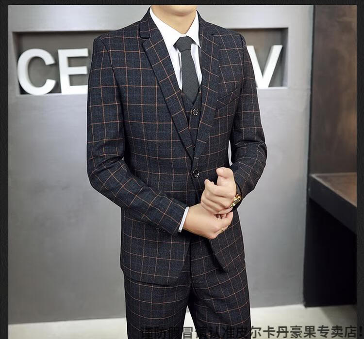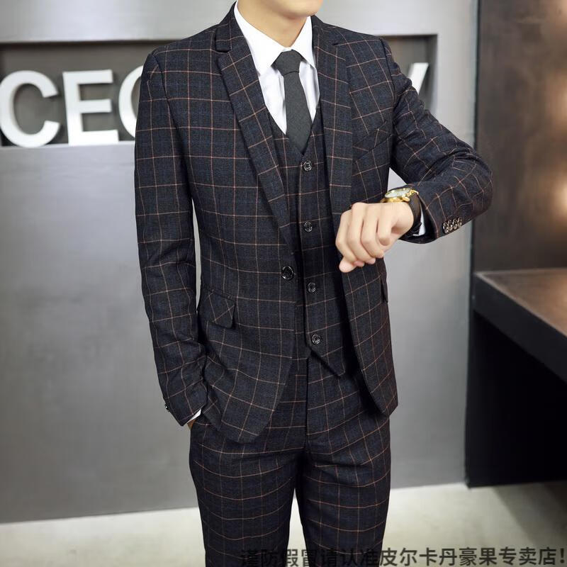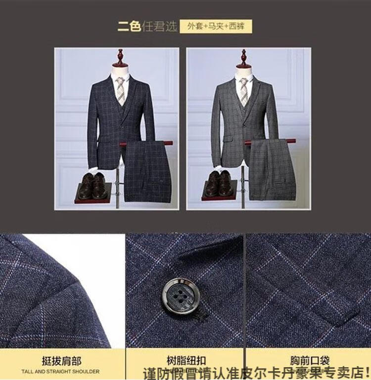 Pierre Cardin Men's Korean Slim Suit Three-piece Groom Wedding Dress Formal Casual Plaid Small Suit Plaid Blue Two-piece Set (Top and Pants) Free Belt 4XL 35 (155-162Jin Jin is equal to 0.5kg)