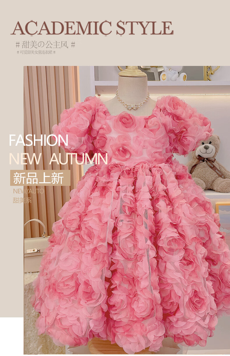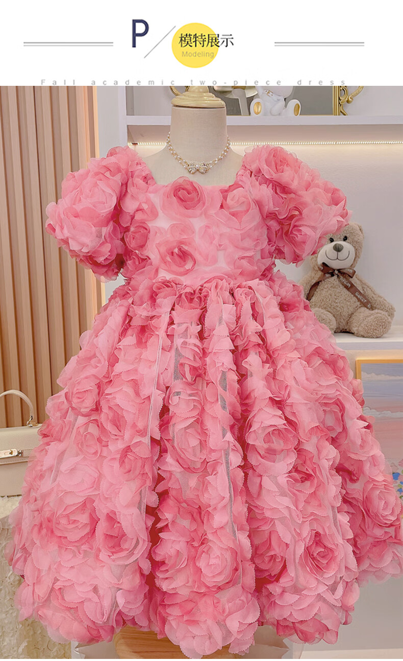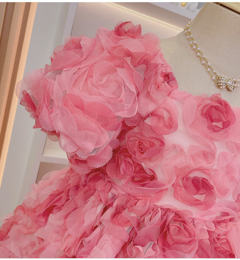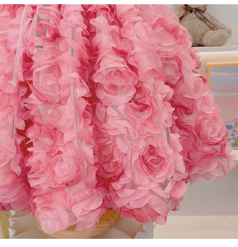 Anne Youer Girls Dress Summer 2025 New Children's Internet Celebrity Three-dimensional Flower French Princess Dress Girls Summer Dress Pink 110