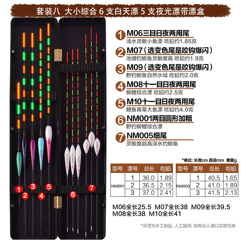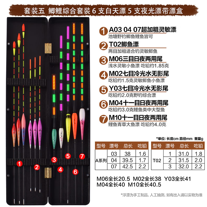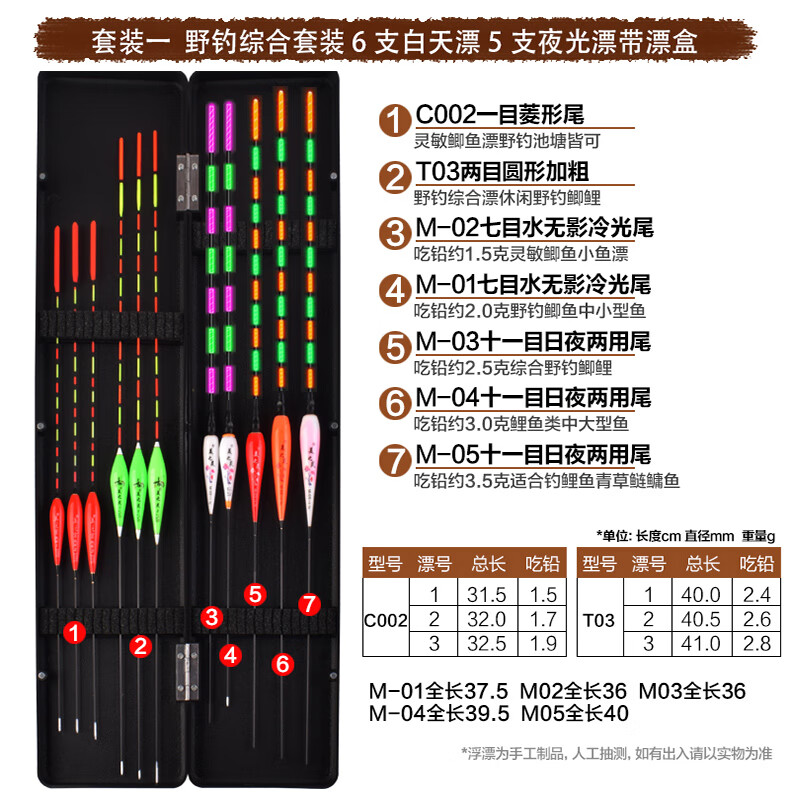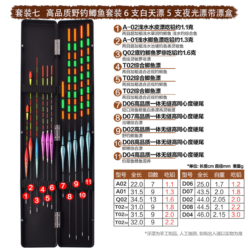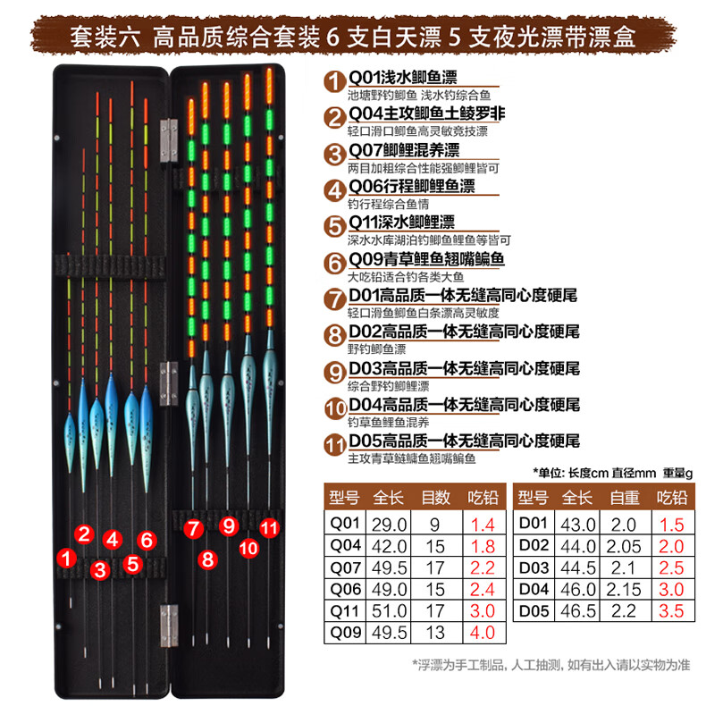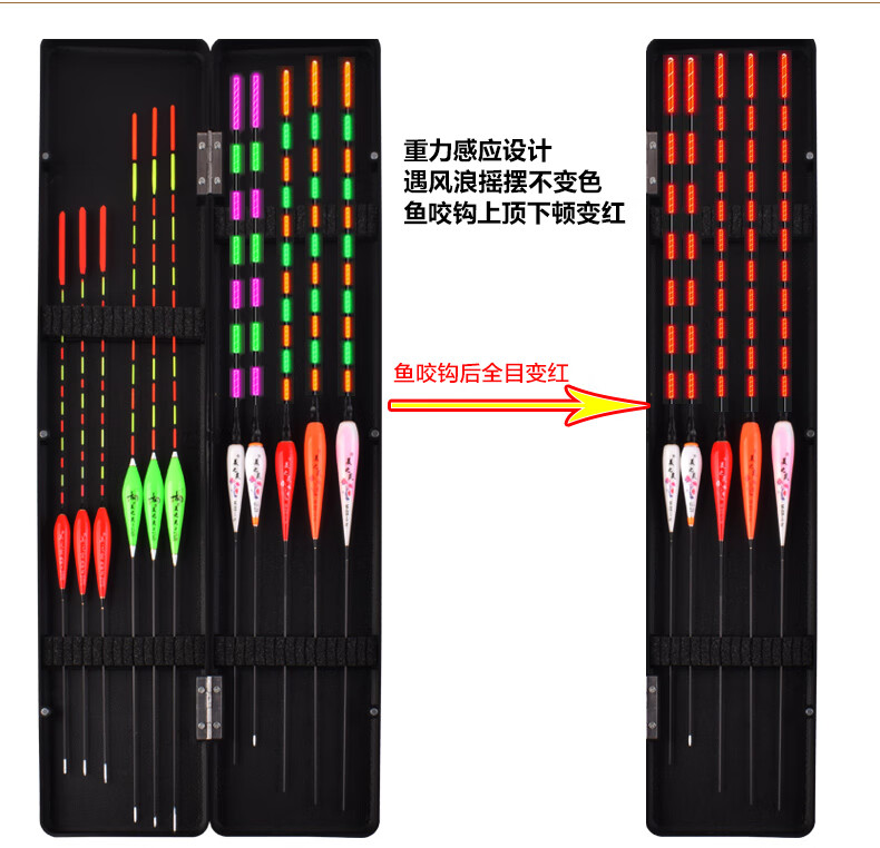 Beauty Spirit 5 luminous floats + 6 daytime floats with a float box and fish float set. Hook-biting and color-changing electronic luminous floats for night fishing. A comprehensive wild fishing set. 5 luminous floats that do not change color + 6 daytime floats + float box.