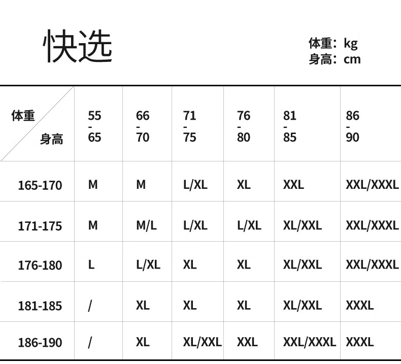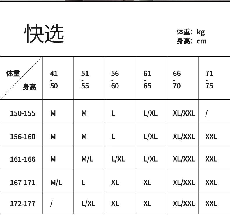 China (cm) 160-165/84-86 165-170 / 88-90 167-172 / 92-96 168-173 / 98-102 170-176 / 106-110