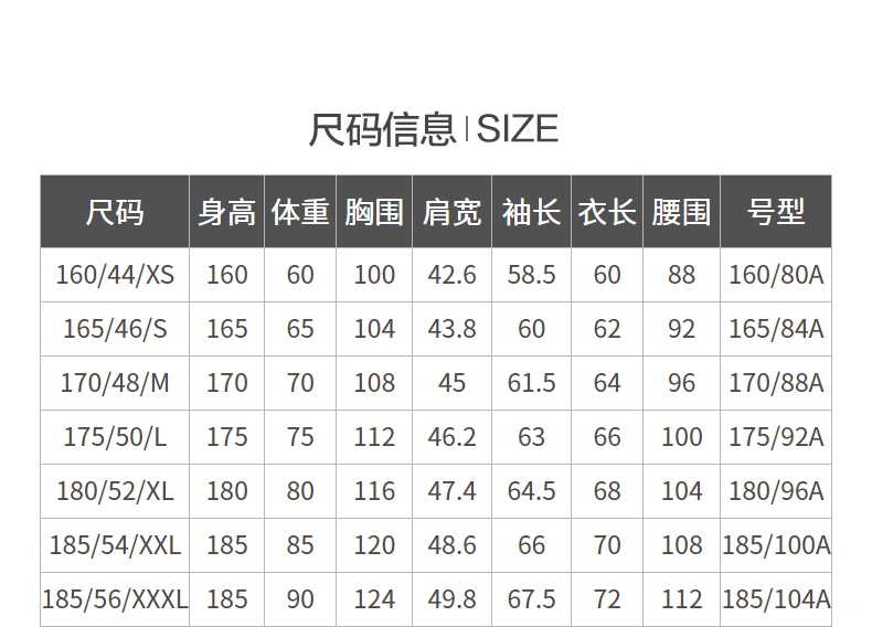 China (cm) 160-165/84-86 165-170 / 88-90 167-172 / 92-96 168-173 / 98-102 170-176 / 106-110