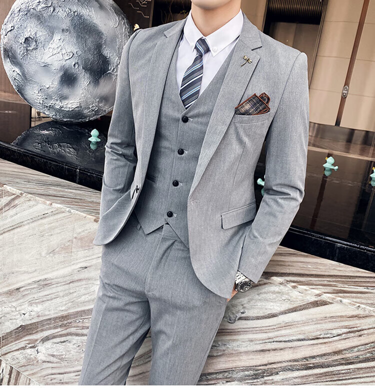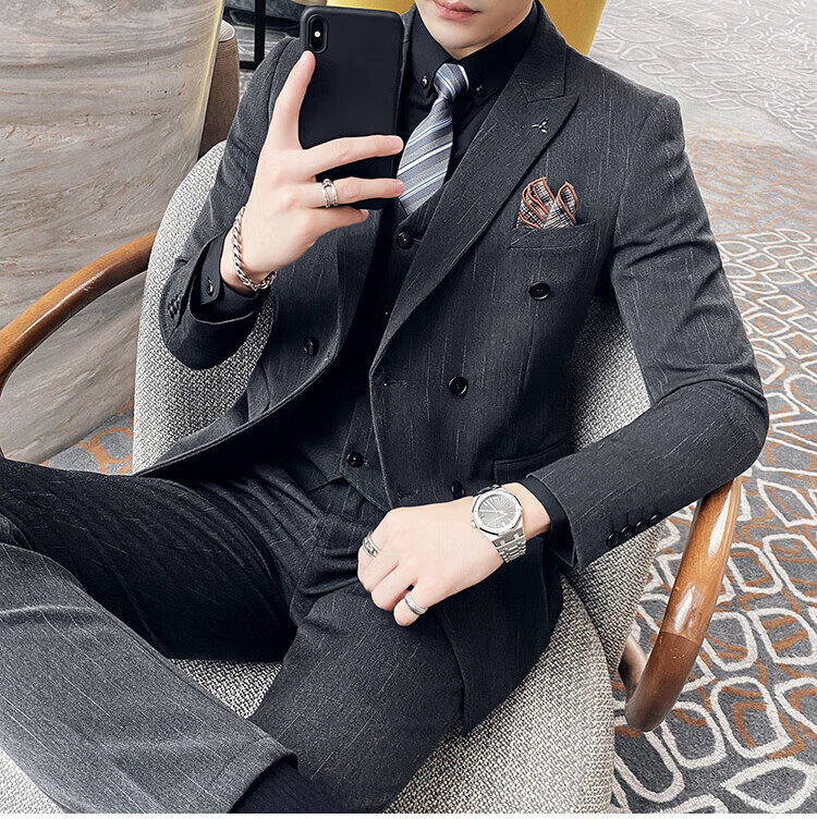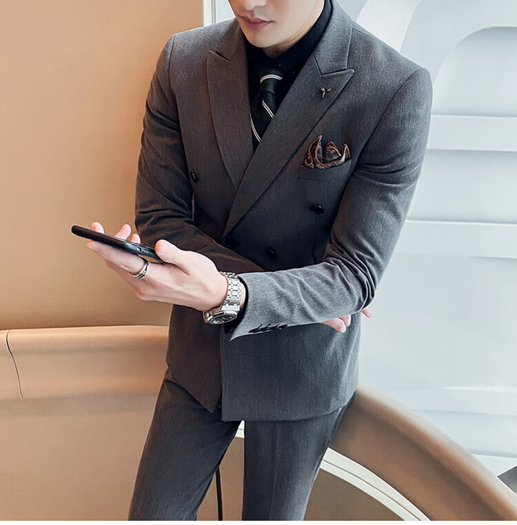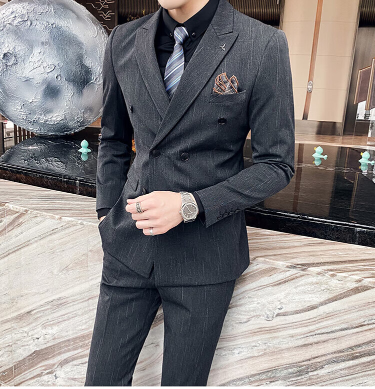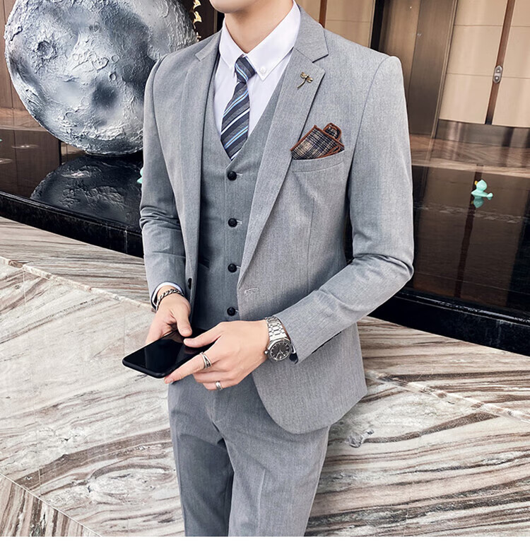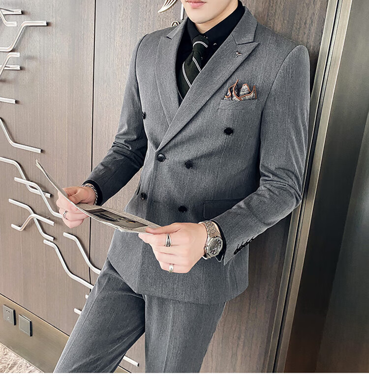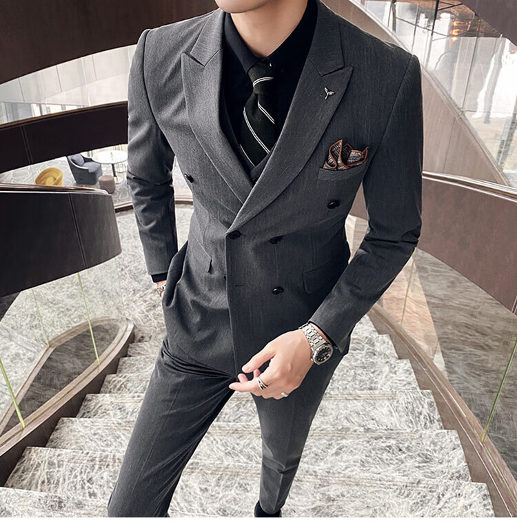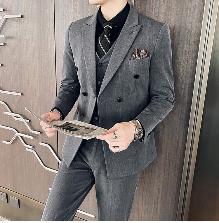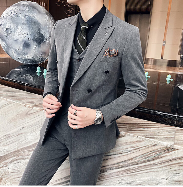 ROMON spring suit men's Korean style casual small suit men's double-breasted British style handsome trendy slim jacket medium gray double-breasted (suit + vest + pants XL (52)