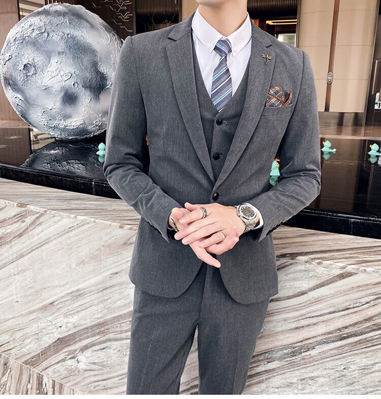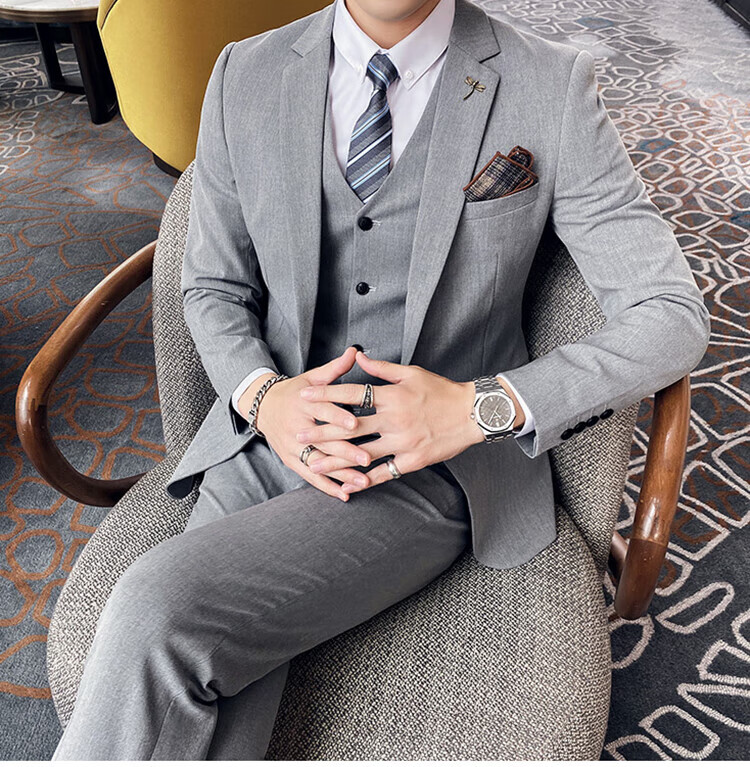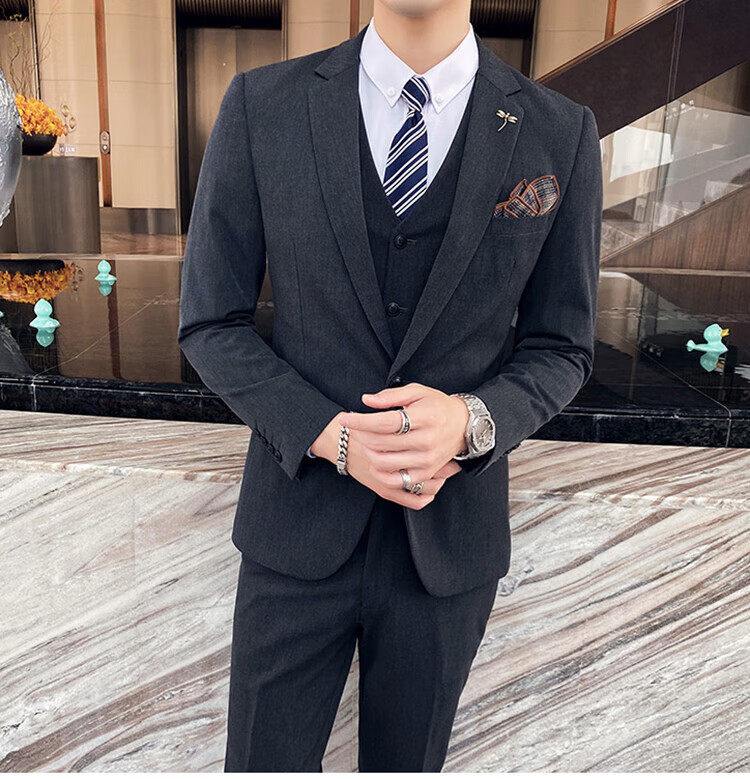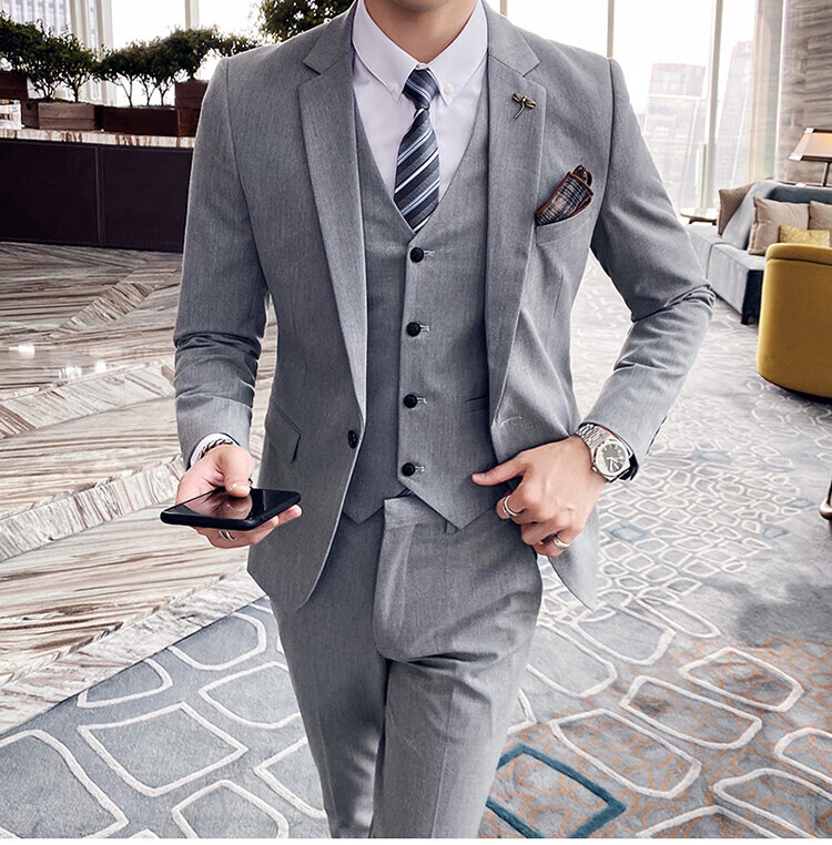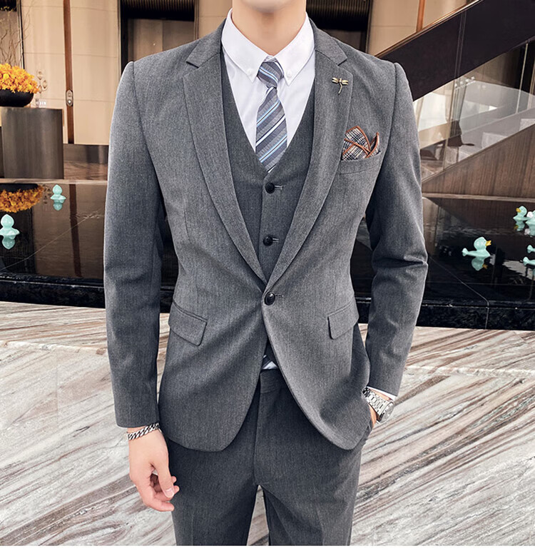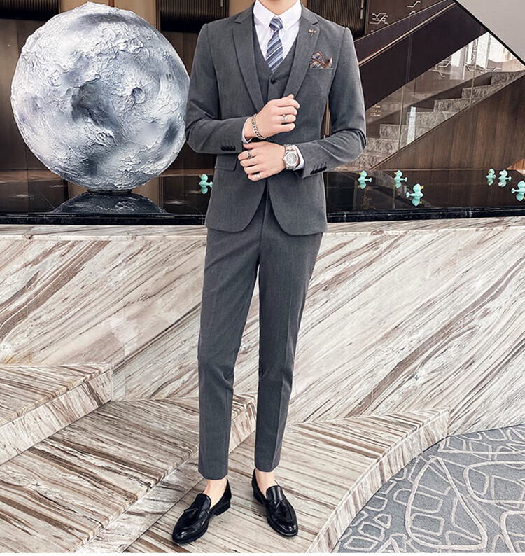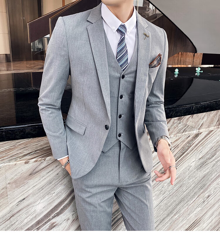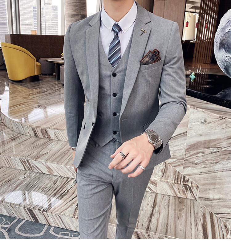 ROMON spring suit men's Korean style casual small suit men's double-breasted British style handsome trendy slim jacket medium gray double-breasted (suit + vest + pants XL (52)