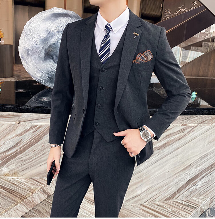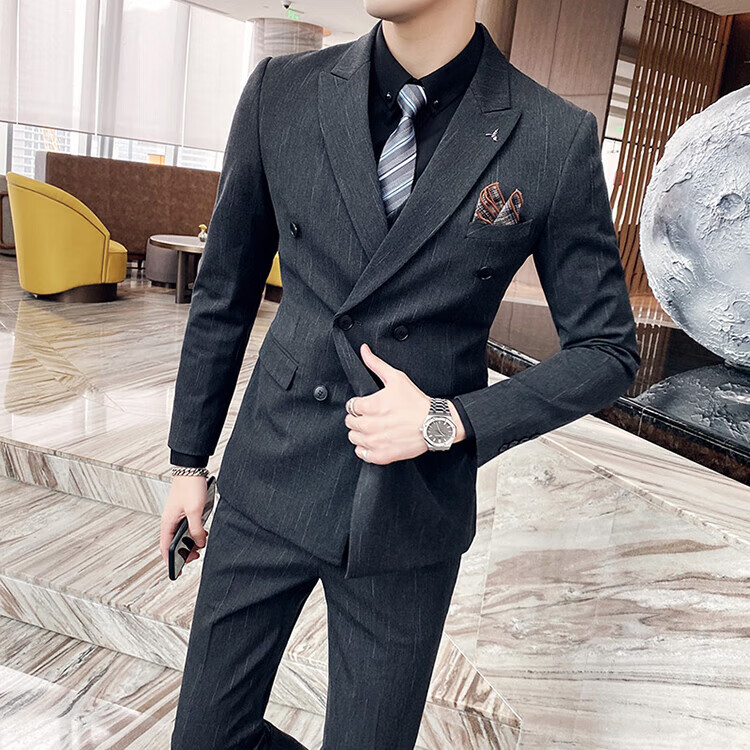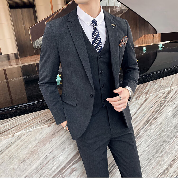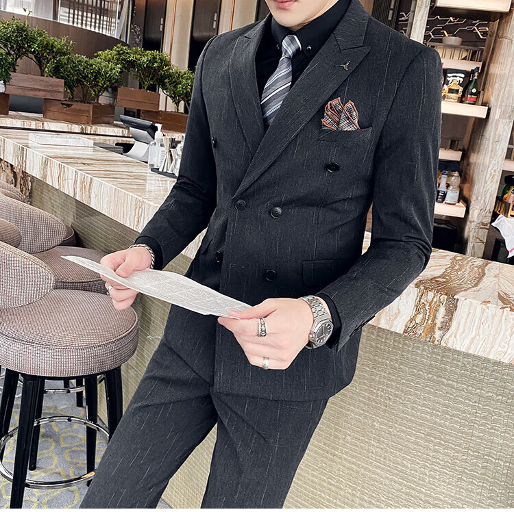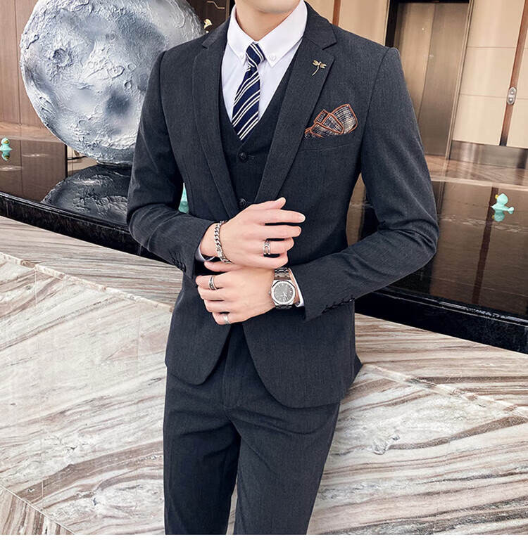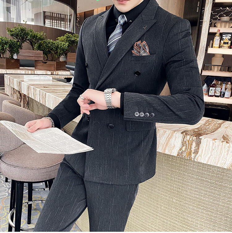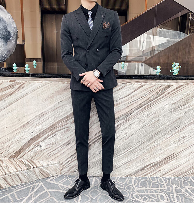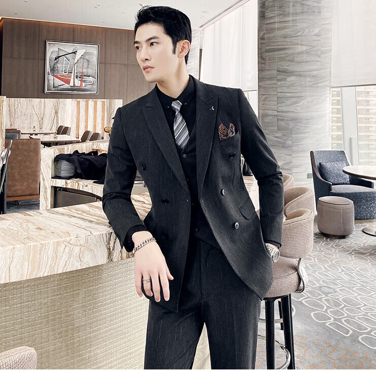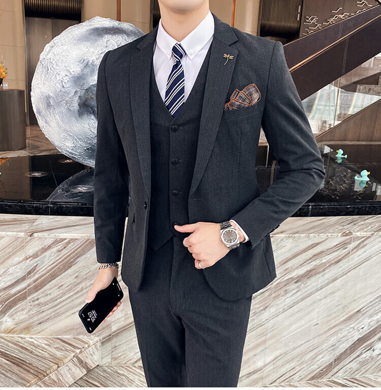 ROMON spring suit men's Korean style casual small suit men's double-breasted British style handsome trendy slim jacket medium gray double-breasted (suit + vest + pants XL (52)
