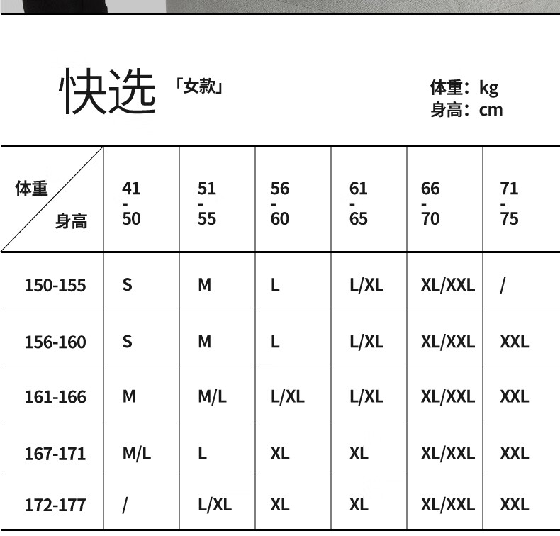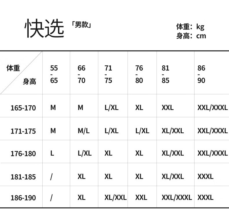 China (cm) 160-165/84-86 165-170 / 88-90 167-172 / 92-96 168-173 / 98-102 170-176 / 106-110