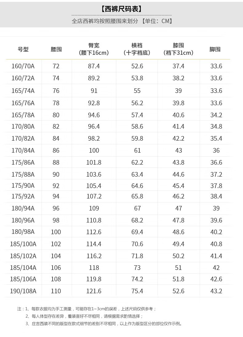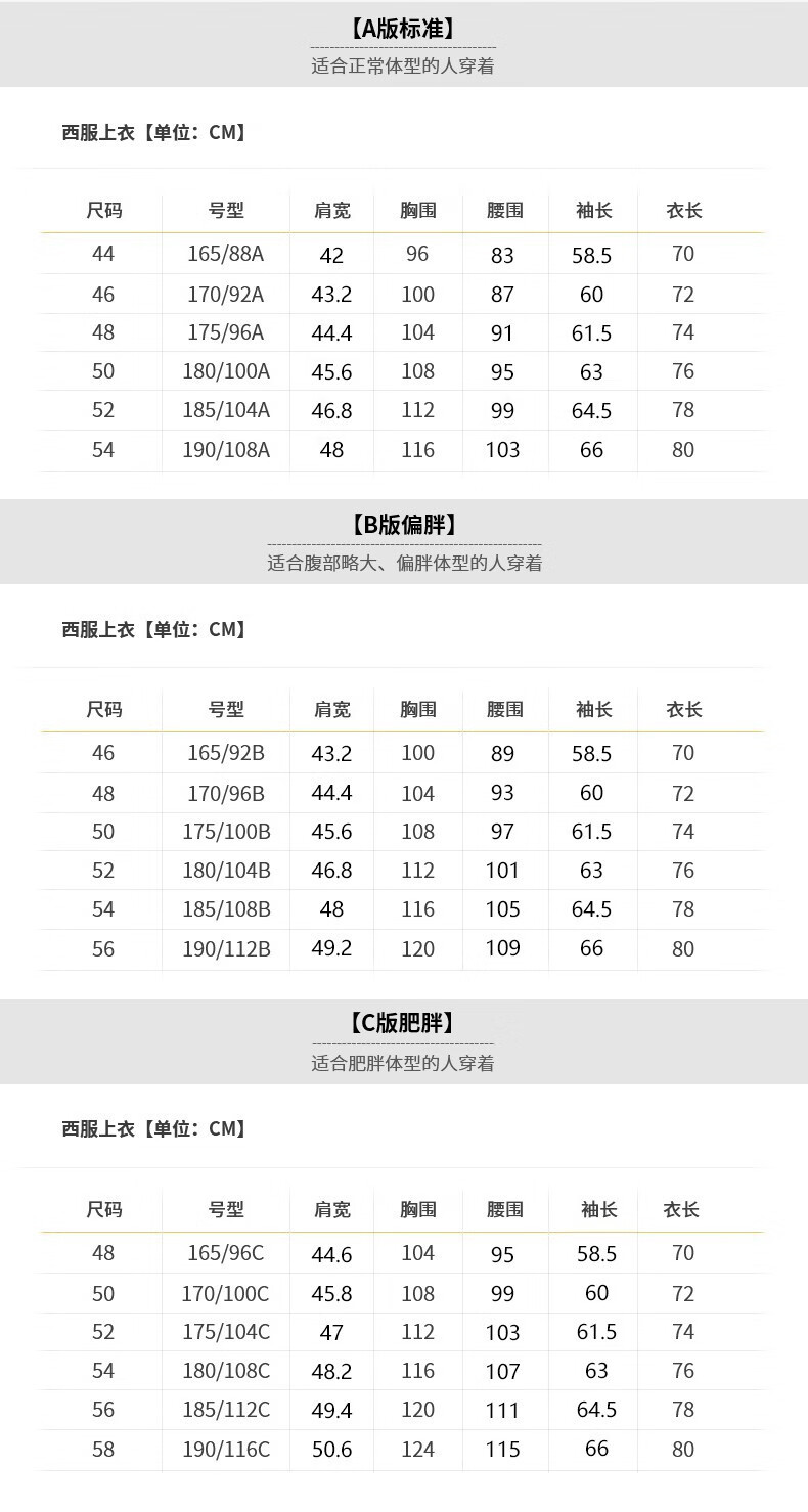 China (cm) 160-165/84-86 165-170 / 88-90 167-172 / 92-96 168-173 / 98-102 170-176 / 106-110