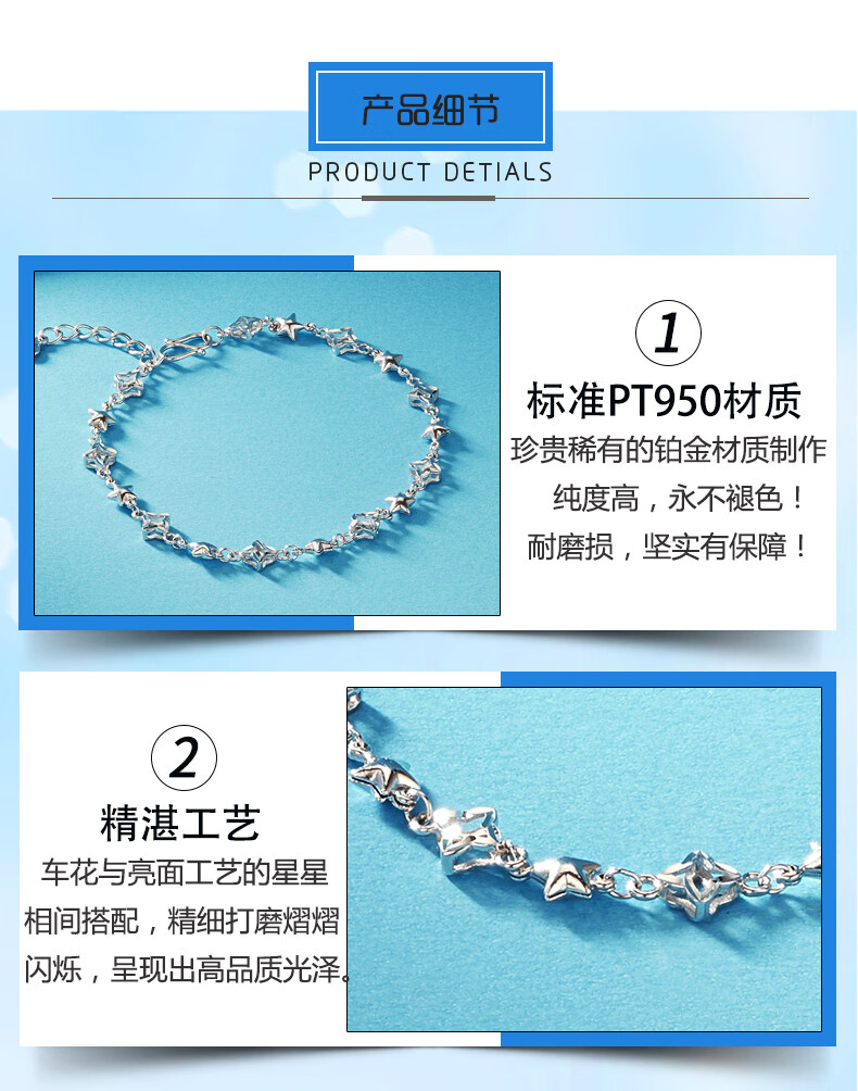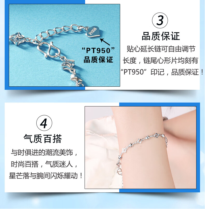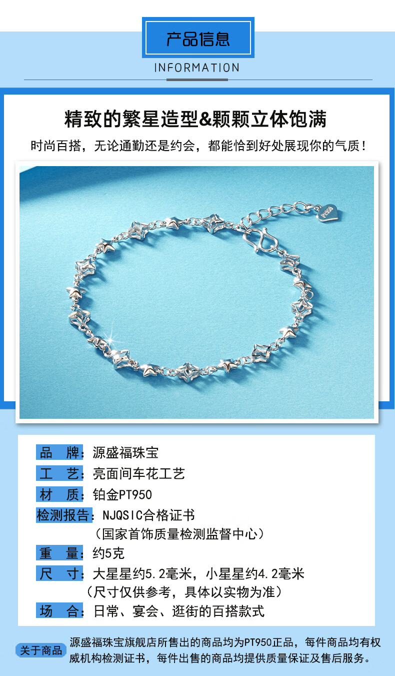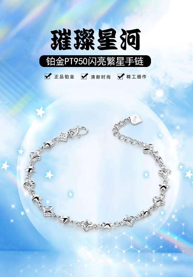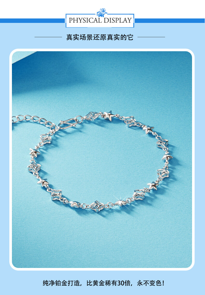 Yuan Shengfu's new PT950 small fresh star platinum bracelet, fashionable platinum hand jewelry for women, 4.63 grams, length 15-17cm adjustable