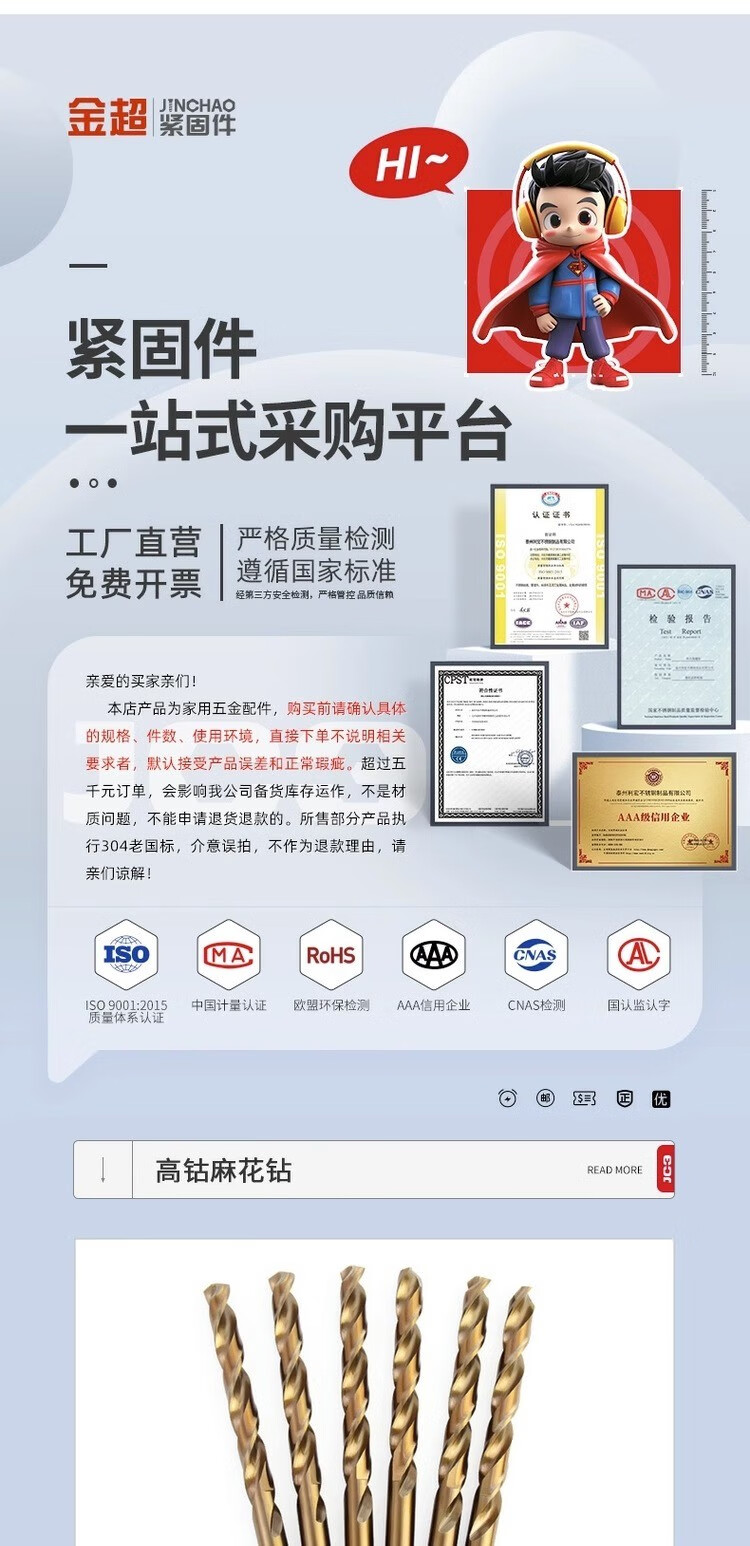 Jinchao cobalt-containing twist drill high hardness drill iron steel stainless steel special straight handle twist drill bit electric drill full hole opening 0.5mm (5 pieces)
