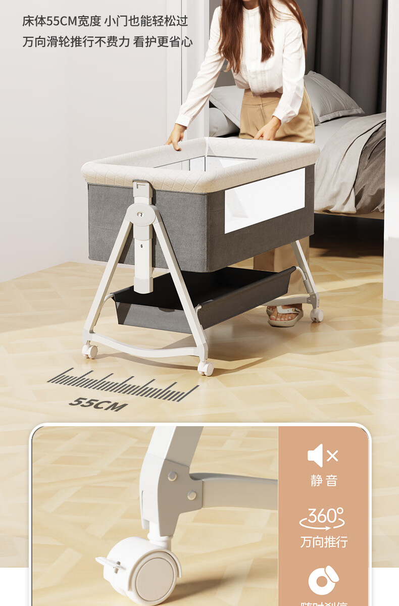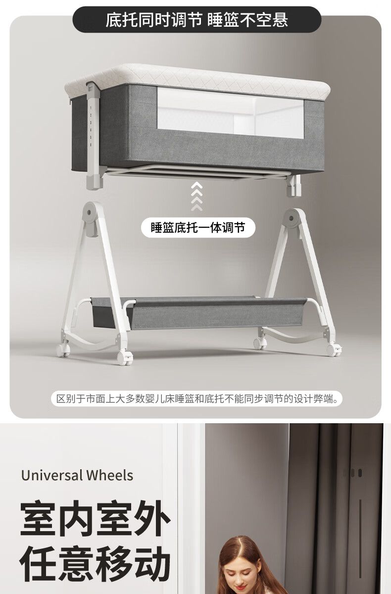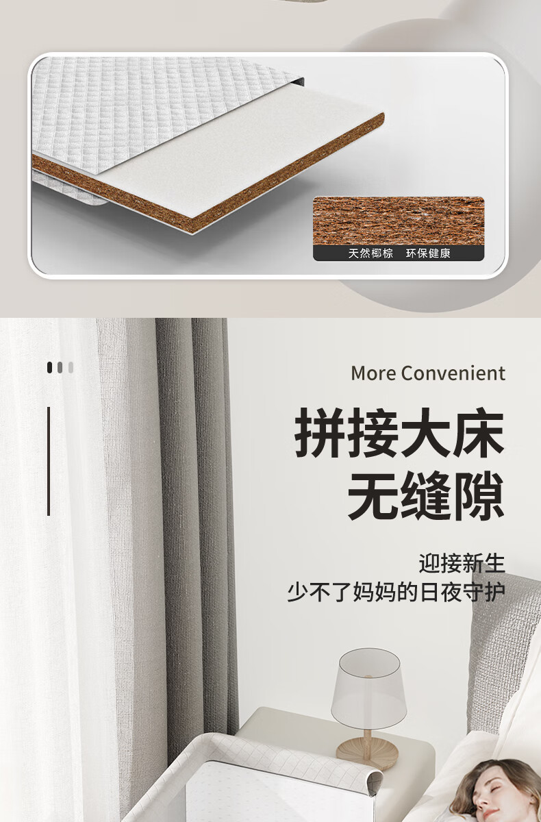 Fuxingle FORSUNNY crib, removable splicing large bed, multi-functional folding crib, baby rocking bed, newborn cradle, six-level lift + coconut palm mattress + mosquito net + headrest mat, baby products for sleeping, a must-have for mothers and babies