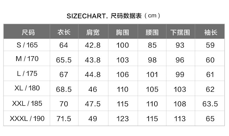 China (cm) 165 / 88-90 170 / 96-98 175 / 108-110 180 / 118-122 185 / 126-130