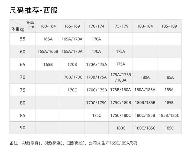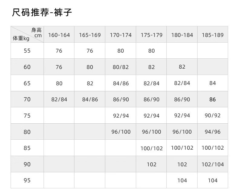 China (cm) 160-165/84-86 165-170 / 88-90 167-172 / 92-96 168-173 / 98-102 170-176 / 106-110