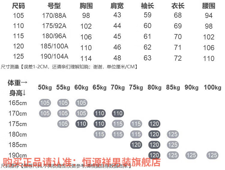 China (cm) 165 / 88-90 170 / 96-98 175 / 108-110 180 / 118-122 185 / 126-130