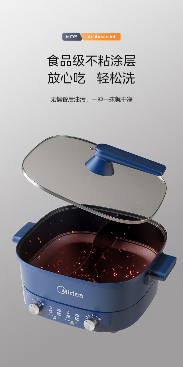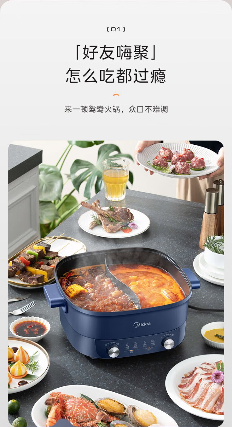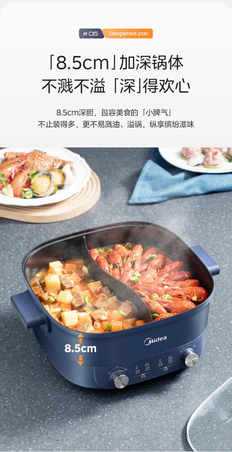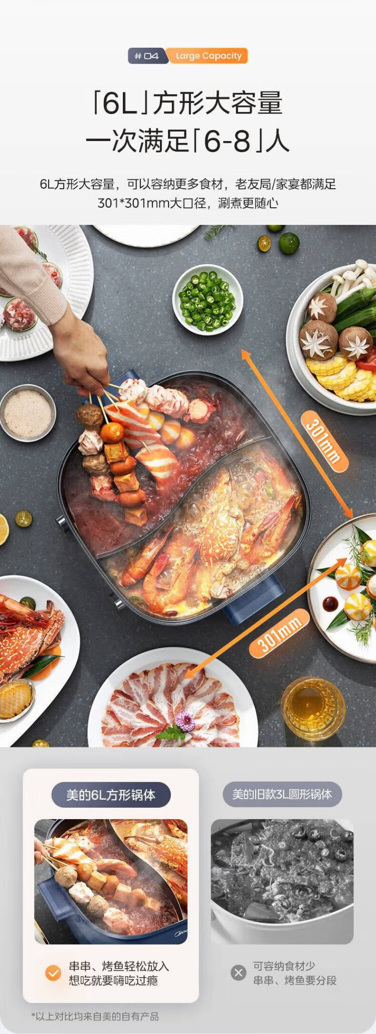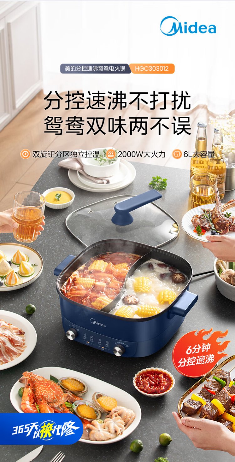 Midea electric hot pot special pot, Yuanyang Pot, large capacity for 5-8 people, household use for 3-4 people, shabu-shabu, electric hot pot, all-in-one multi-function pot, electric cooking pot, electric wok, grilled fish and barbecue pot, 6L hot selling Yuanyang Pot + zone temperature control 303012