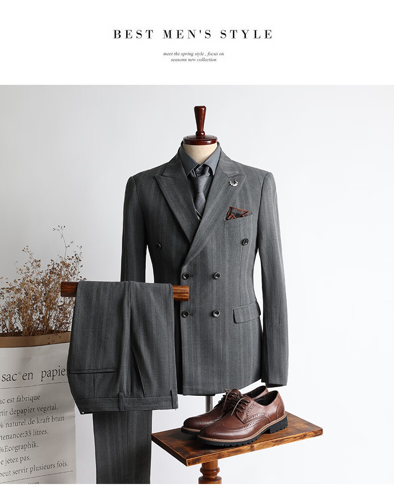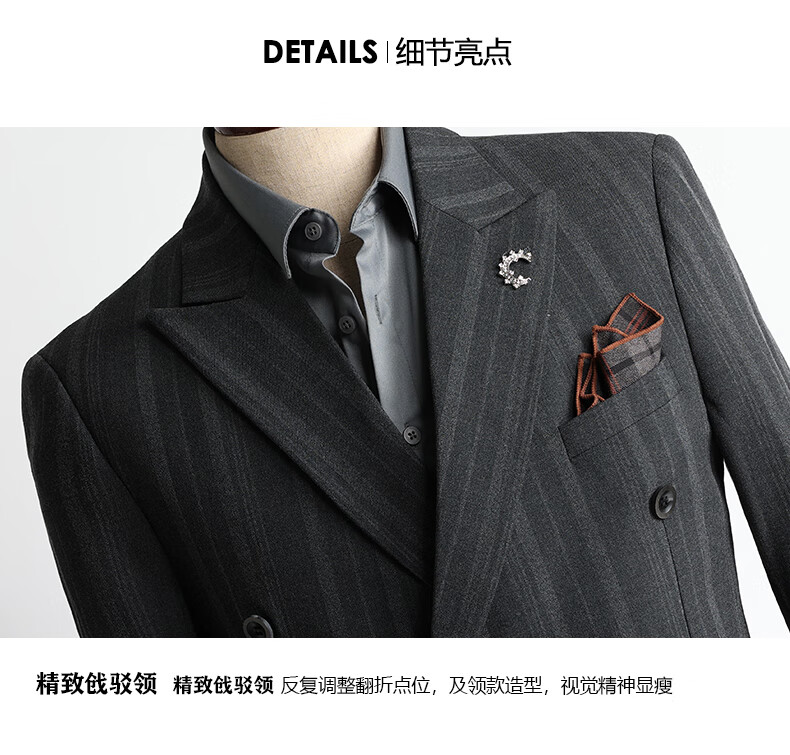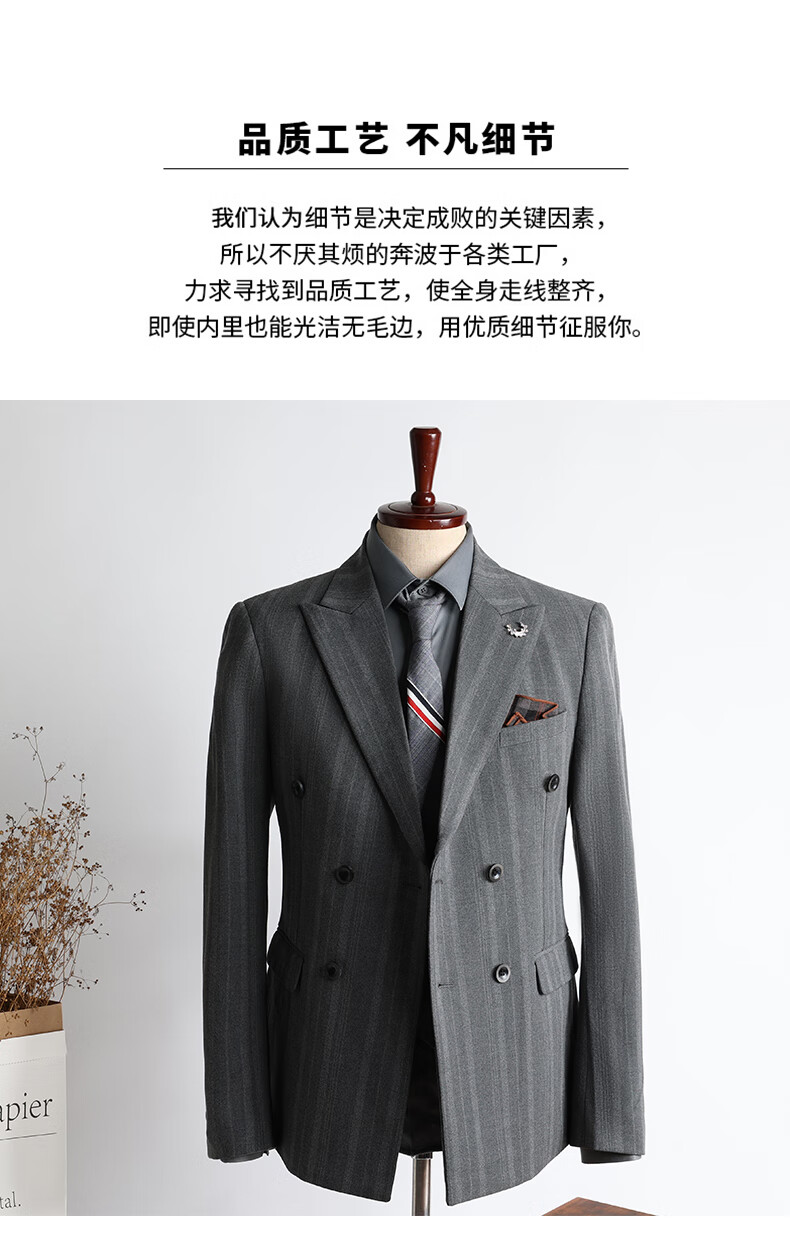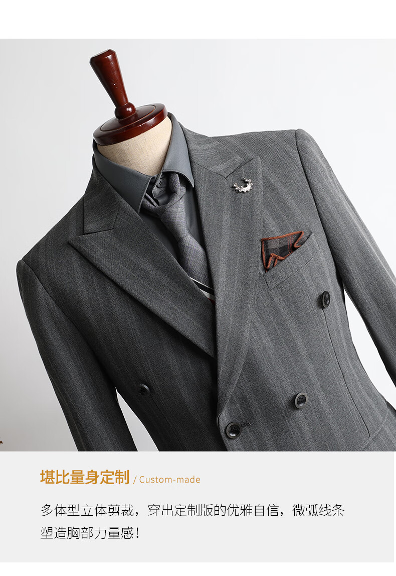 ROMON high-end customized striped suit suit for men in autumn and winter new double-breasted professional suit for men wedding and groom's dress medium gray two-piece suit + pants XL size free + brooch + pocket square