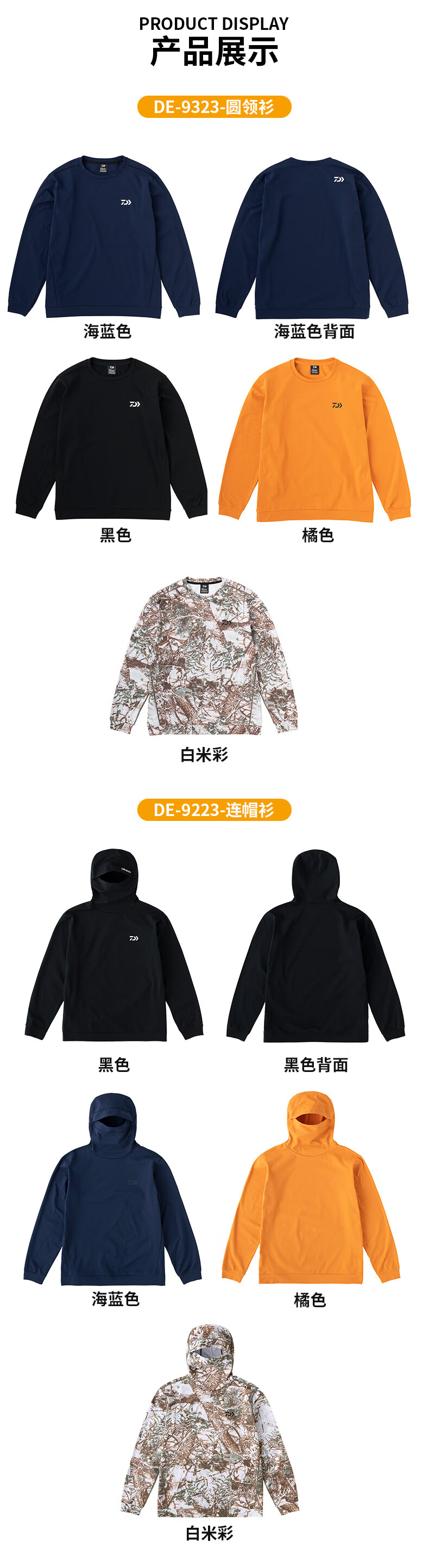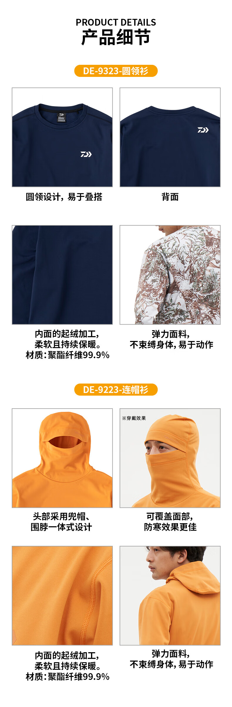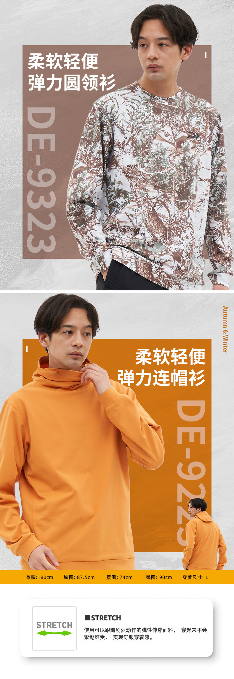 DAIWA autumn and winter DE-9223 cold-proof hooded long-sleeved shirt warm round neck pullover top autumn and winter fishing clothing DE-9323 round neck style-black M