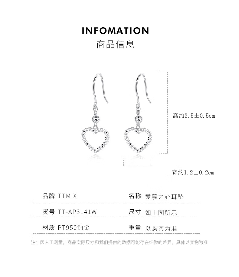 TTMIX platinum ear hook heart-shaped earrings pt950 women's classic platinum car flower love earrings 2.2-2.4g
