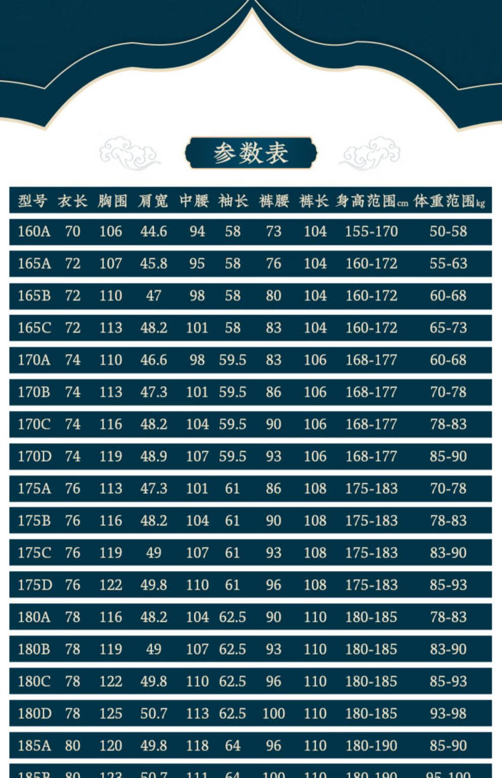 China (cm) 160-165/84-86 165-170 / 88-90 167-172 / 92-96 168-173 / 98-102 170-176 / 106-110
