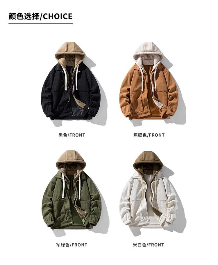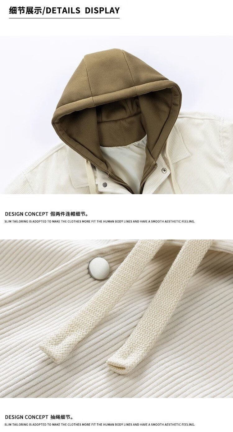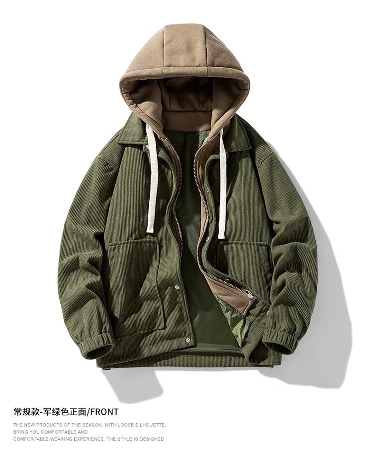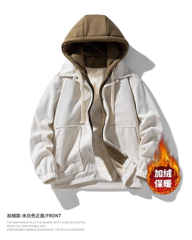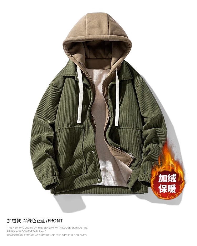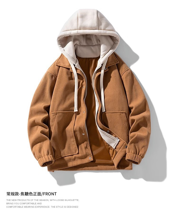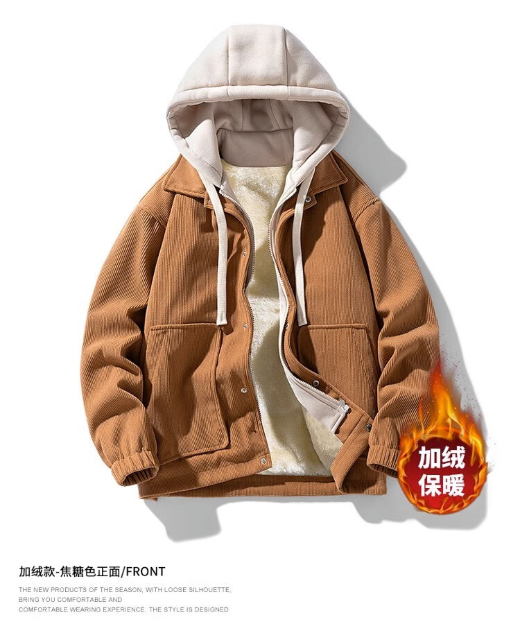 Jeanswest gefälschte zweiteilige Cordjacke für Herren im Herbst und Winter, neue trendige Marke, plus Samt, warmer Baumwollmantel, lockere Kapuzenjacke, Kleidung, Karamell plus Samt, Größe L