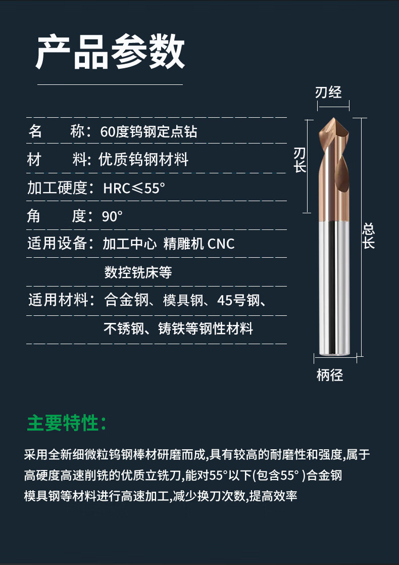 KUANG MING tungsten steel chamfering knife carbide center drill angle 90 fixed point drill extended 2-edge coated positioning drill CNC machining center fixed point chamfering 6.0*50*2F-90