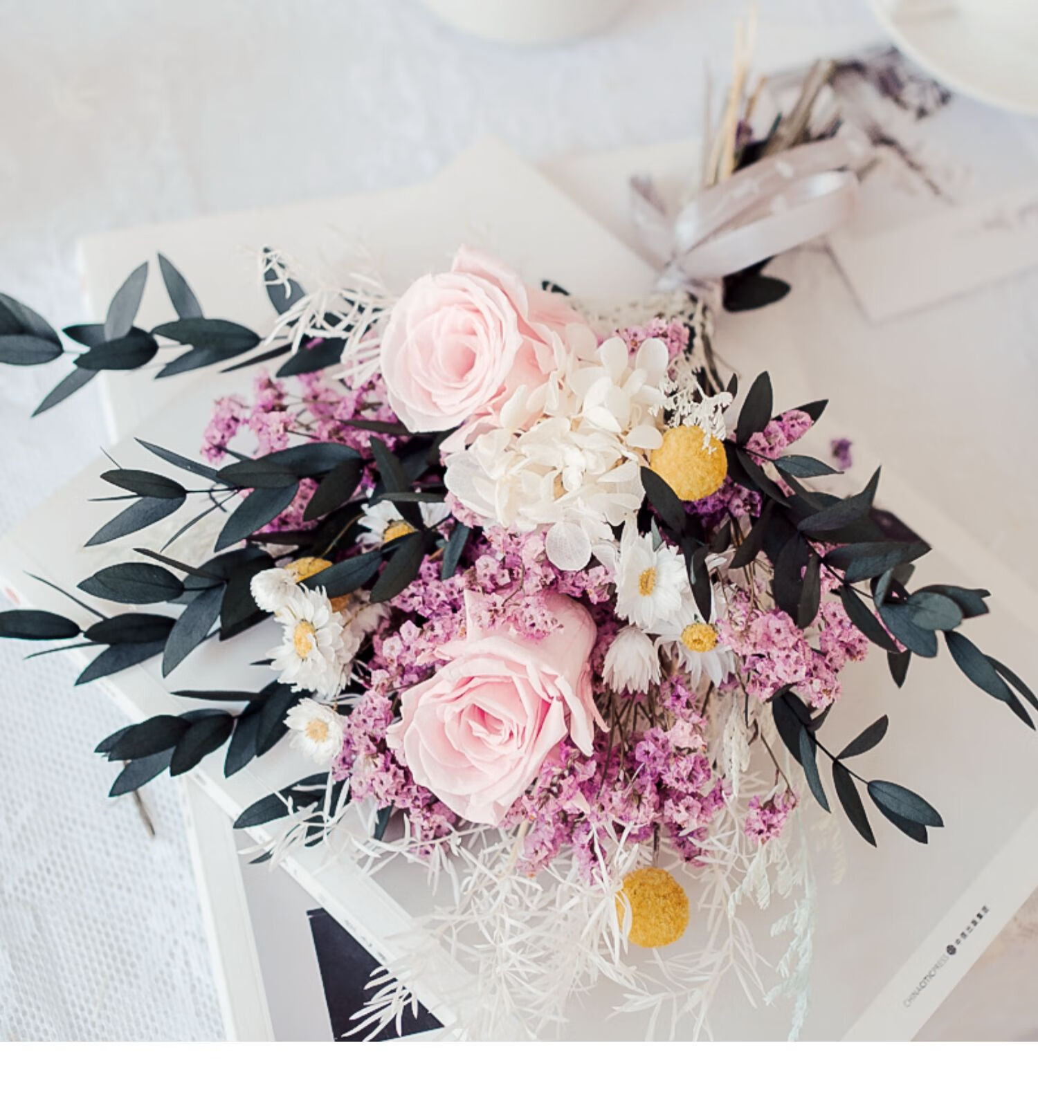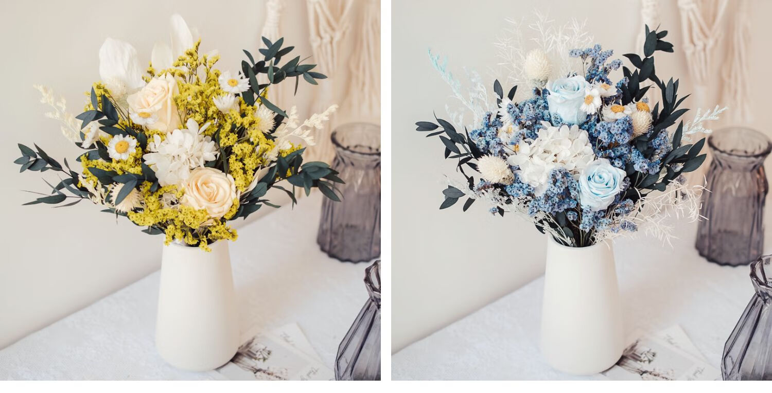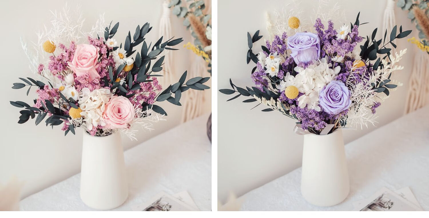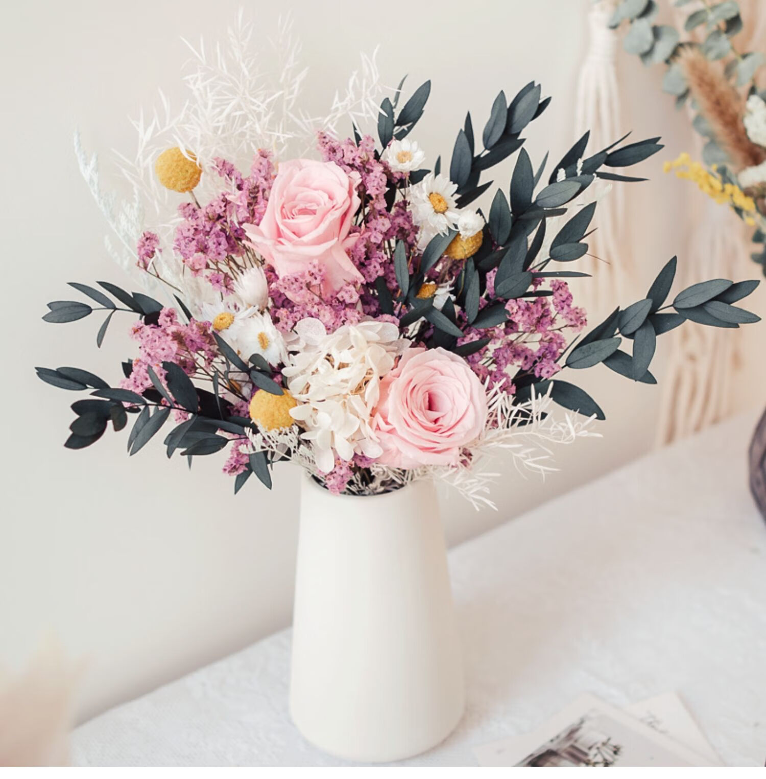 Everlasting rose eucalyptus dried flower bouquet internet celebrity ornaments real flower gypsophila hydrangea crystal grass home decoration pink rose crystal bouquet round white bottle dry branches