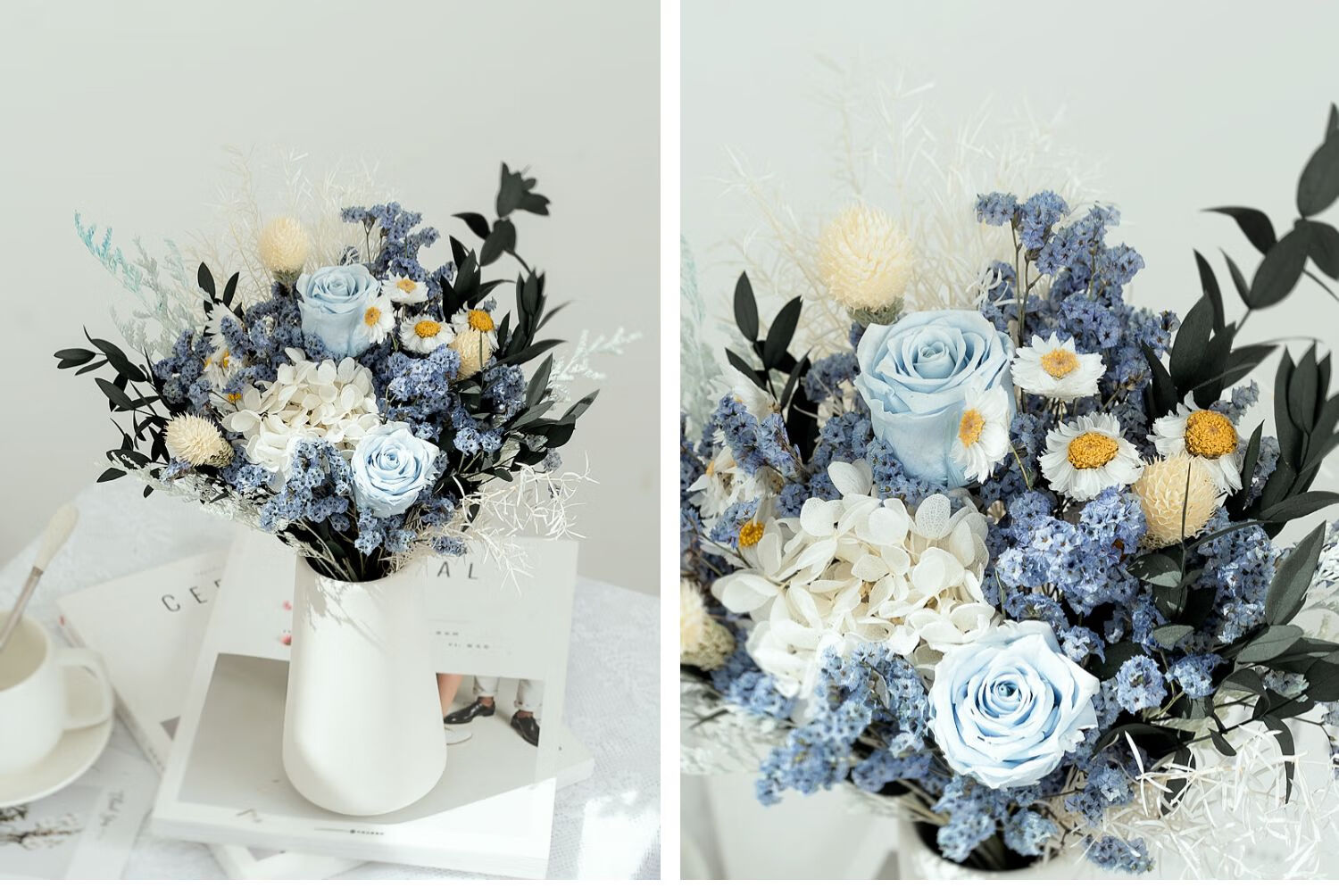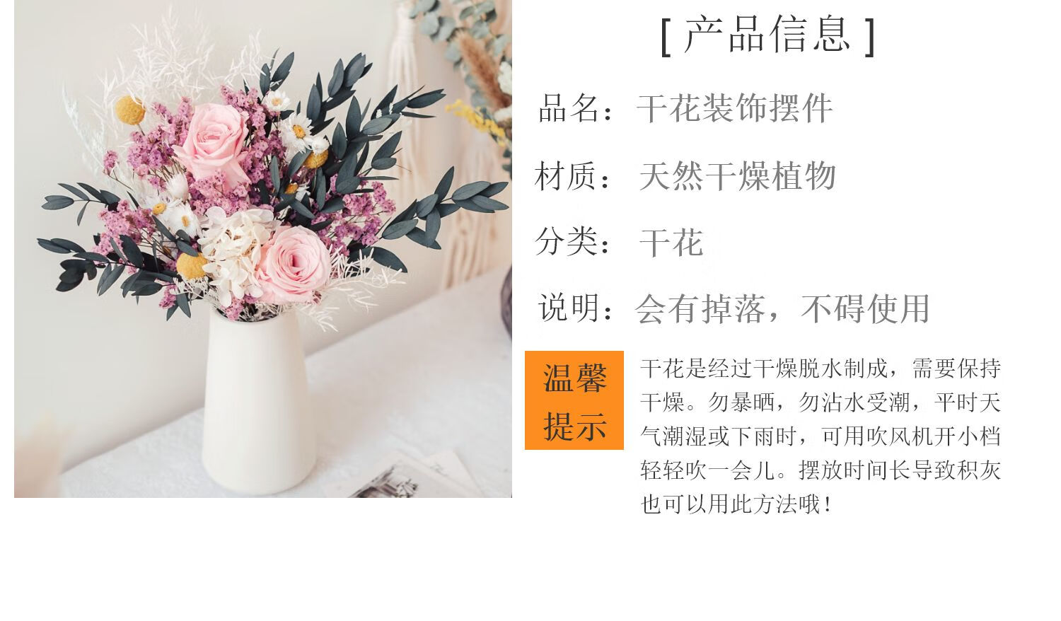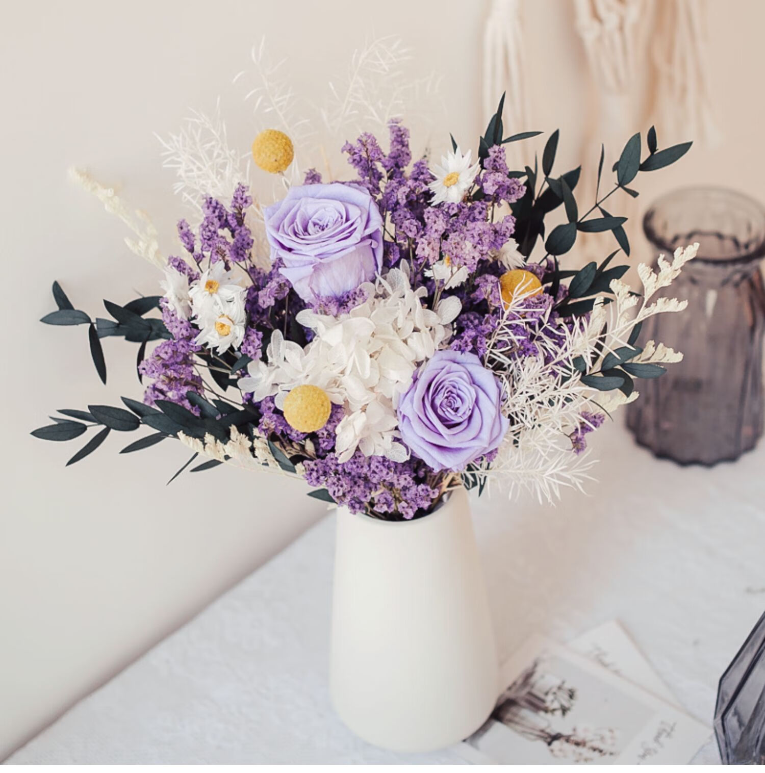 Everlasting rose eucalyptus dried flower bouquet internet celebrity ornaments real flower gypsophila hydrangea crystal grass home decoration pink rose crystal bouquet round white bottle dry branches