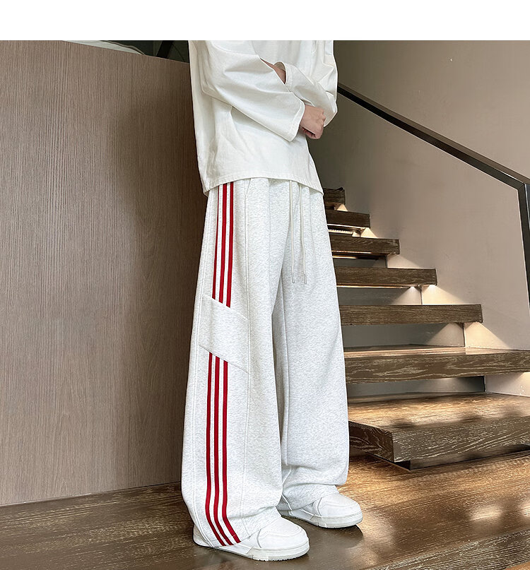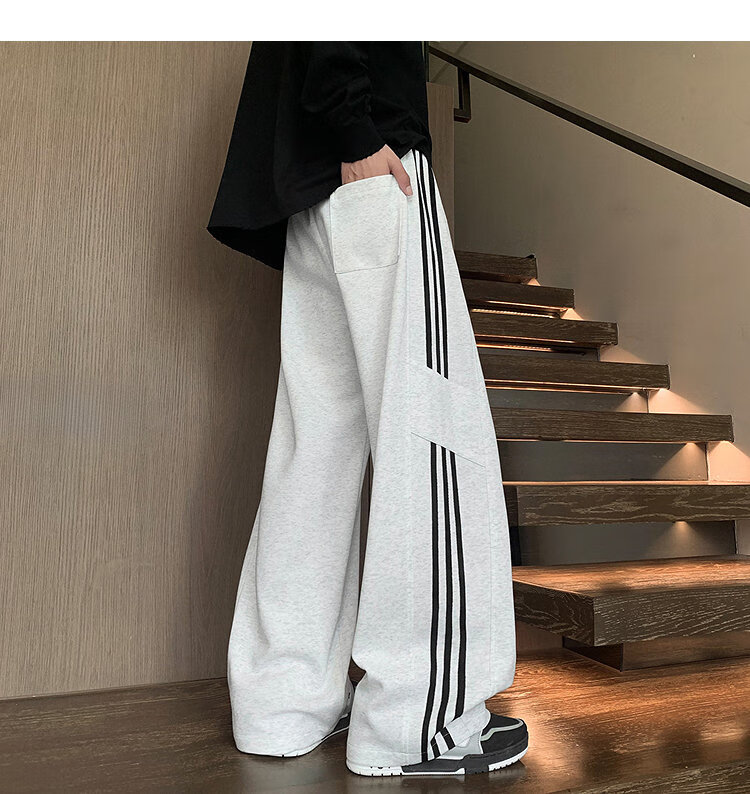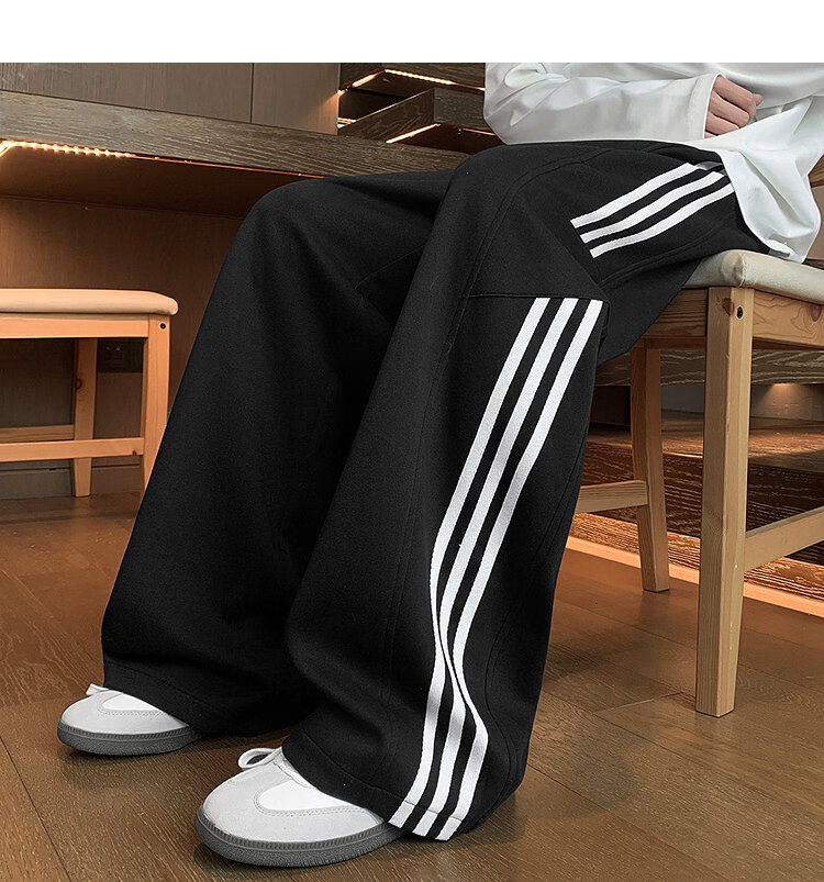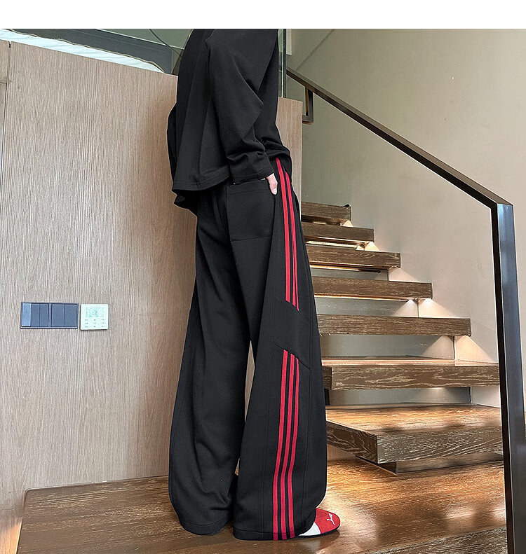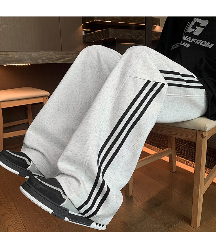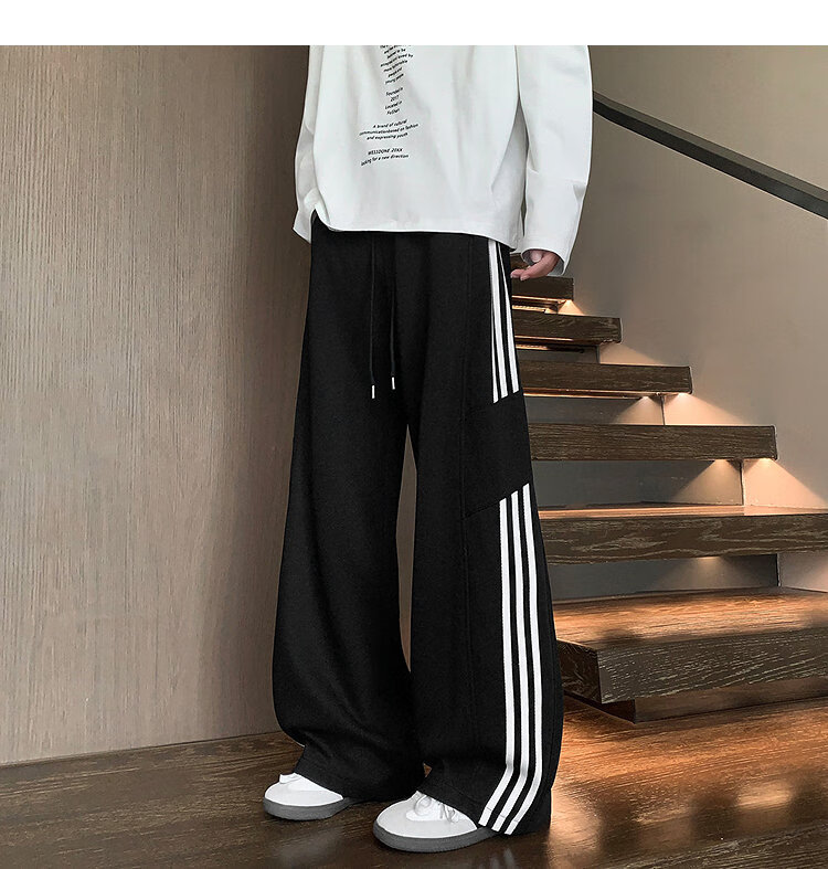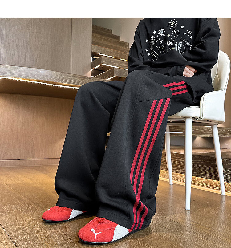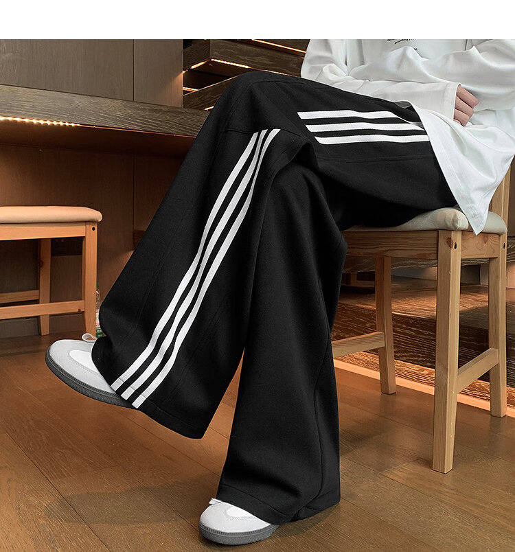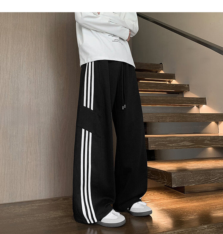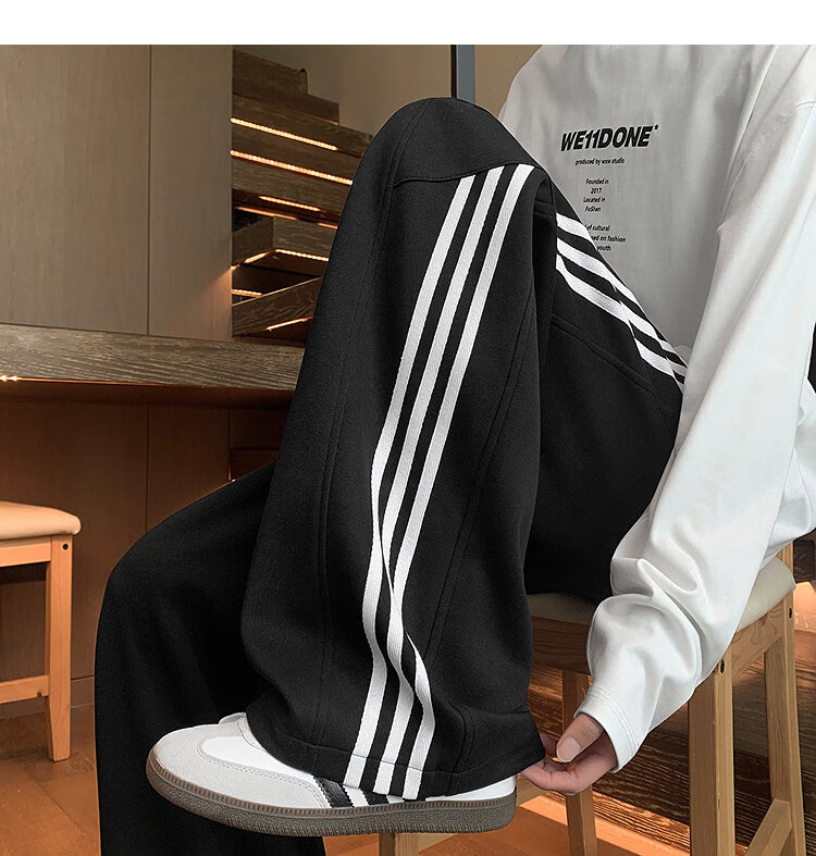 Du Xiaoxian American heavyweight three-stripe casual pants men's autumn new floor-length wide-leg pants loose straight sports pants black XL recommended 120-140Jin Jin equals 0.5 kg