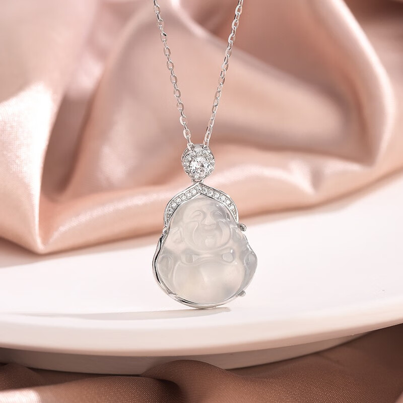 Yan Ru decorated chalcedony big belly Buddha pendant 925 silver necklace women's light luxury temperament clavicle chain new birthday gift for girlfriend L2076 white gold_big belly Buddha chalcedony pendant necklace