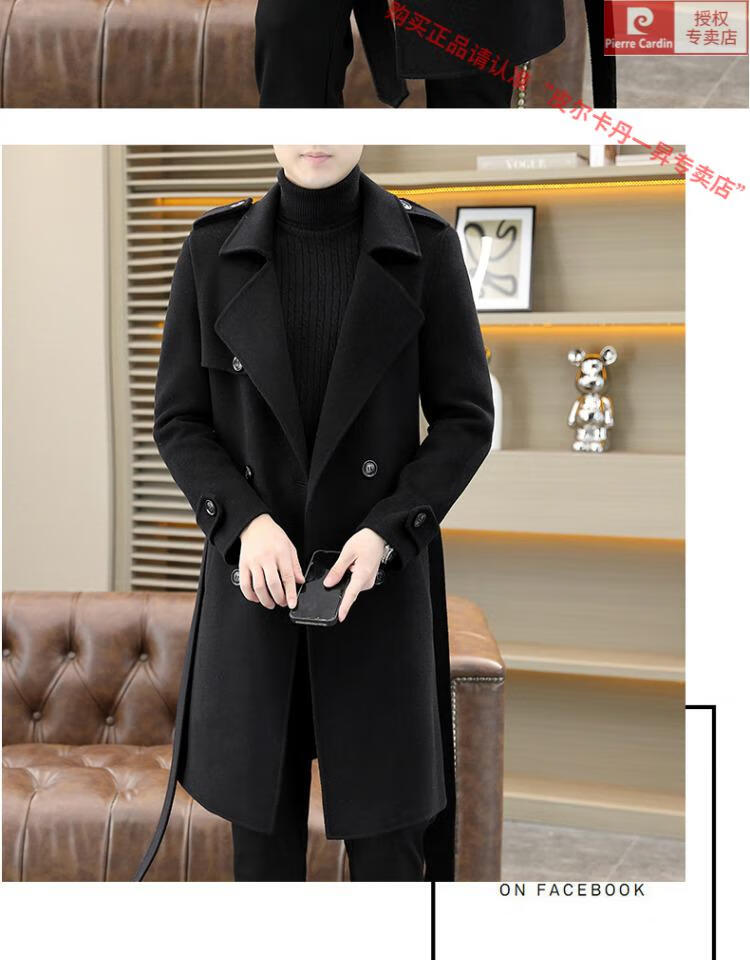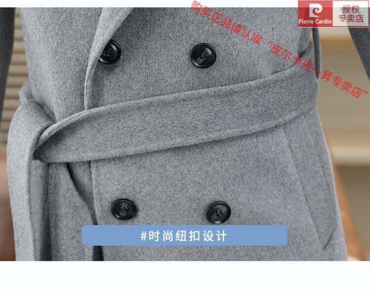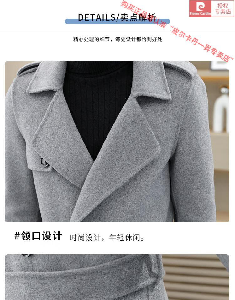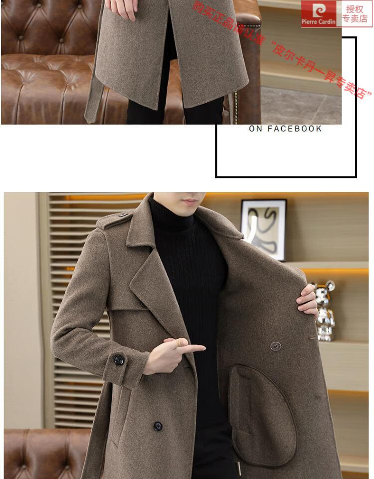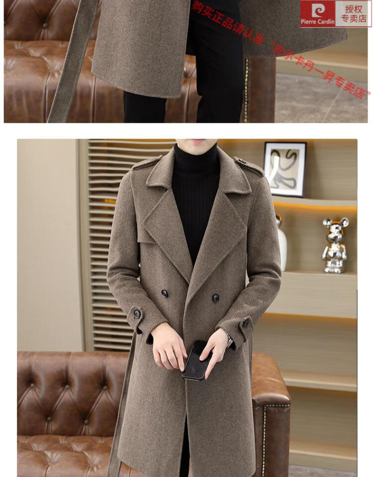 Pierre Cardin woolen woolen coat for men spring and autumn new high-end mid-length double-sided coat Korean style double-breasted woolen windbreaker 21006 Brown XL 180