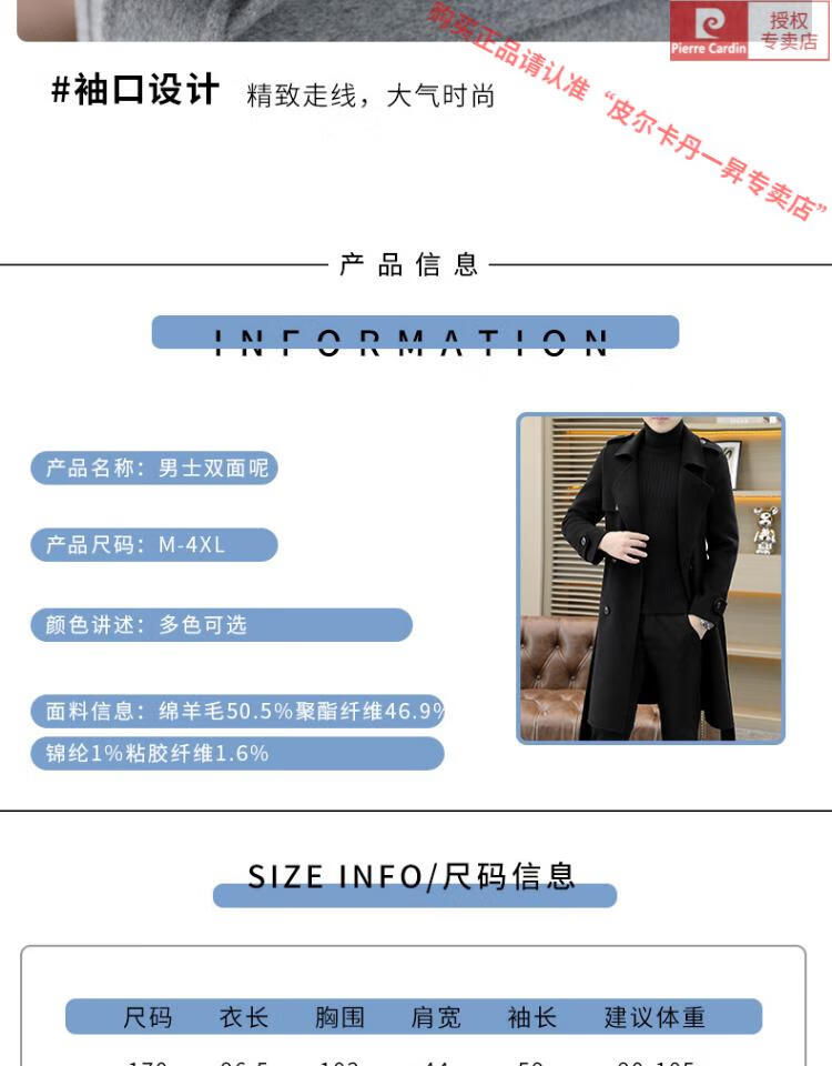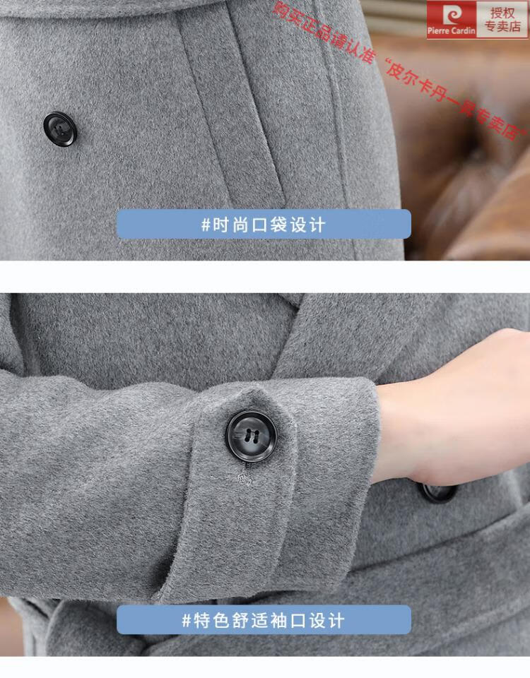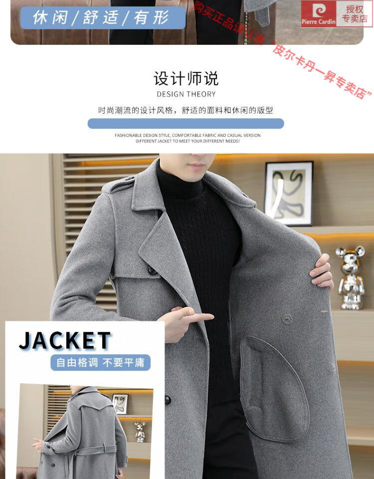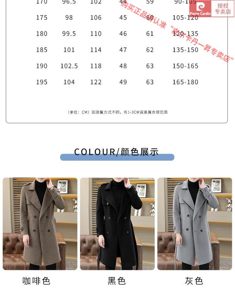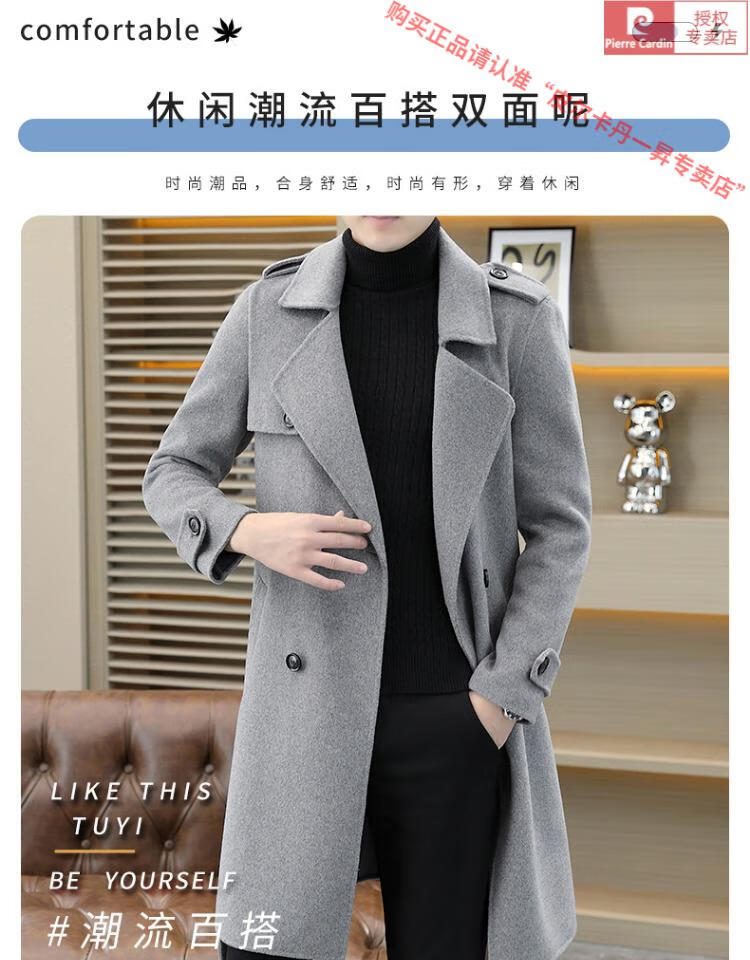 Pierre Cardin woolen woolen coat for men spring and autumn new high-end mid-length double-sided coat Korean style double-breasted woolen windbreaker 21006 Brown XL 180
