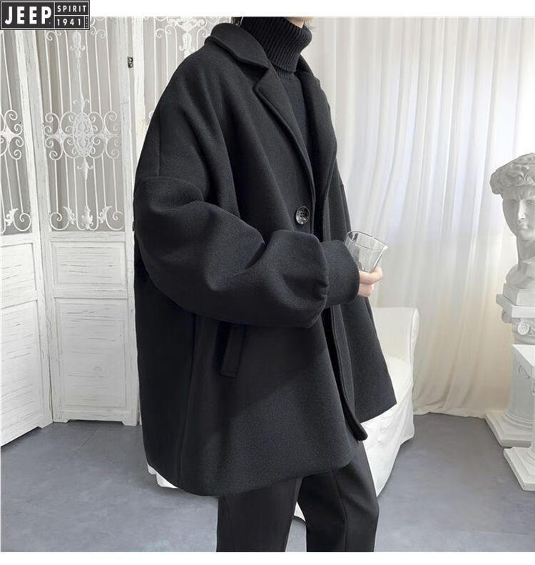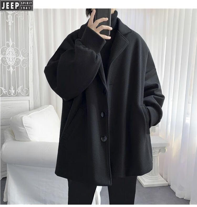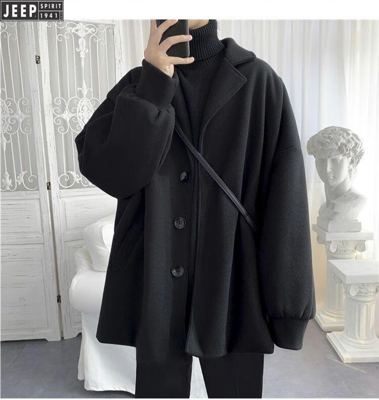 JEEP new autumn and winter new cotton and thick woolen coat short popular street black coat men's loose and handsome clothes black cotton and thick XL