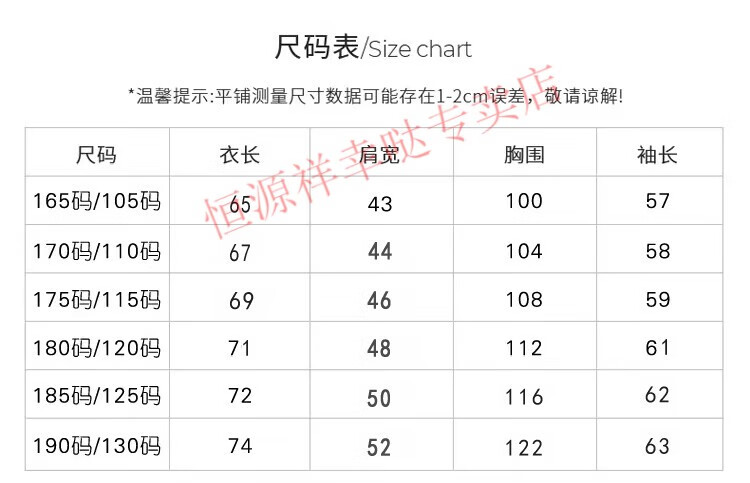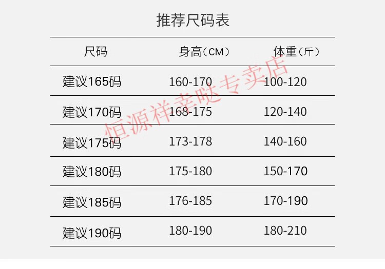 China (cm) 165 / 88-90 170 / 96-98 175 / 108-110 180 / 118-122 185 / 126-130