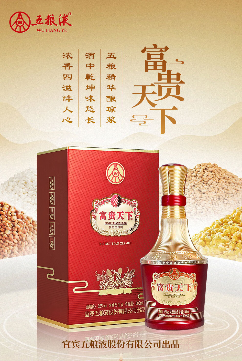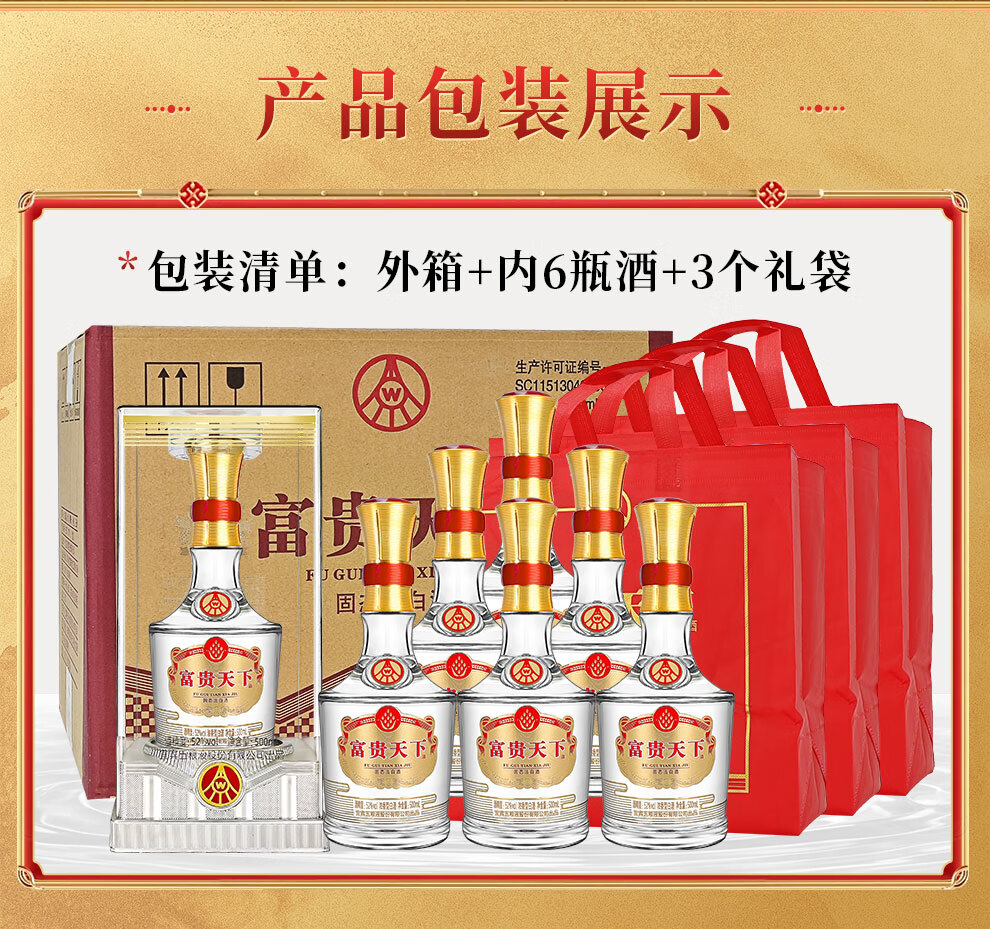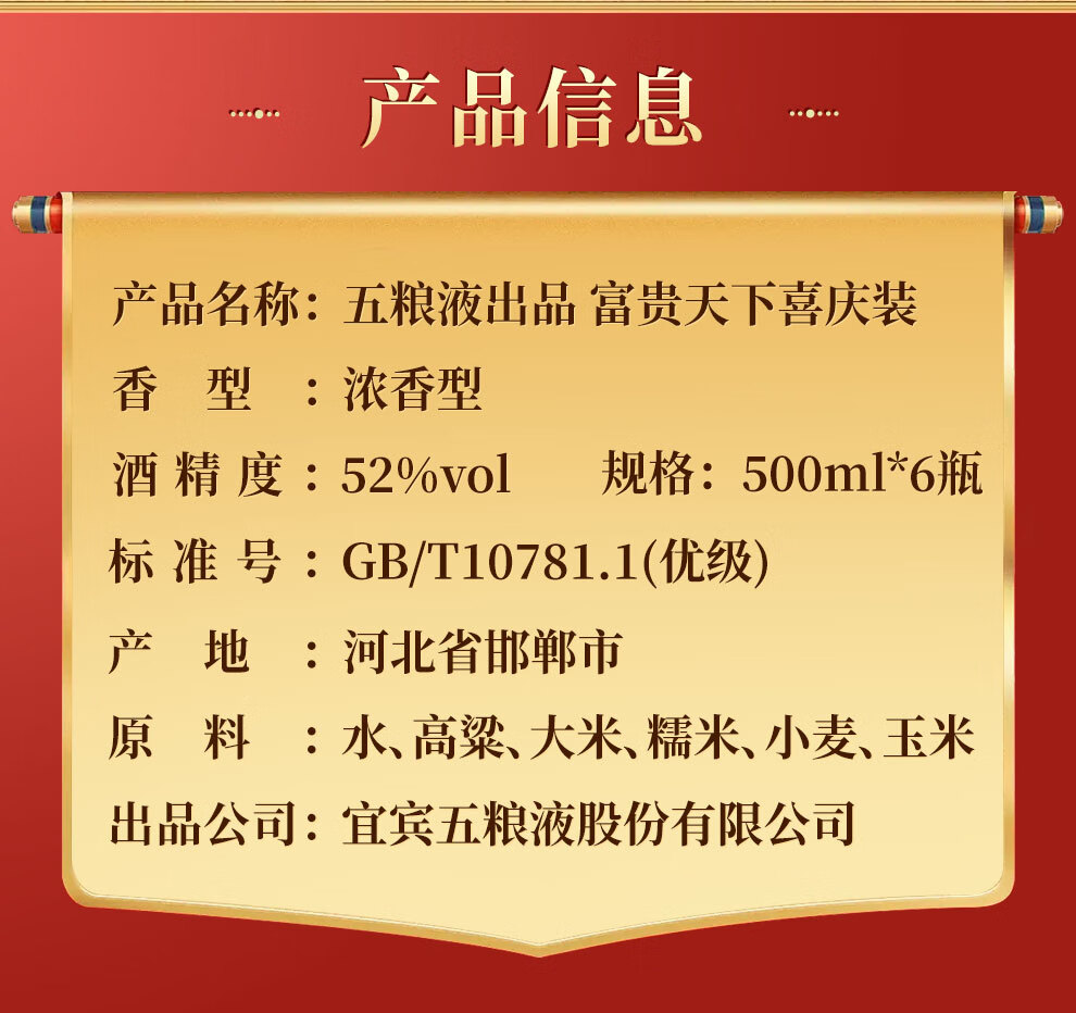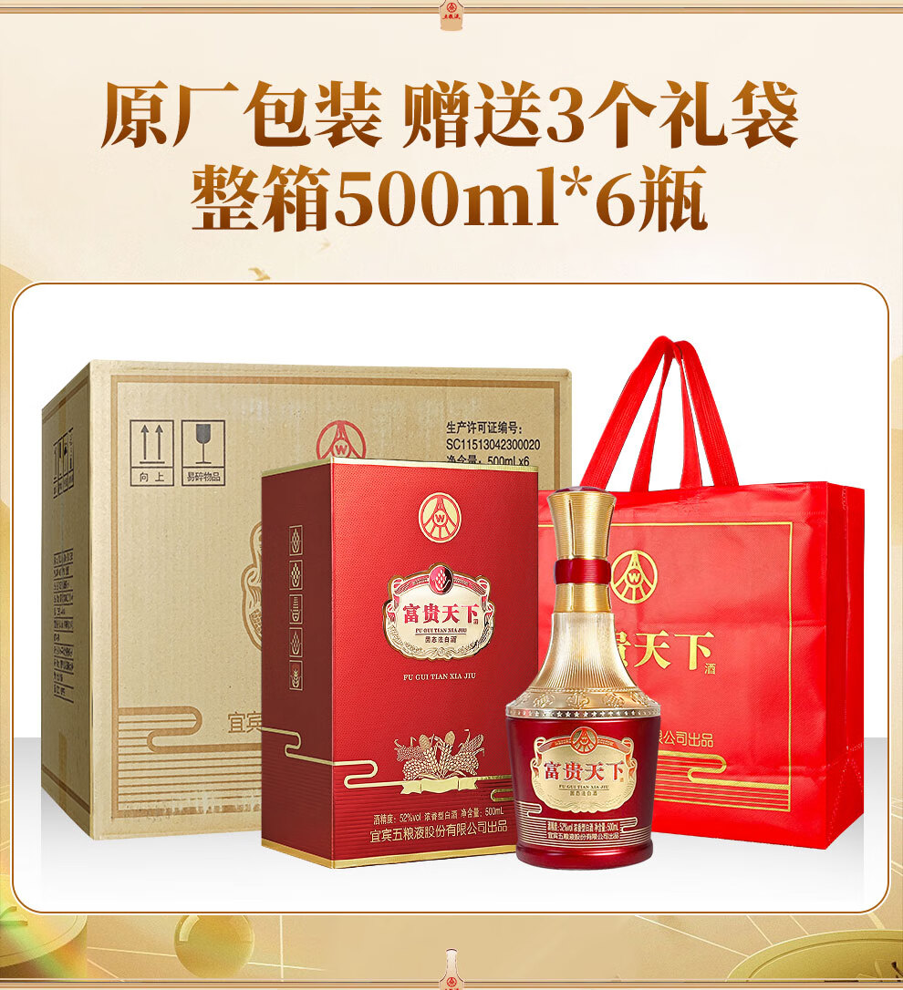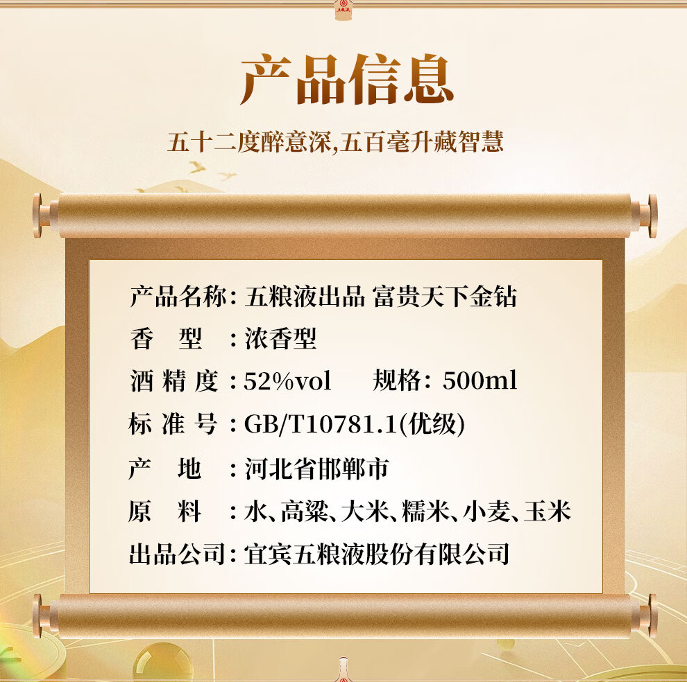 Produced by Wuliang Luzhou Wuliangye Co., Ltd. Liquor Luzhou-flavor grain wine, wedding banquet, holiday and New Year's gift, full box, 52 degrees, 500mL, 6 bottles, gold diamond, full box