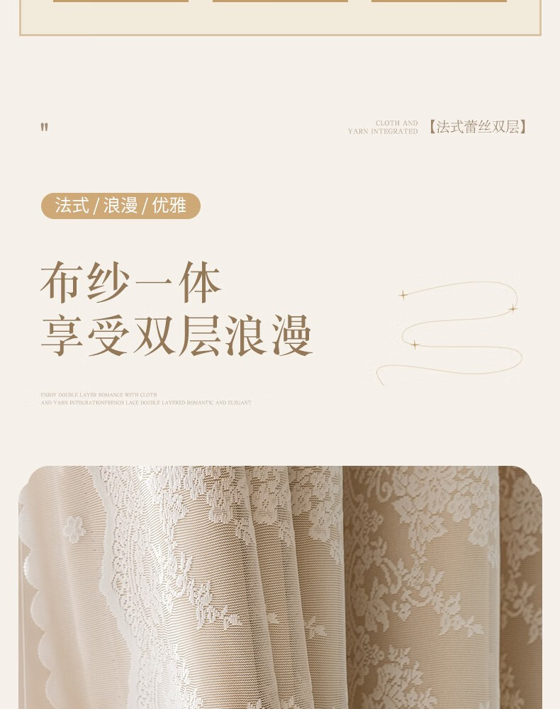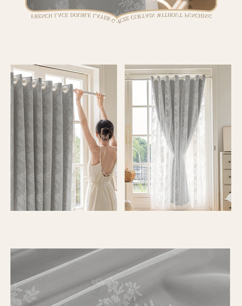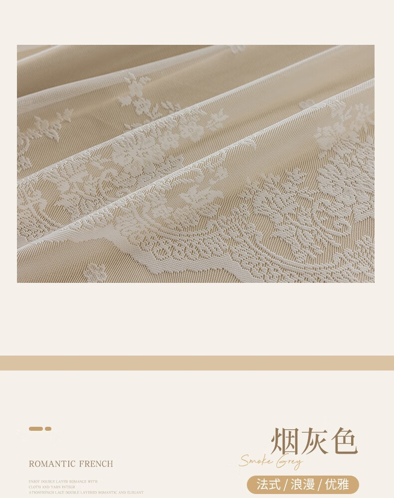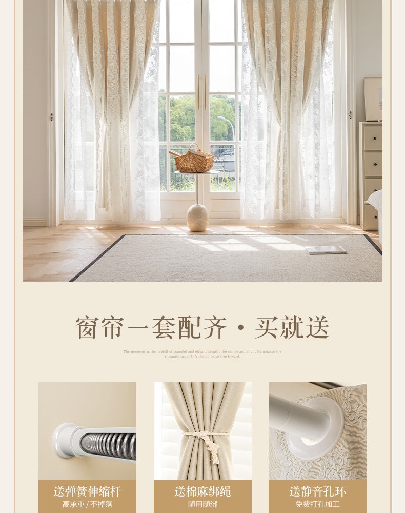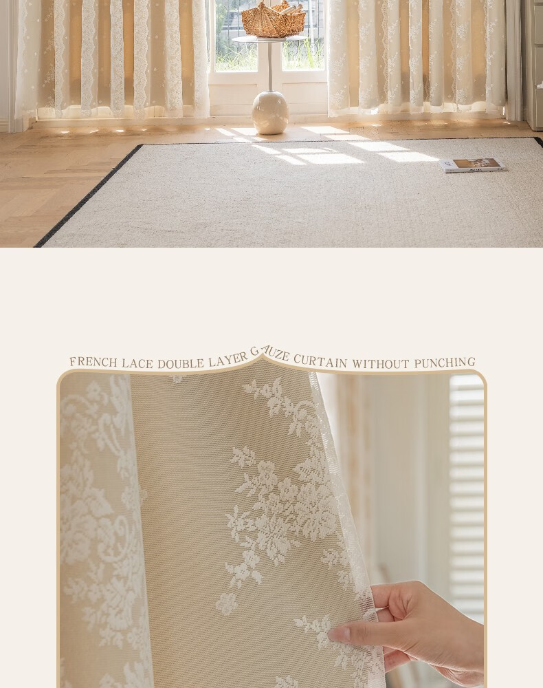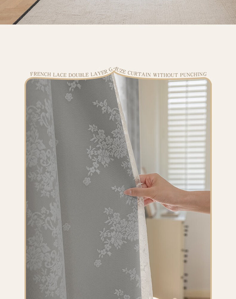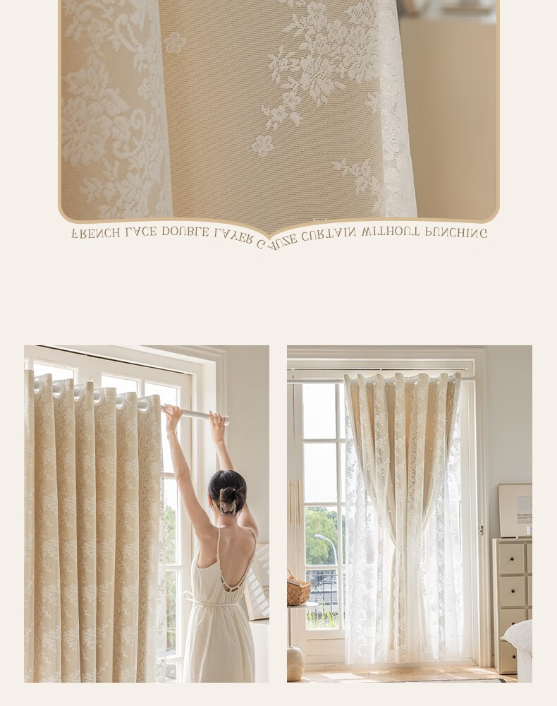 Jiafei (jiafei) Cloth+Pole French Curtain Blackout Lace Double Layer with Yarn Integrated No Punch Installation Girly Style Light Luxury Cloth Integrated - Milk Tea Color (Width 1.1-1.6m) (Height 1.5m 2 pieces including pole)