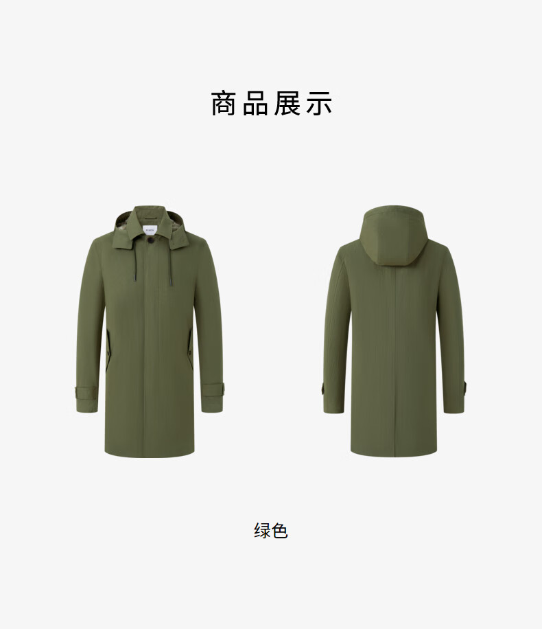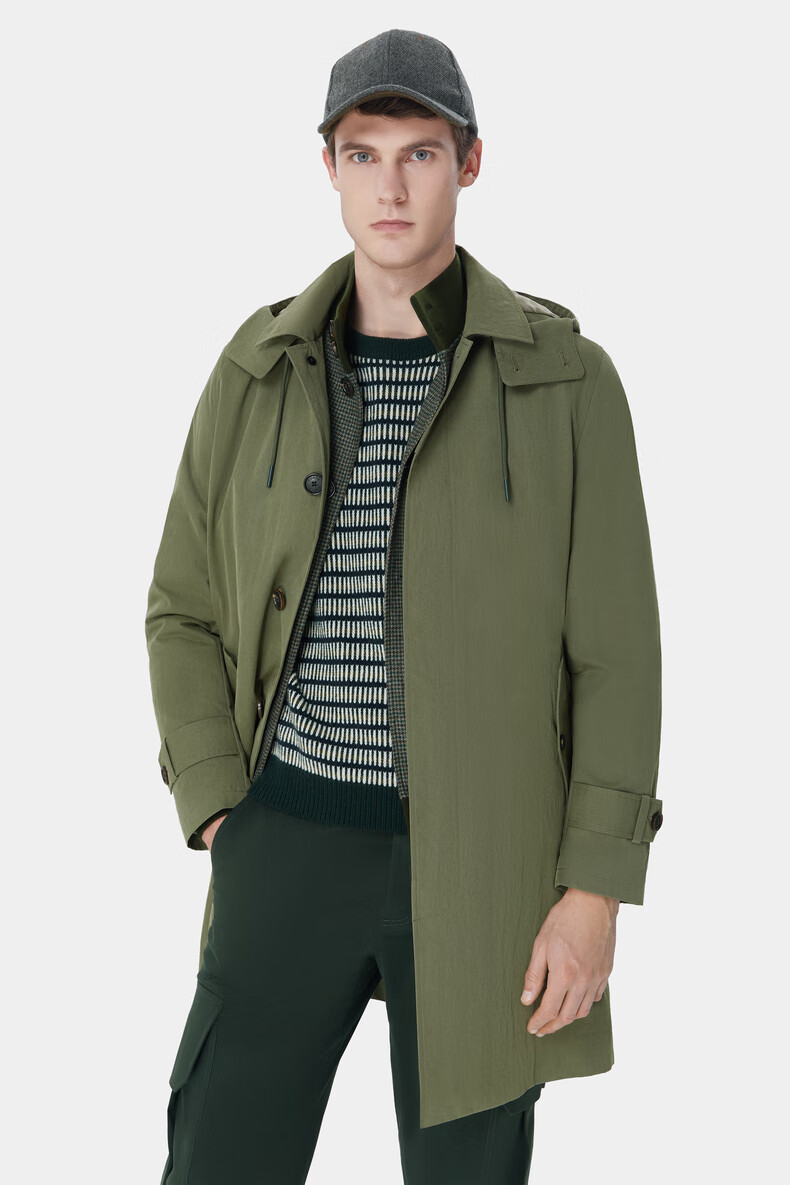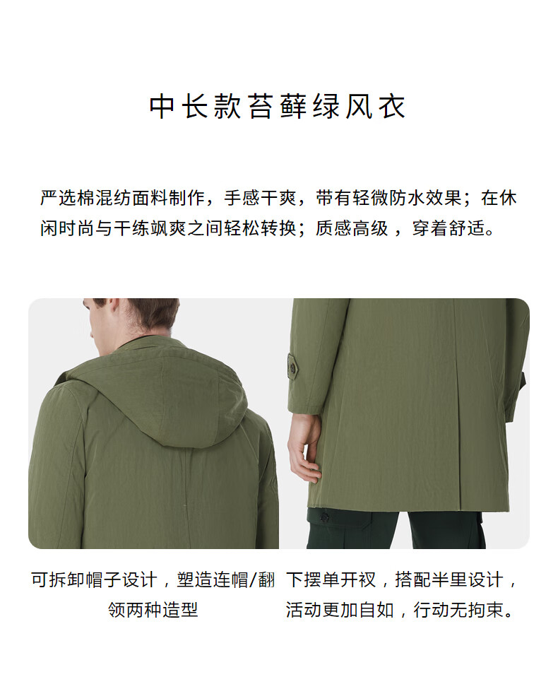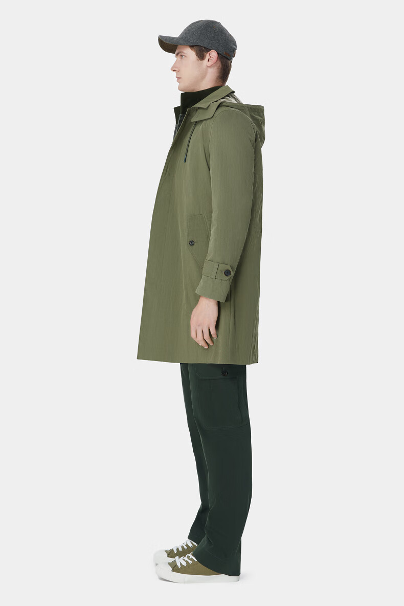 PORTS宝姿男装秋季棉混纺轻微防水可拆卸帽翻领合身长风衣 绿色 S