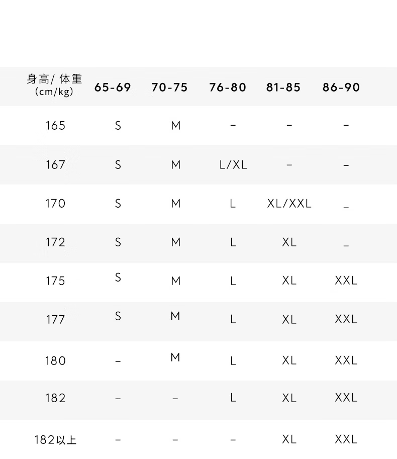 China (cm) 160-165/84-86 165-170 / 88-90 167-172 / 92-96 168-173 / 98-102 170-176 / 106-110